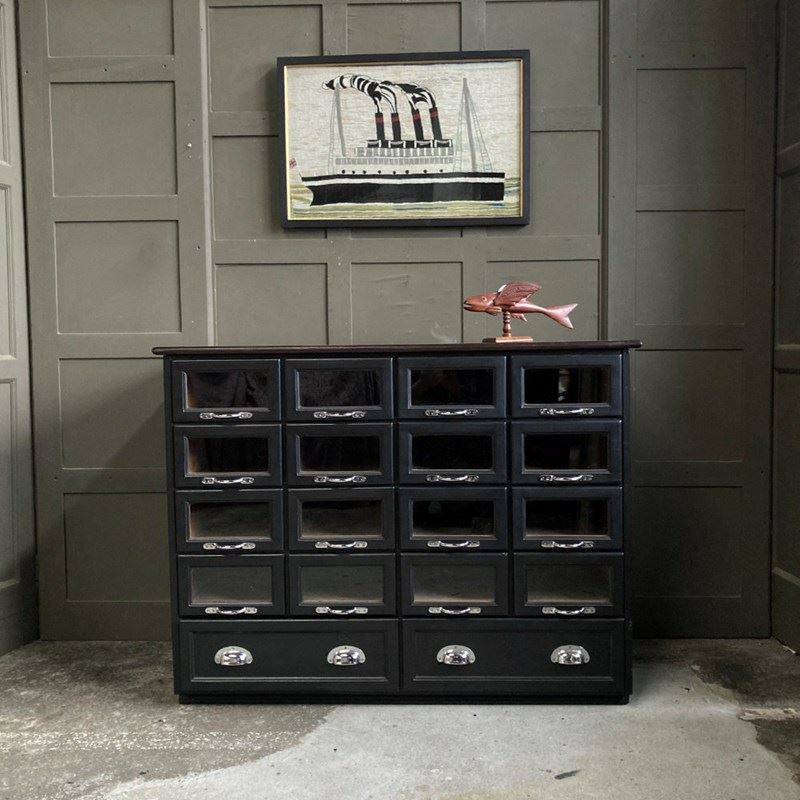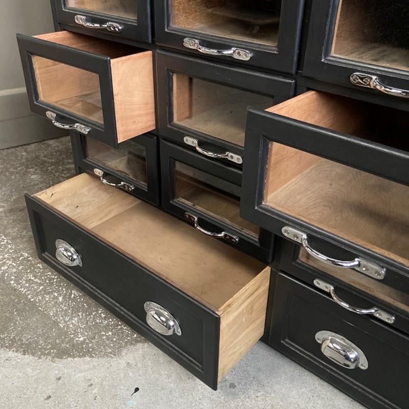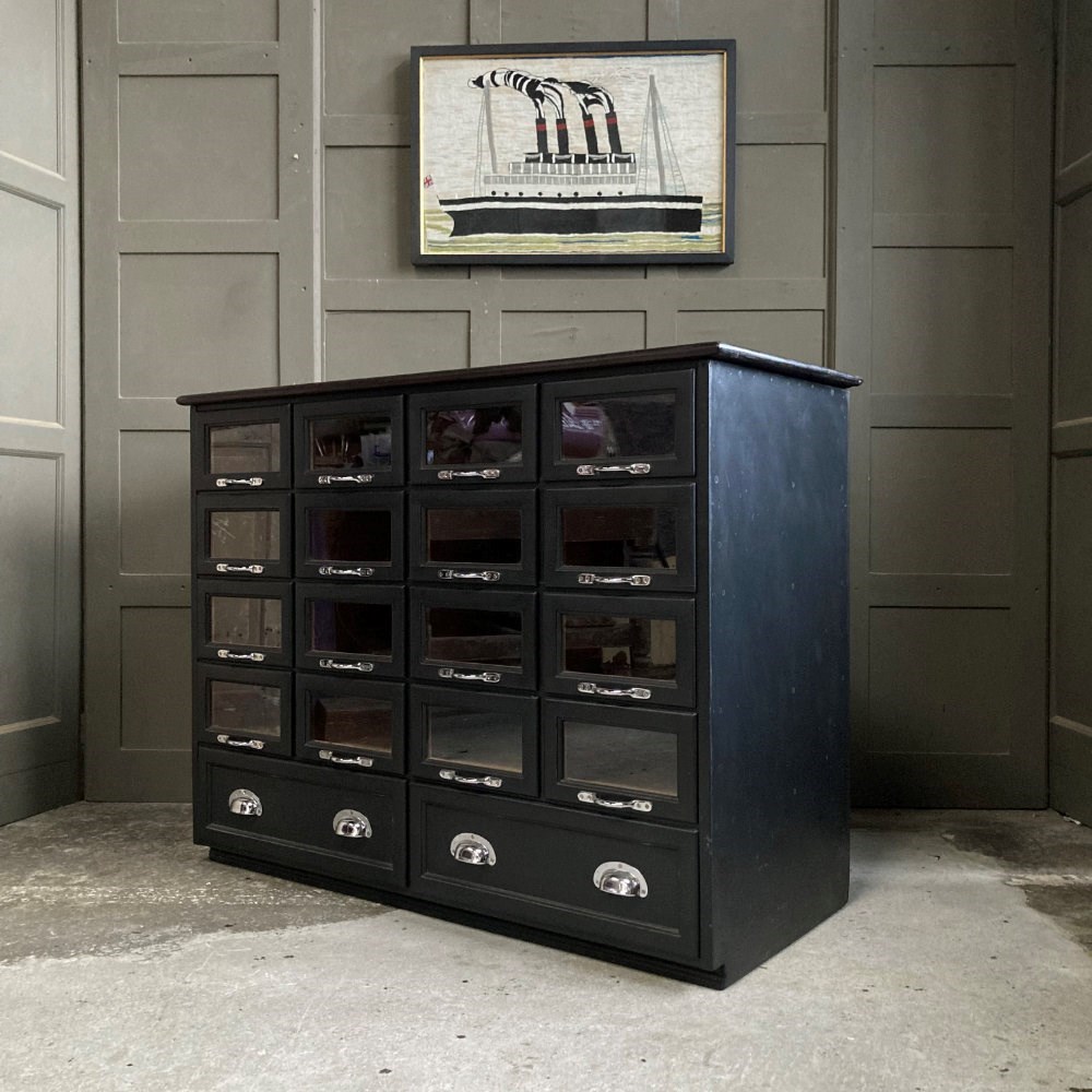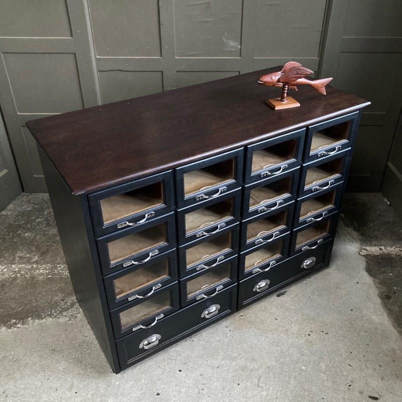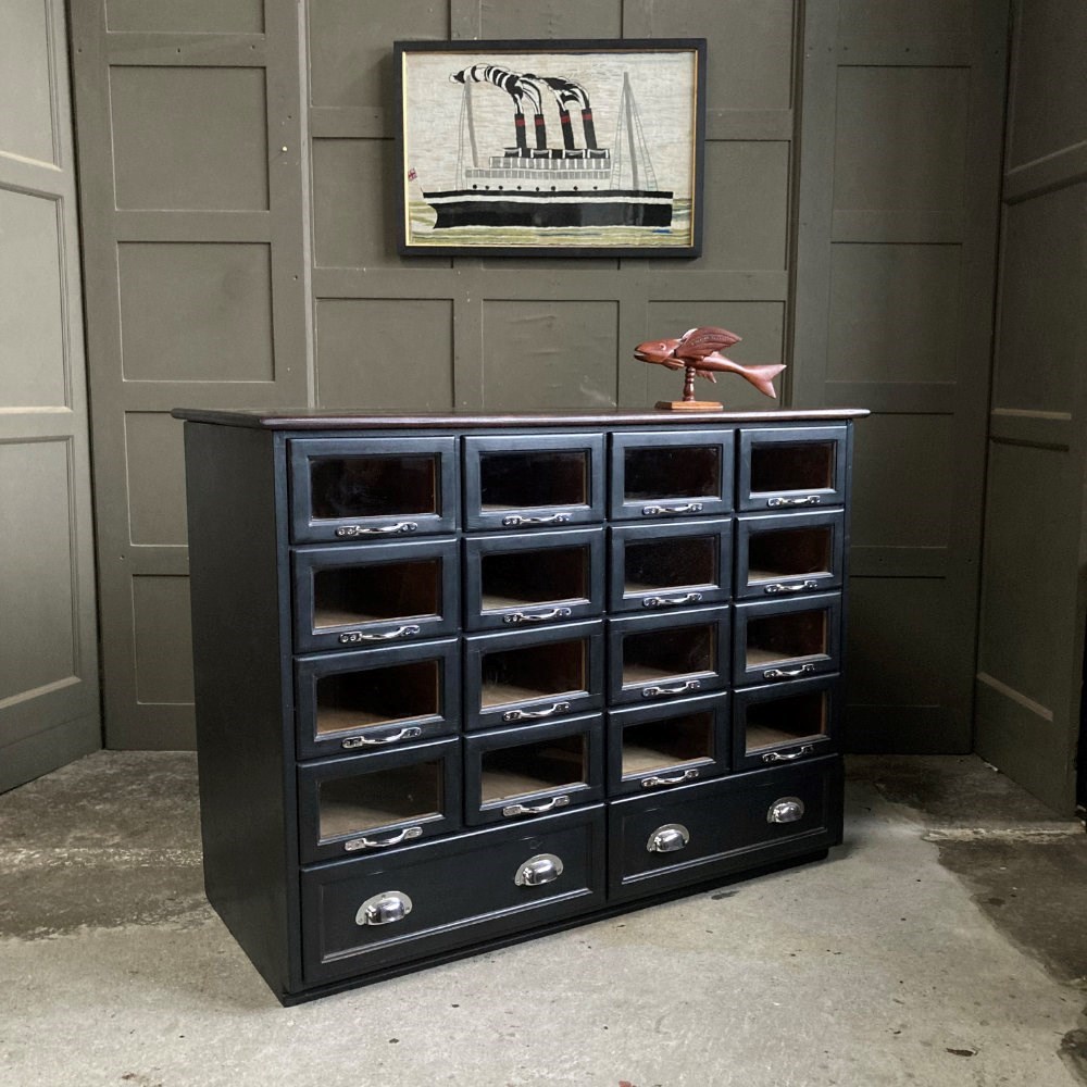 A large vintage haberdashery cabinet from a tailor's shop. Oak-fronted drawers with inset glass panels and chromium handles, with a polished mahogany top. Recently refurbished so in superb condition, and ready to use.
