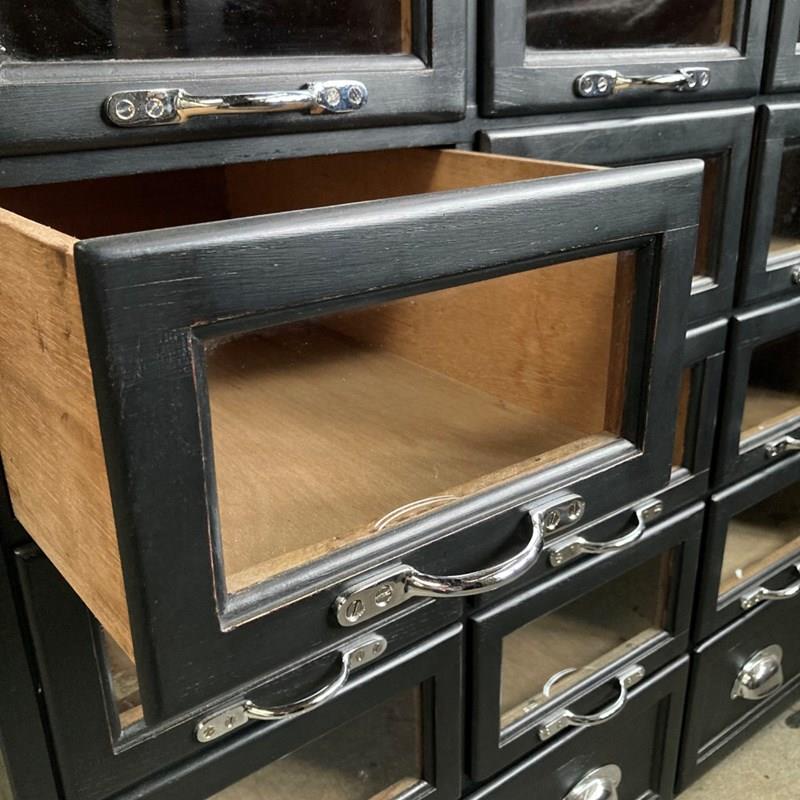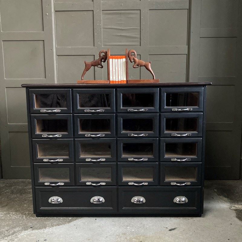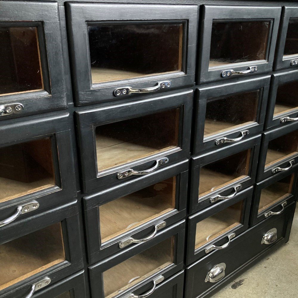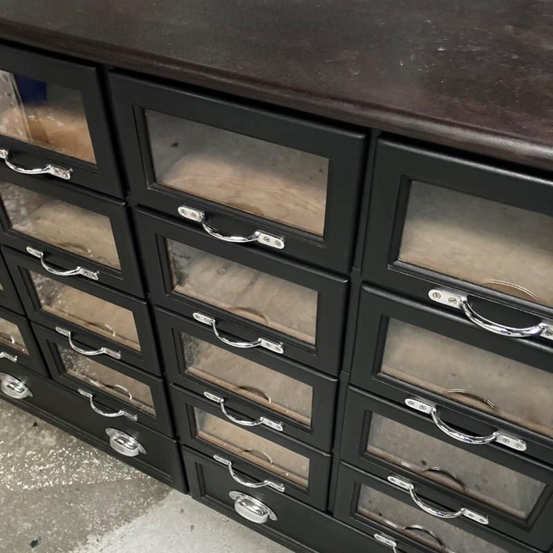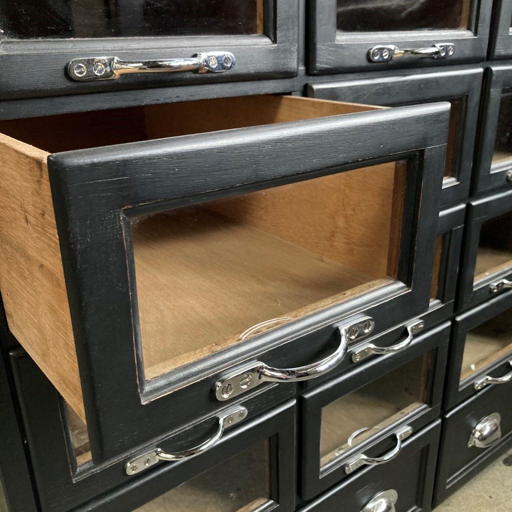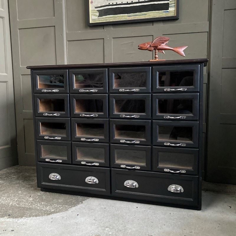A large vintage haberdashery cabinet from a tailor's shop. Oak-fronted drawers with inset glass panels and chromium handles, with a polished mahogany top. Recently refurbished so in superb condition, and ready to use.