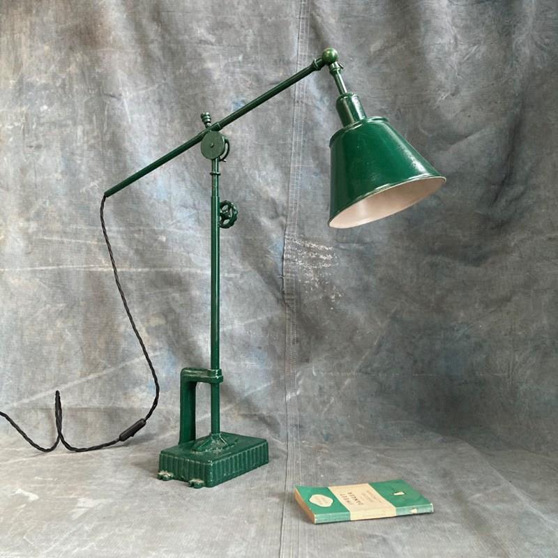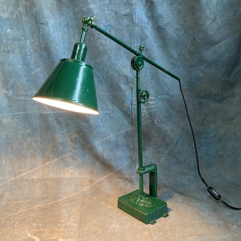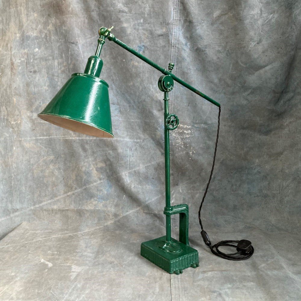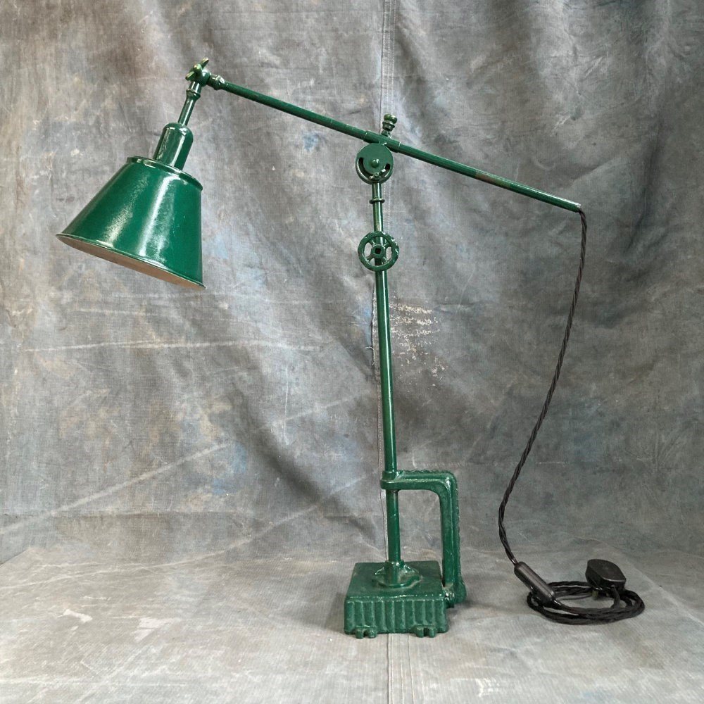 A rare industrial work lamp. We've never thought of a table lamp as folk art, but this certainly comes close. Most likely scratch-built by someone who was definitely an engineer. The way in which this lamp can be adjusted is marvellous. Allowance has been made for rise-and-fall, arm reach, and 'tilt' from two different points. A remarkable lamp, with sculptural qualities. It has been fully restored, and rewired.