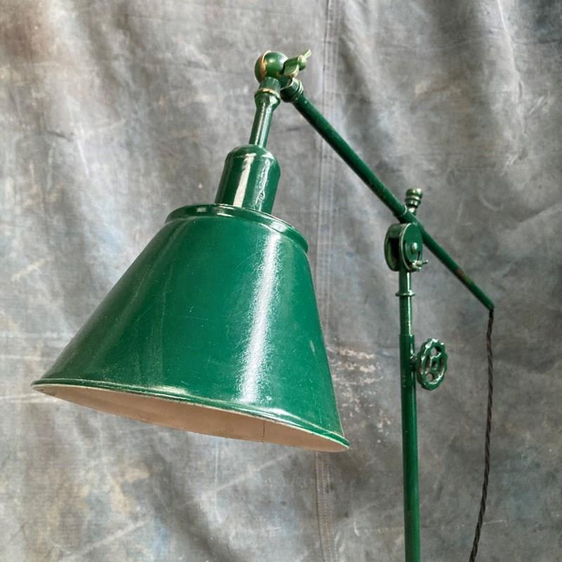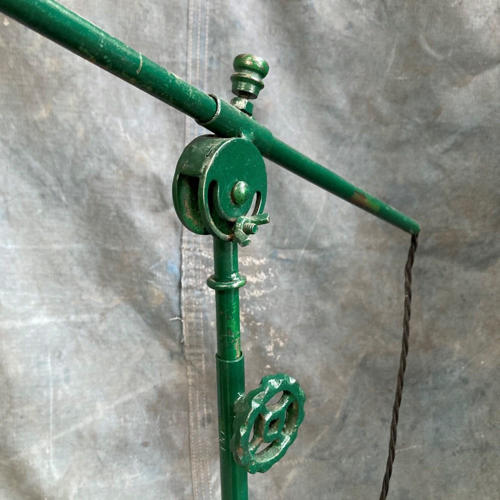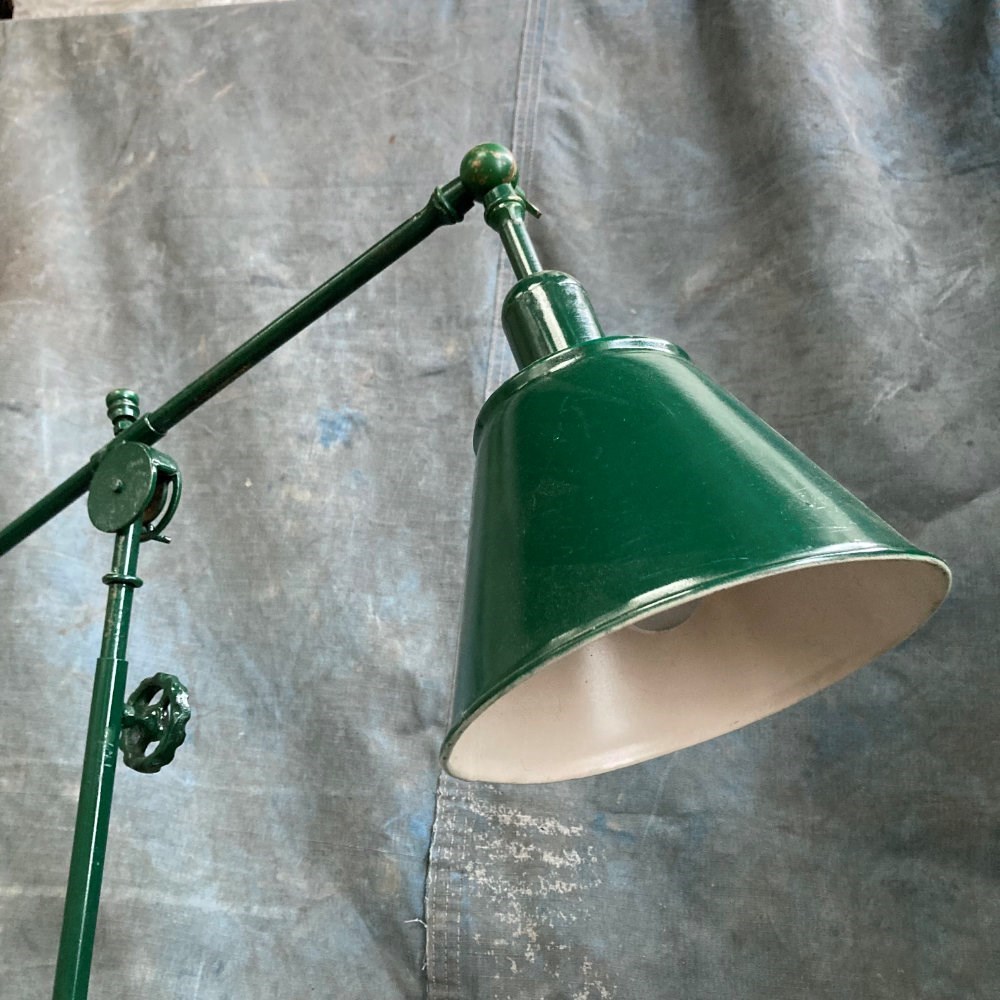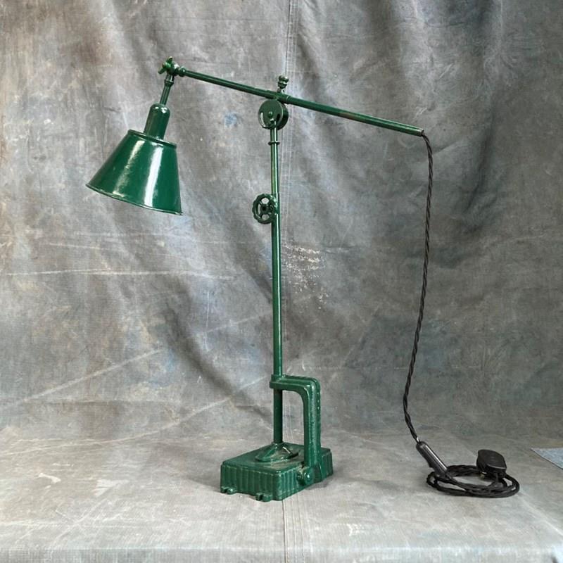A rare industrial work lamp. We've never thought of a table lamp as folk art, but this certainly comes close. Most likely scratch-built by someone who was definitely an engineer. The way in which this lamp can be adjusted is marvellous. Allowance has been made for rise-and-fall, arm reach, and 'tilt' from two different points. A remarkable lamp, with sculptural qualities. It has been fully restored, and rewired.