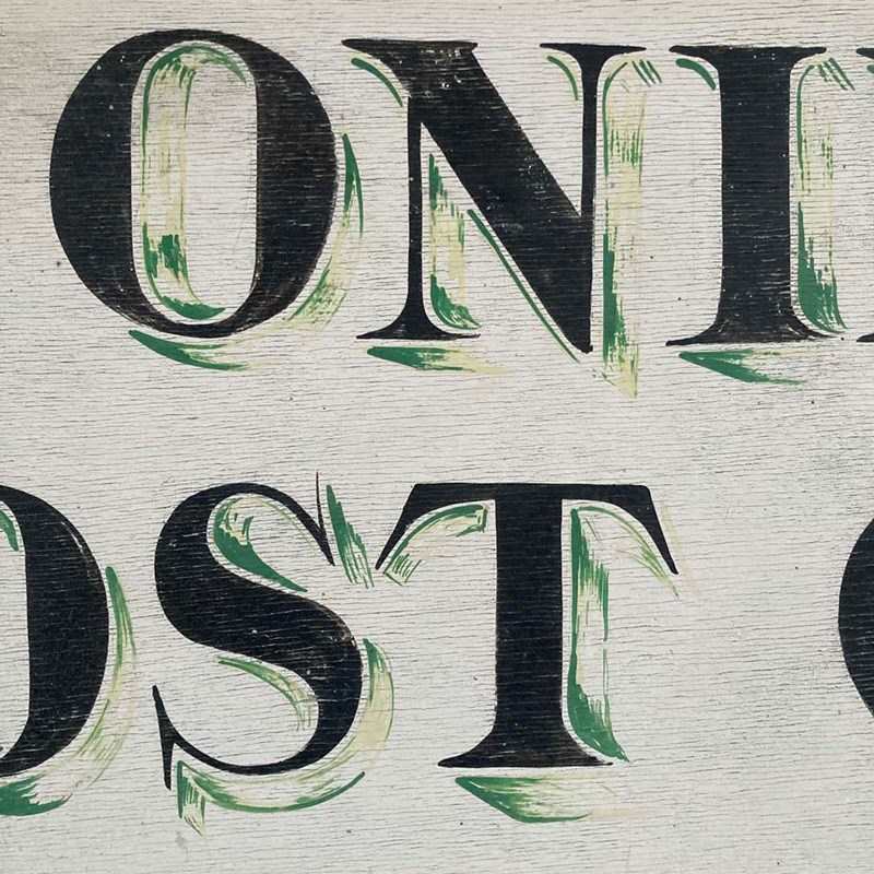 An early 20th century signwritten trade sign for Donington Post Office, Lincolnshire. Plywood panel with original hand-painted surface. Nice decorative item. (UK shipping £20)