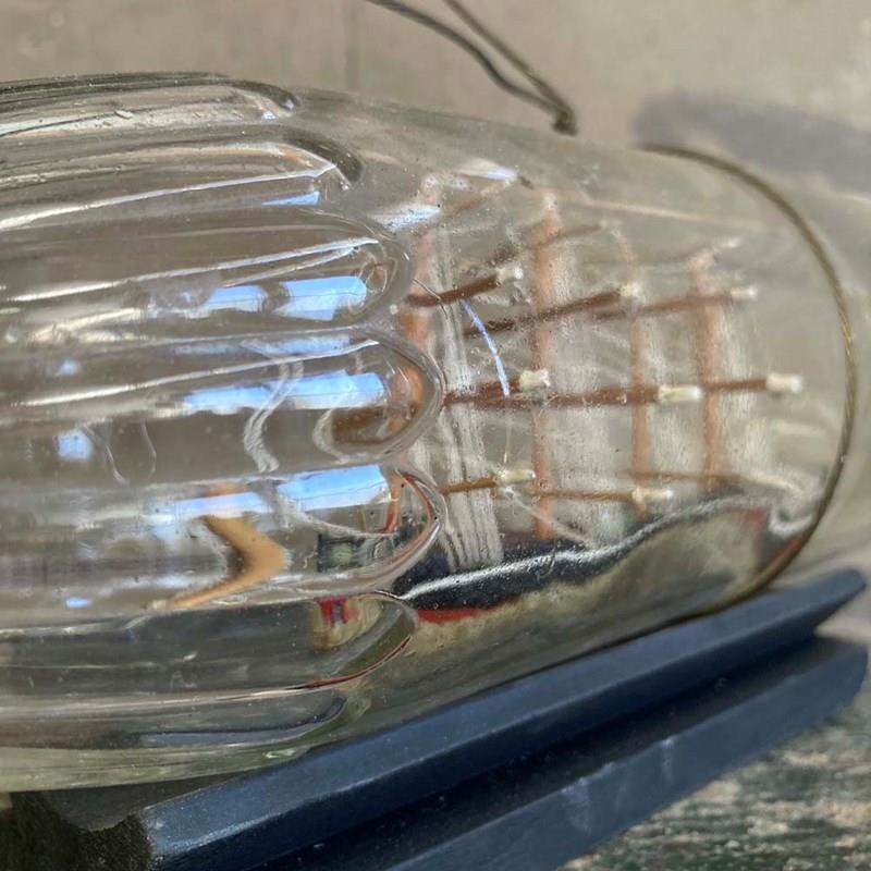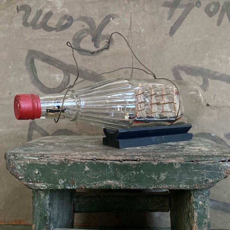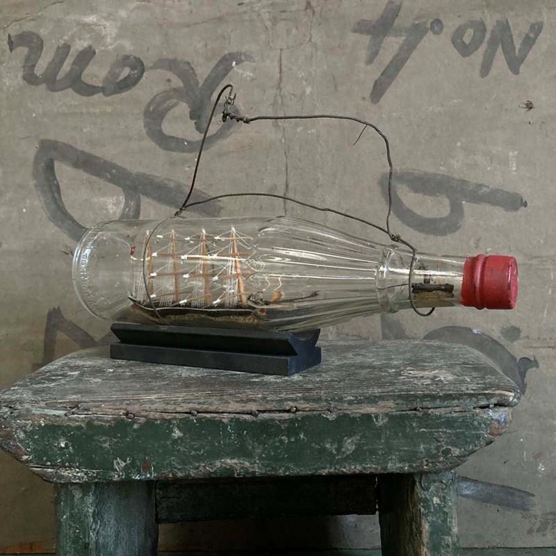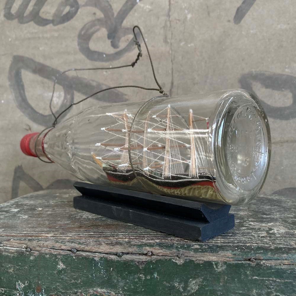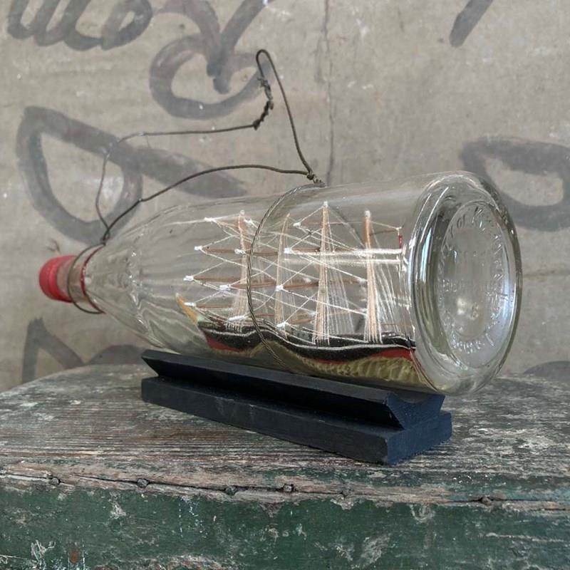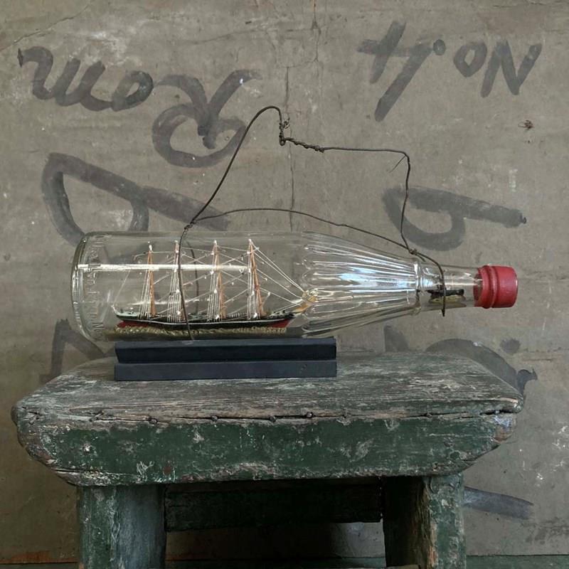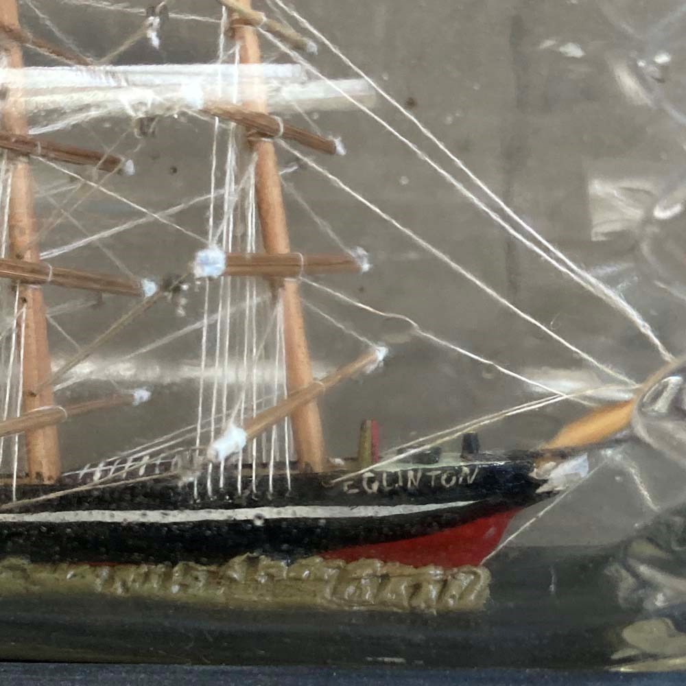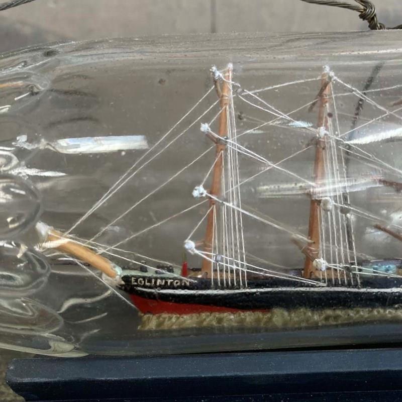 A scratch built wooden model of a four-masted ship called 'Eglington', being towed by a little steam tug. The diorama is set within an old Kia-Ora bottle. It comes with a display stand, but we have also left the historic naively-made hanging wire attached. A lovely folk art example.