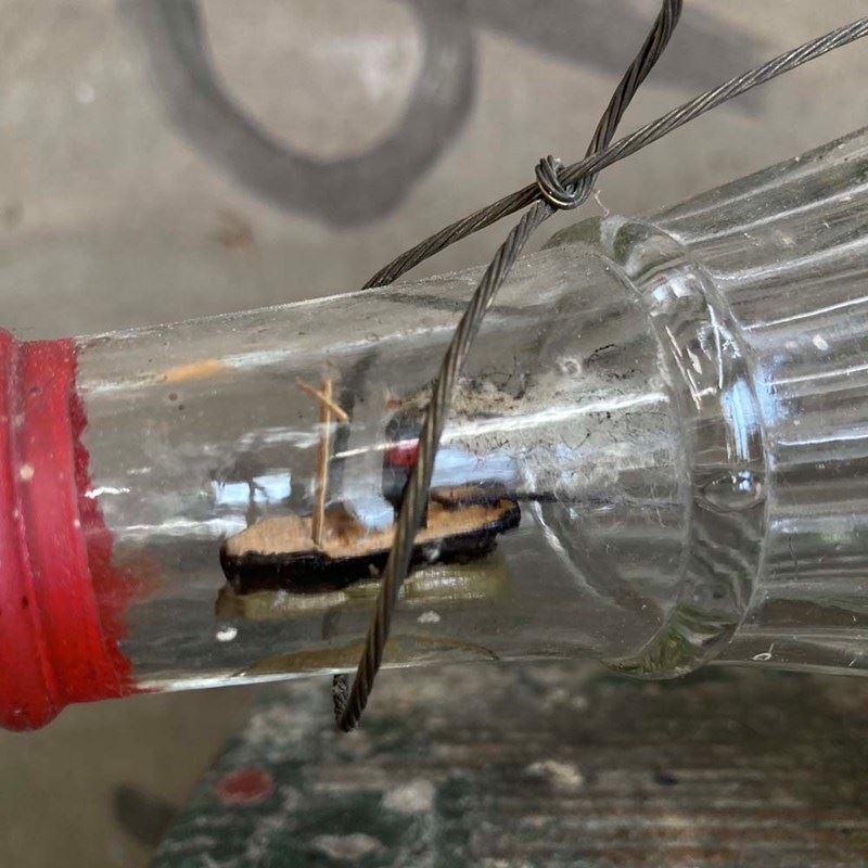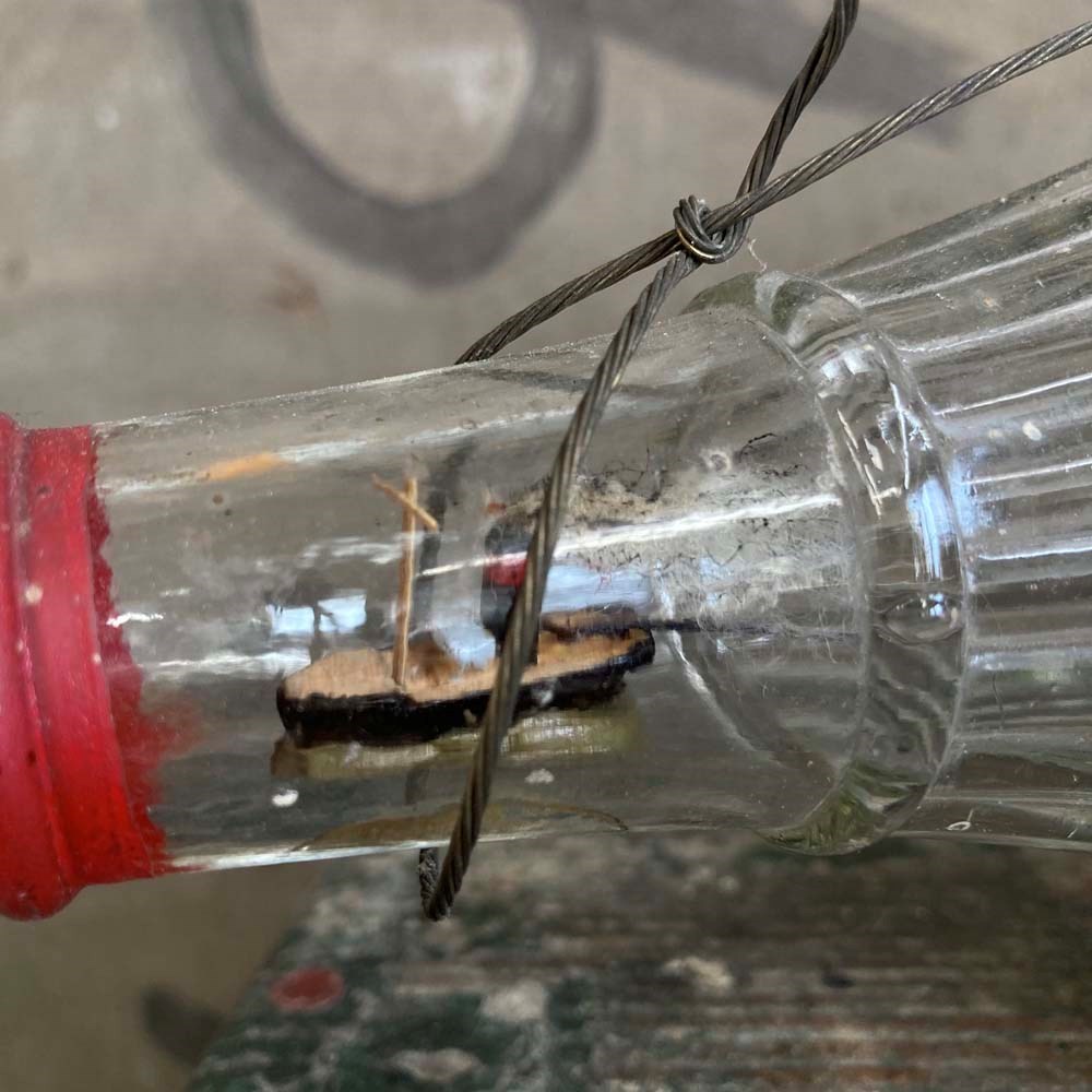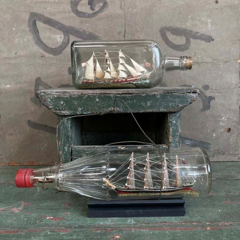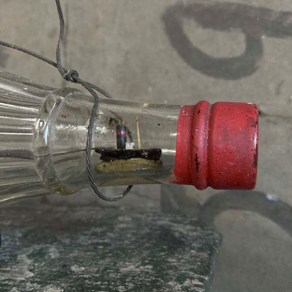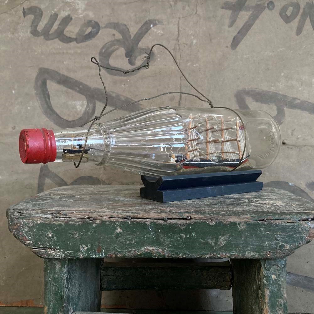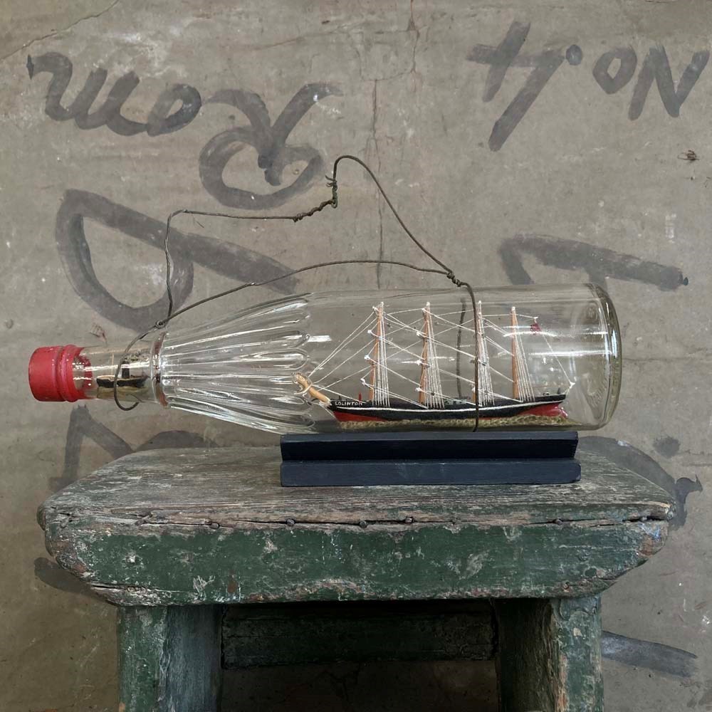 A scratch built wooden model of a four-masted ship called 'Eglington', being towed by a little steam tug. The diorama is set within an old Kia-Ora bottle. It comes with a display stand, but we have also left the historic naively-made hanging wire attached. A lovely folk art example.