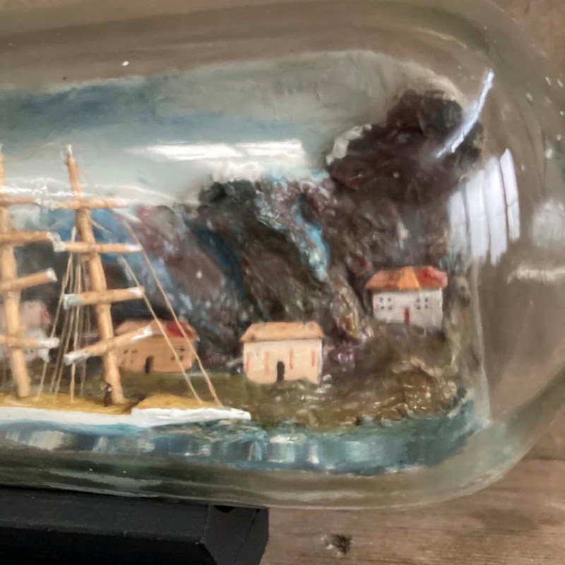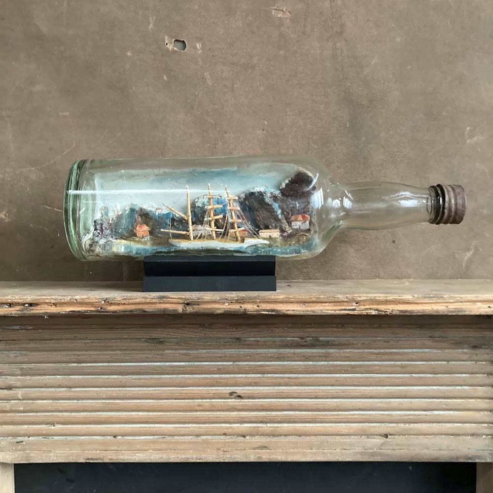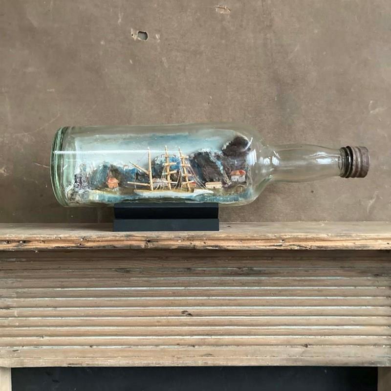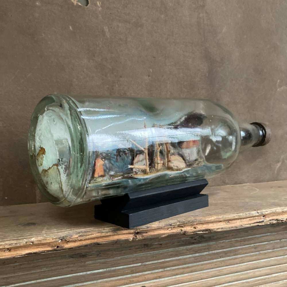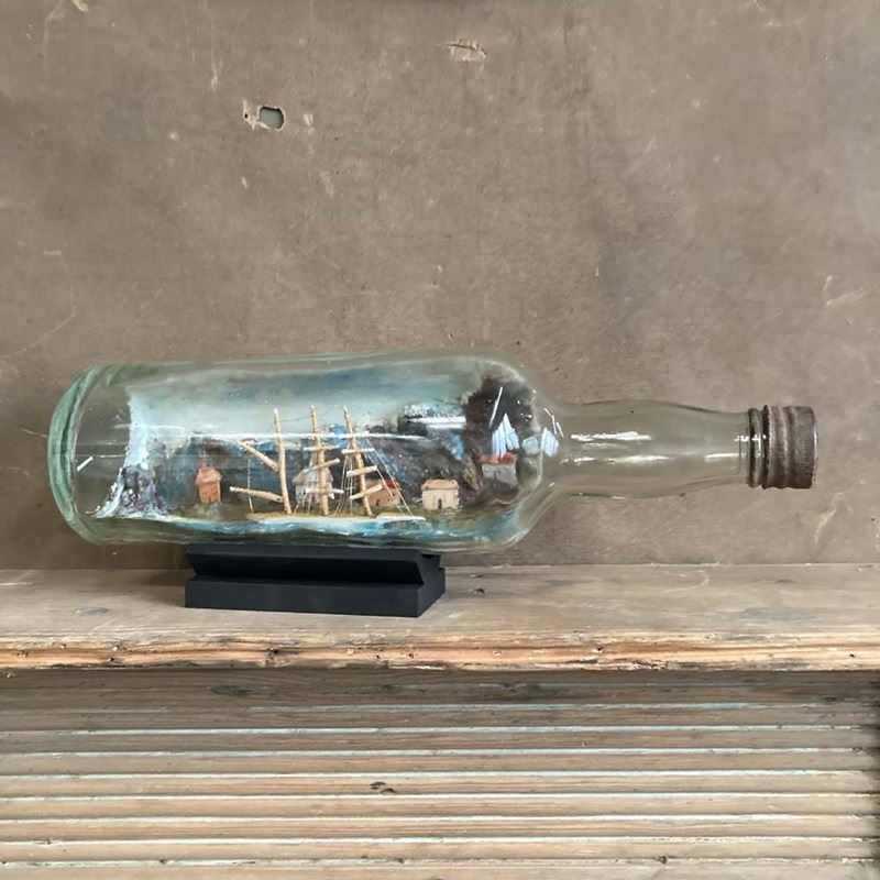 A vintage folk art ship-in-a-bottle. Comes with stand. (UK shipping £5)