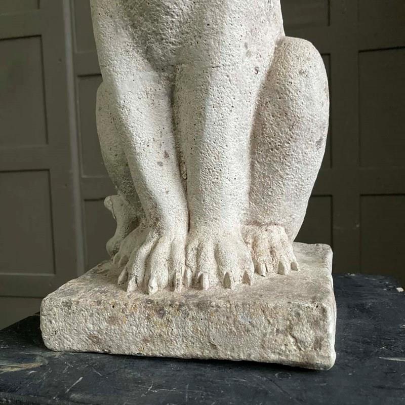A large reconstituted stone cat statue with remnants of weathered paintwork.