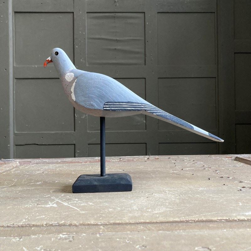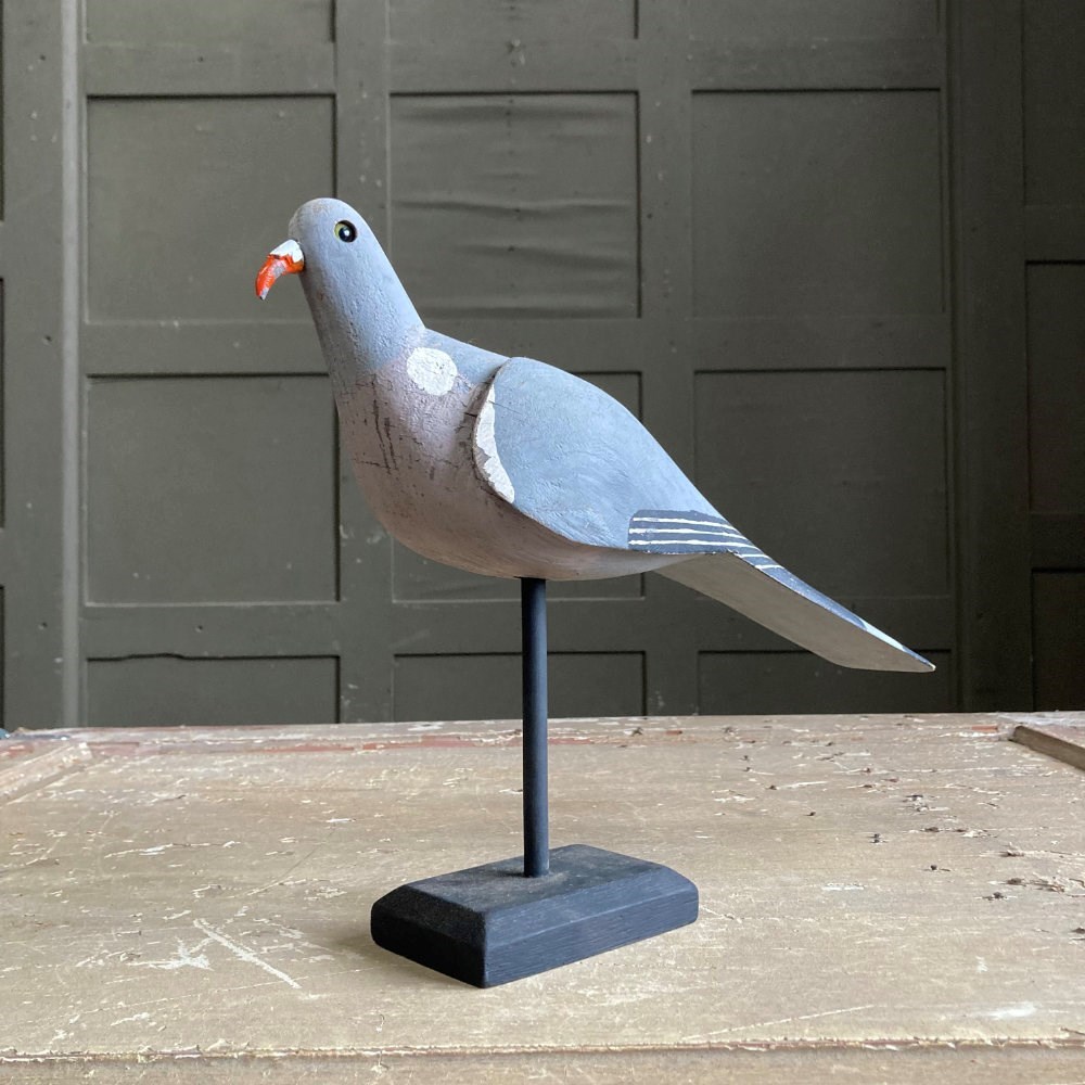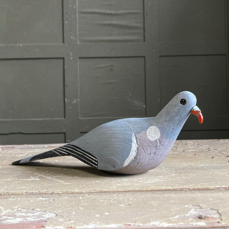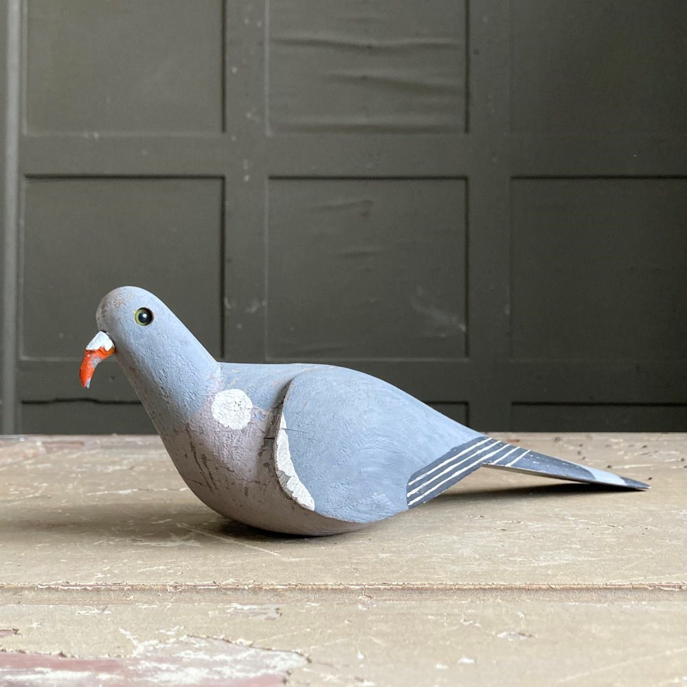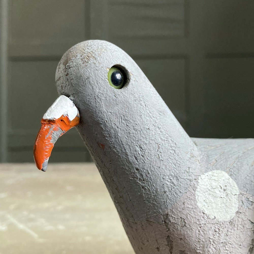 A beautiful carved wood pigeon decoy in what looks like 'unused' condition. Original paint finish, cast metal beak, and glass eyes.