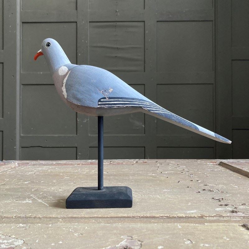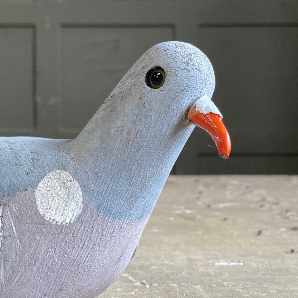 A beautiful carved wood pigeon decoy in what looks like 'unused' condition. Original paint finish, cast metal beak, and glass eyes.