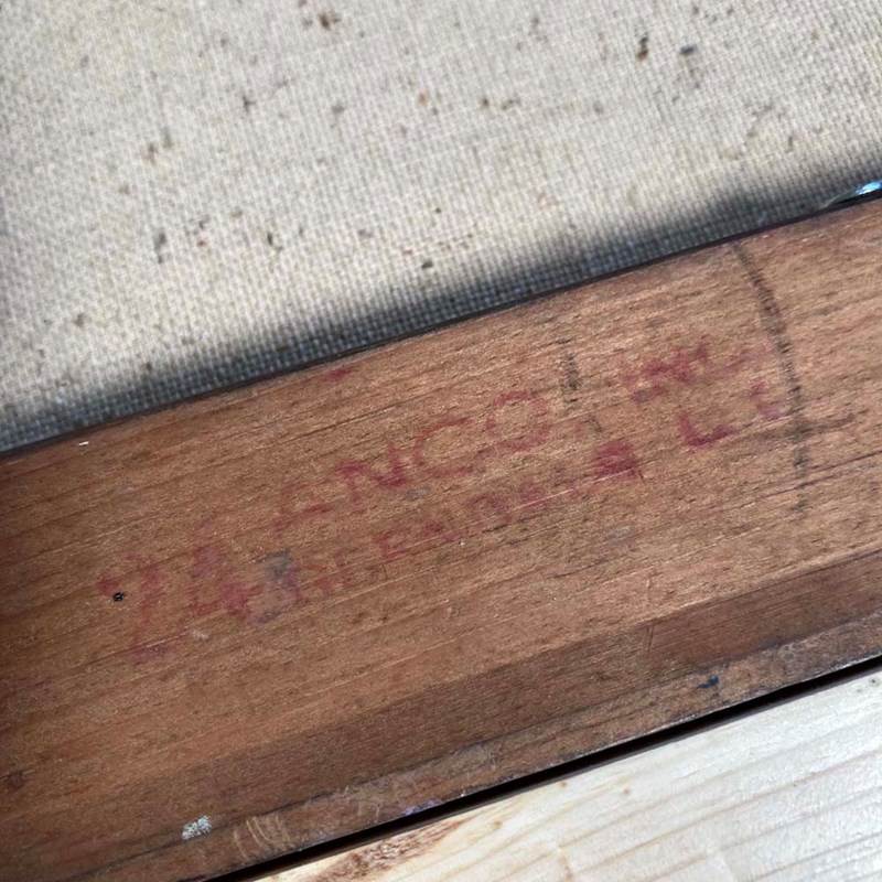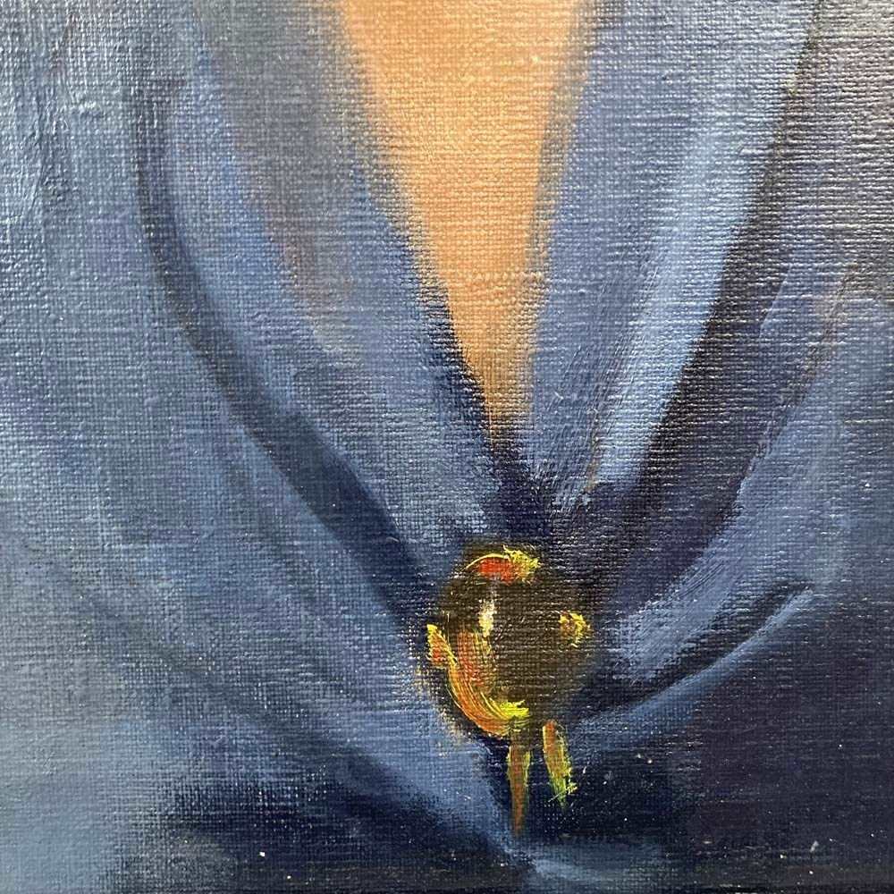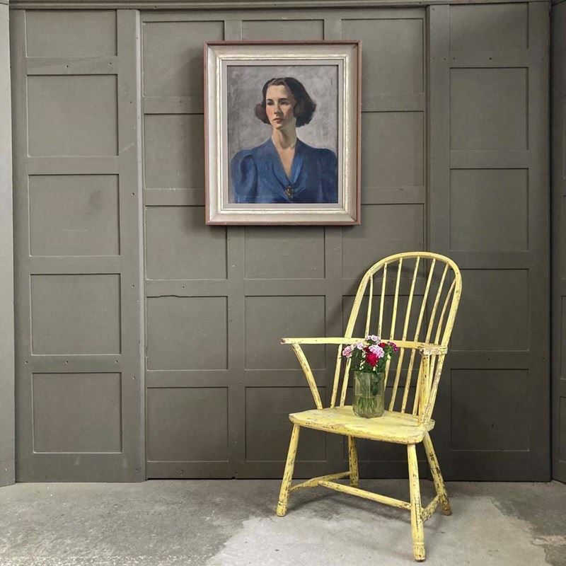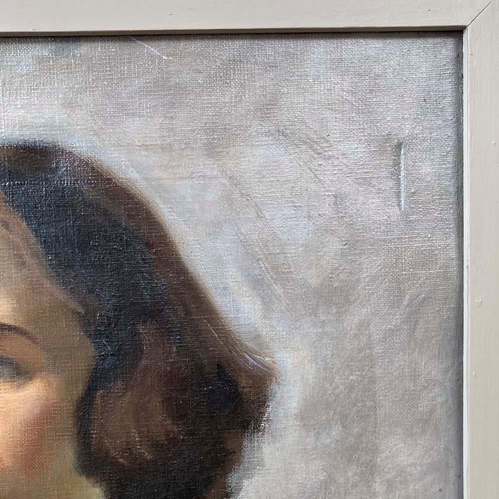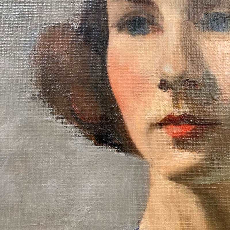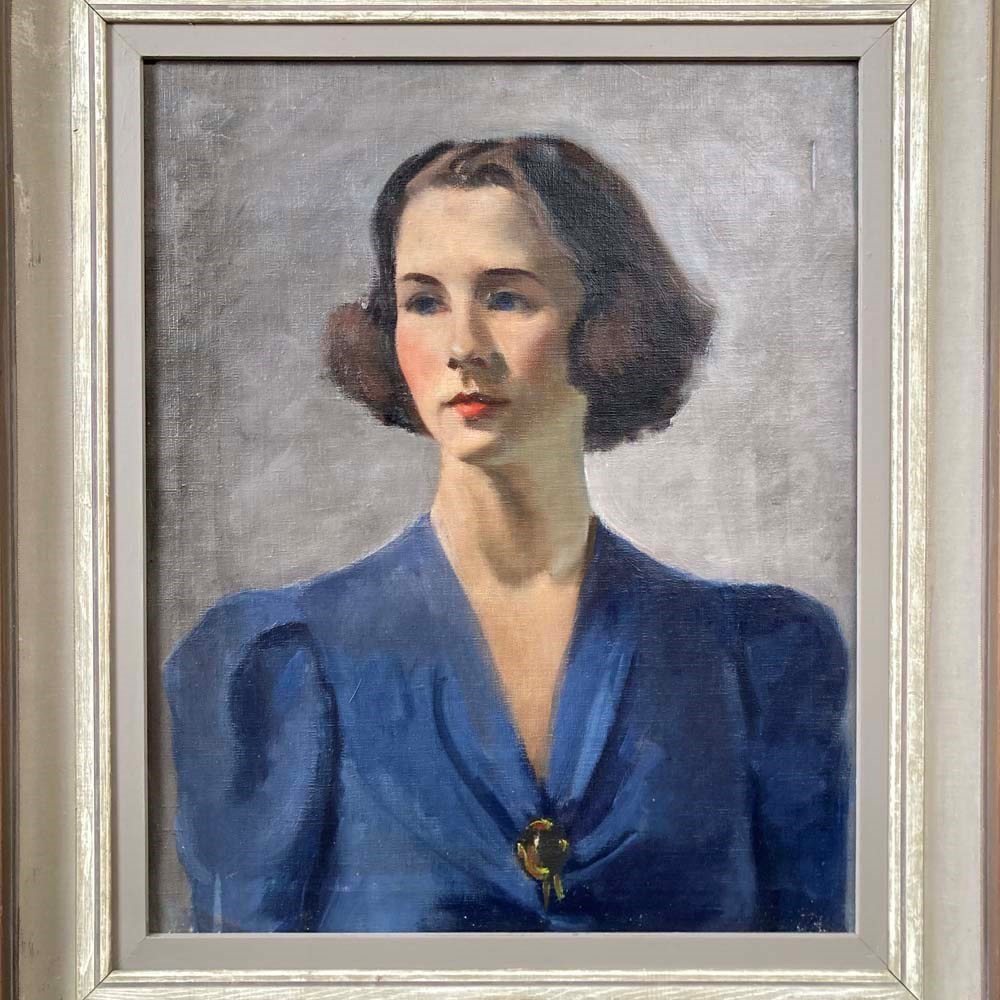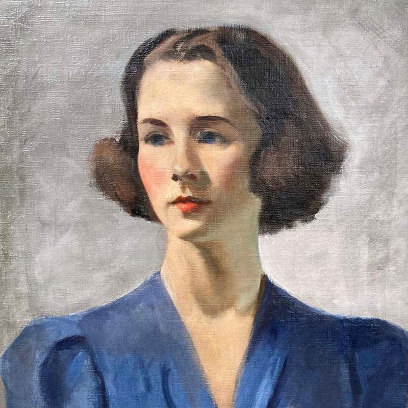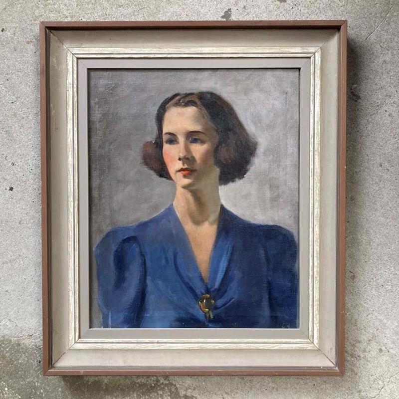 A bold mid 20th century oil on canvas portrait of a young woman by Virginia Goldberg (1914-2011). The painting has great presence, with its large area of strong blue contrasting with the bright red of the woman's lipstick. Although not dated, the style of the sitter's dress would suggest late 1930s/early 40s. A great decorative piece for an interior. Signed to reverse 'V. Goldberg'. Small dent to canvas surface in top right corner. Canvas stretcher at the back of painting has manufacturer stamp for 'ANCO Inc' of Glendale, NY.