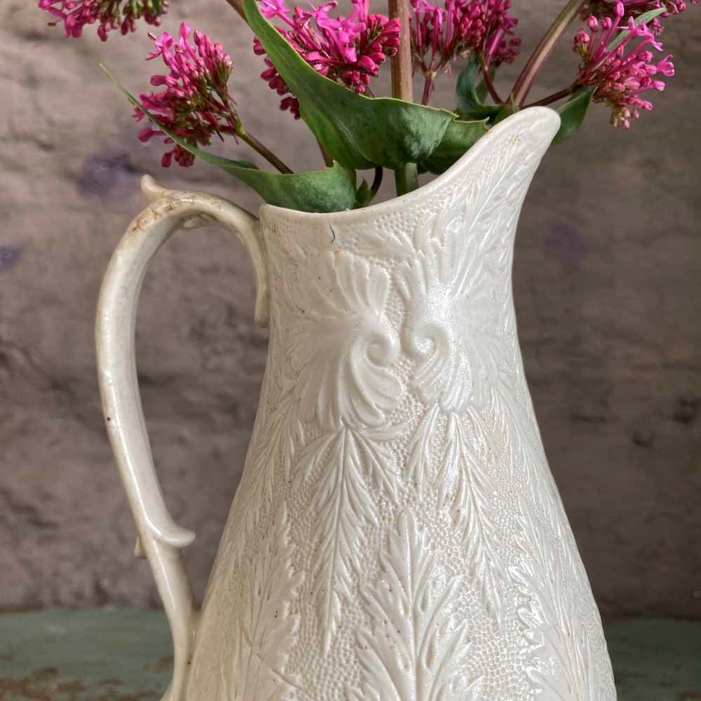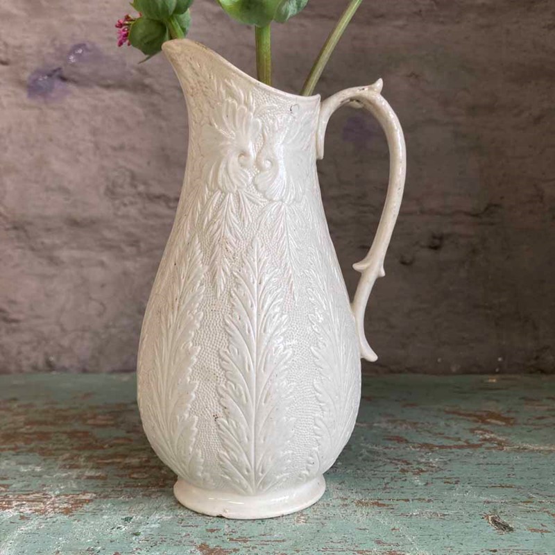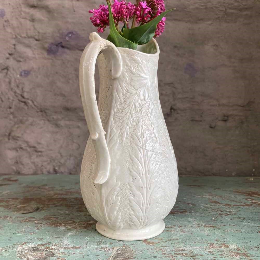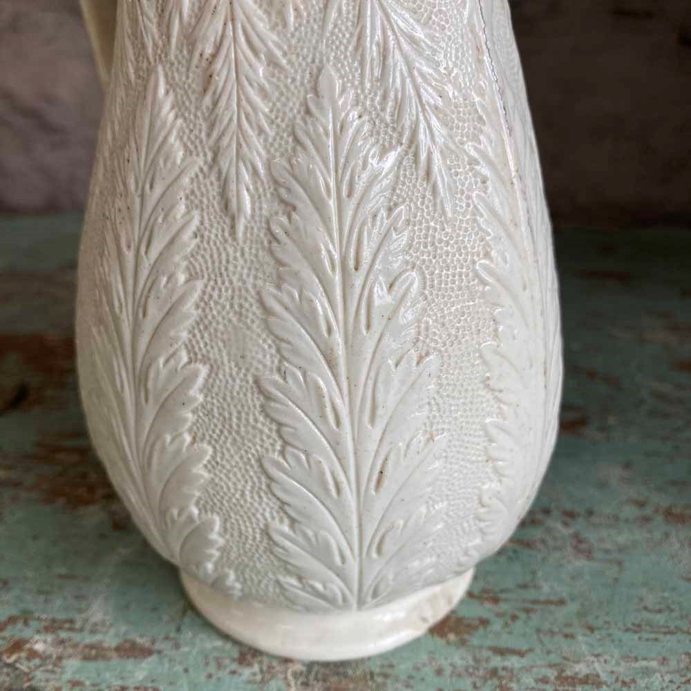 A late Victorian bisque pottery jug, with moulded fern leaves to the surface. An extremely elegant piece, with a beautiful sinuous form. Small chip to base.