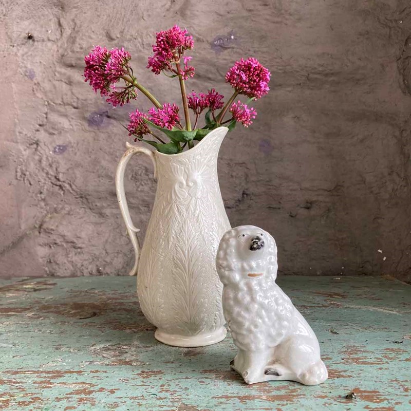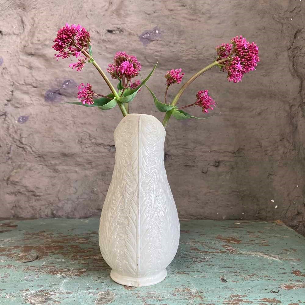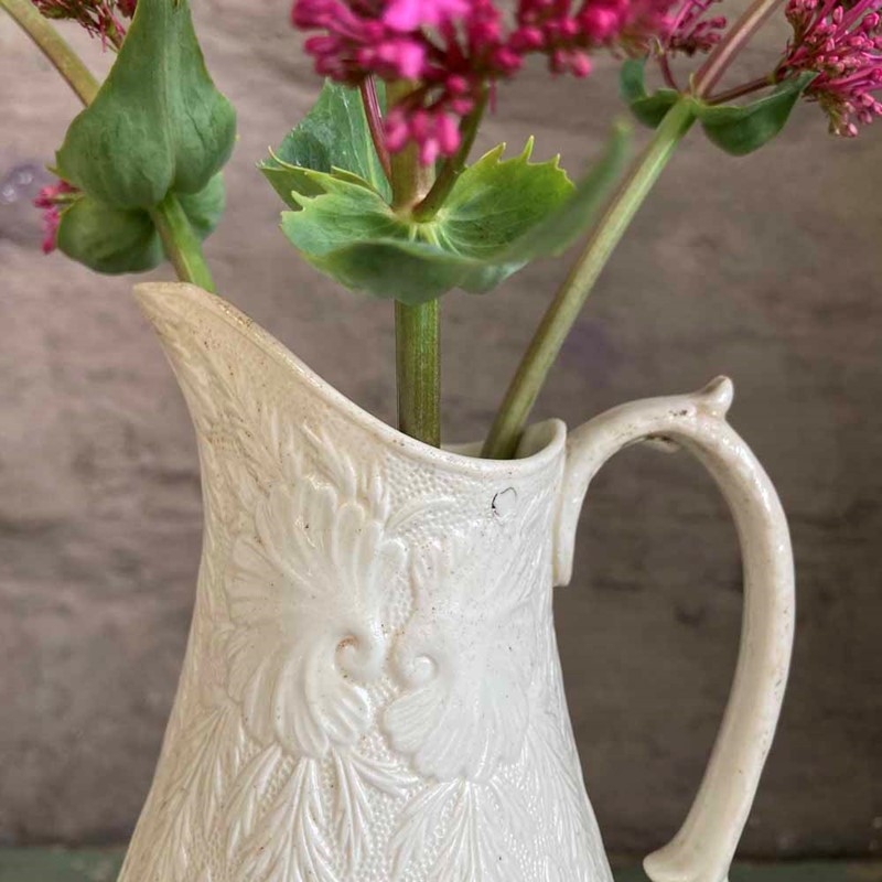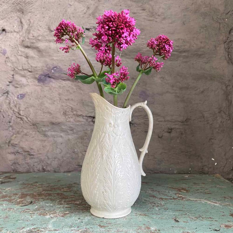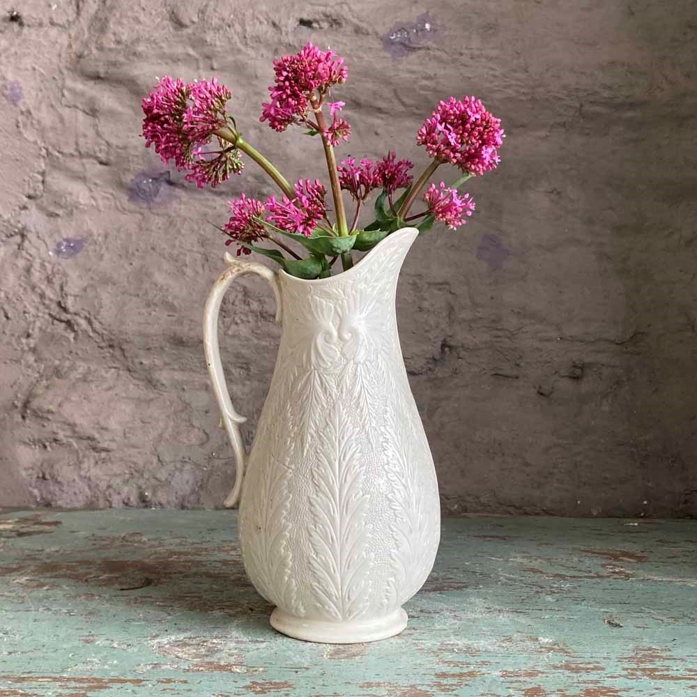 A late Victorian bisque pottery jug, with moulded fern leaves to the surface. An extremely elegant piece, with a beautiful sinuous form. Small chip to base.
