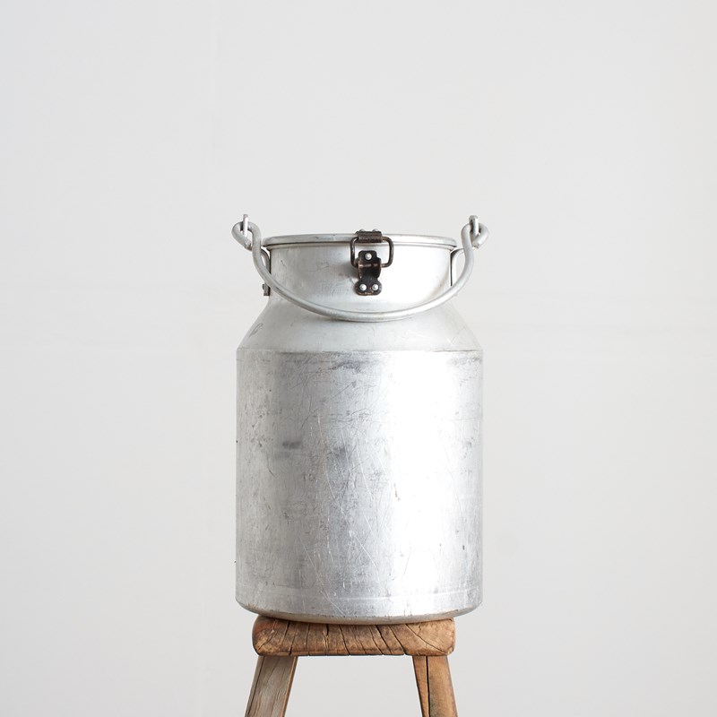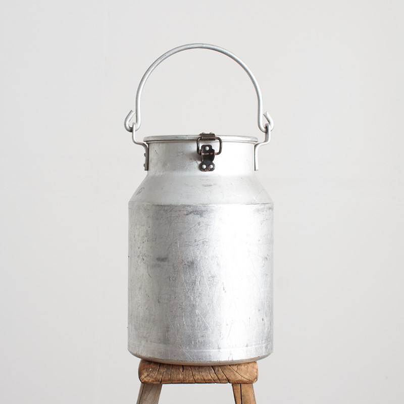 A small vintage milk churn made from aluminium retaining its original hinged lid which can be locked on. Great as a garden planter, umbrella stand or decorative vase.
