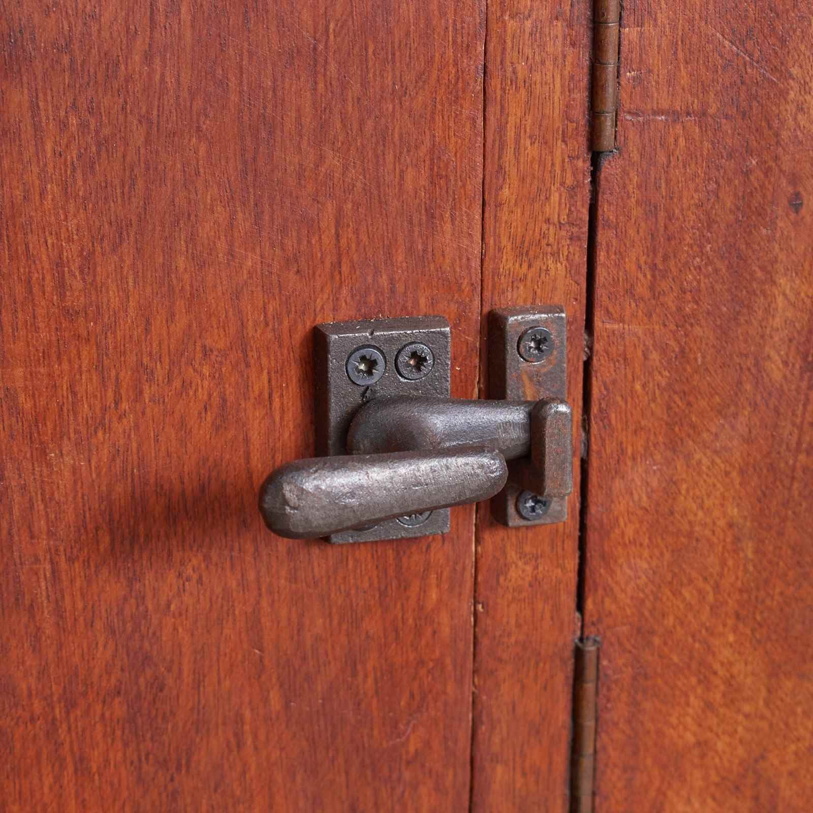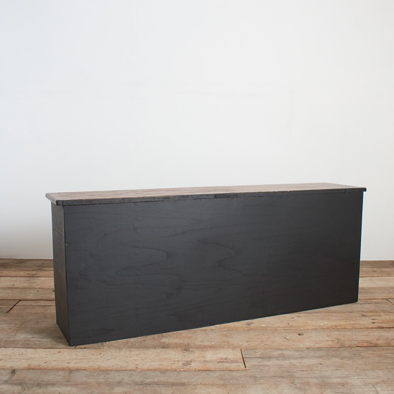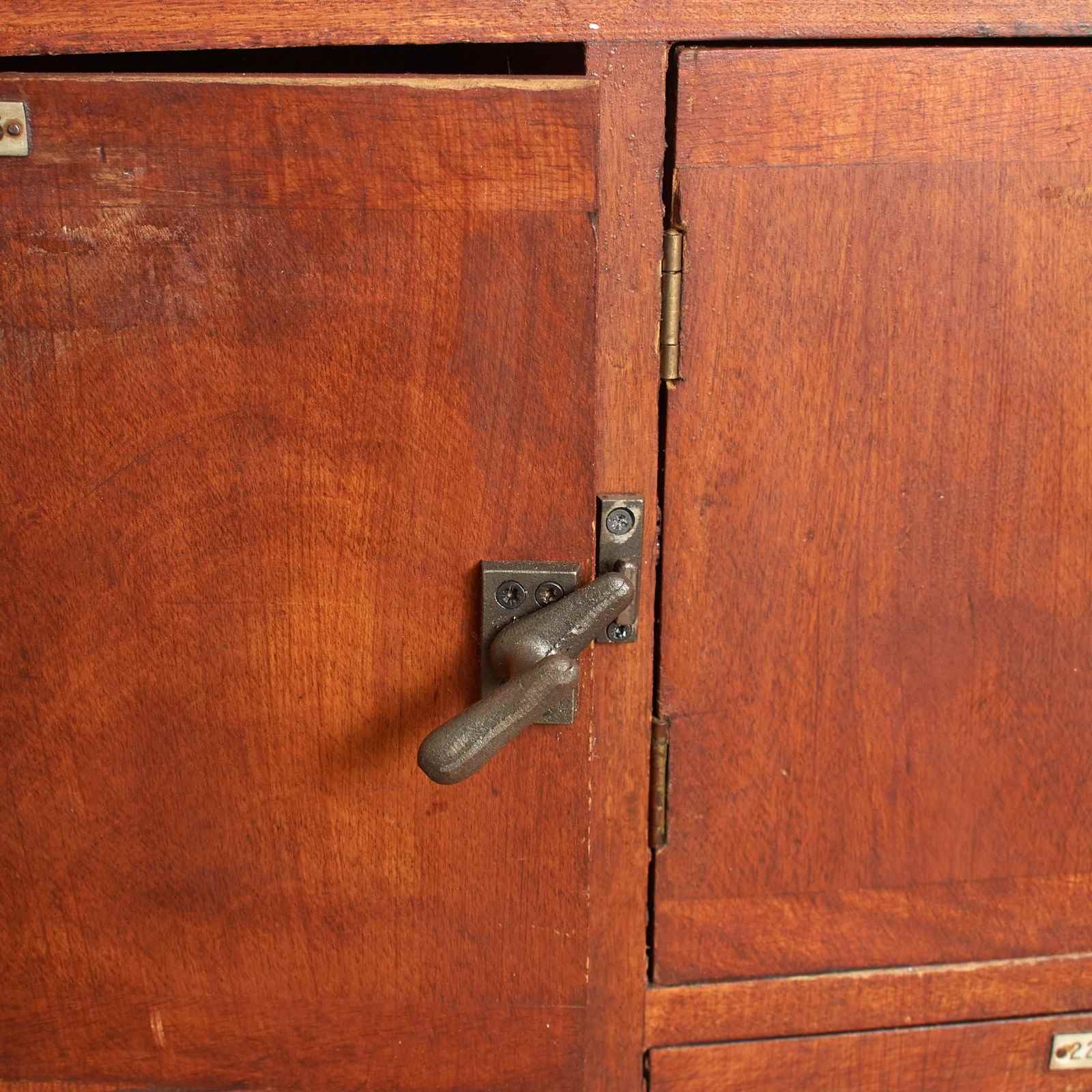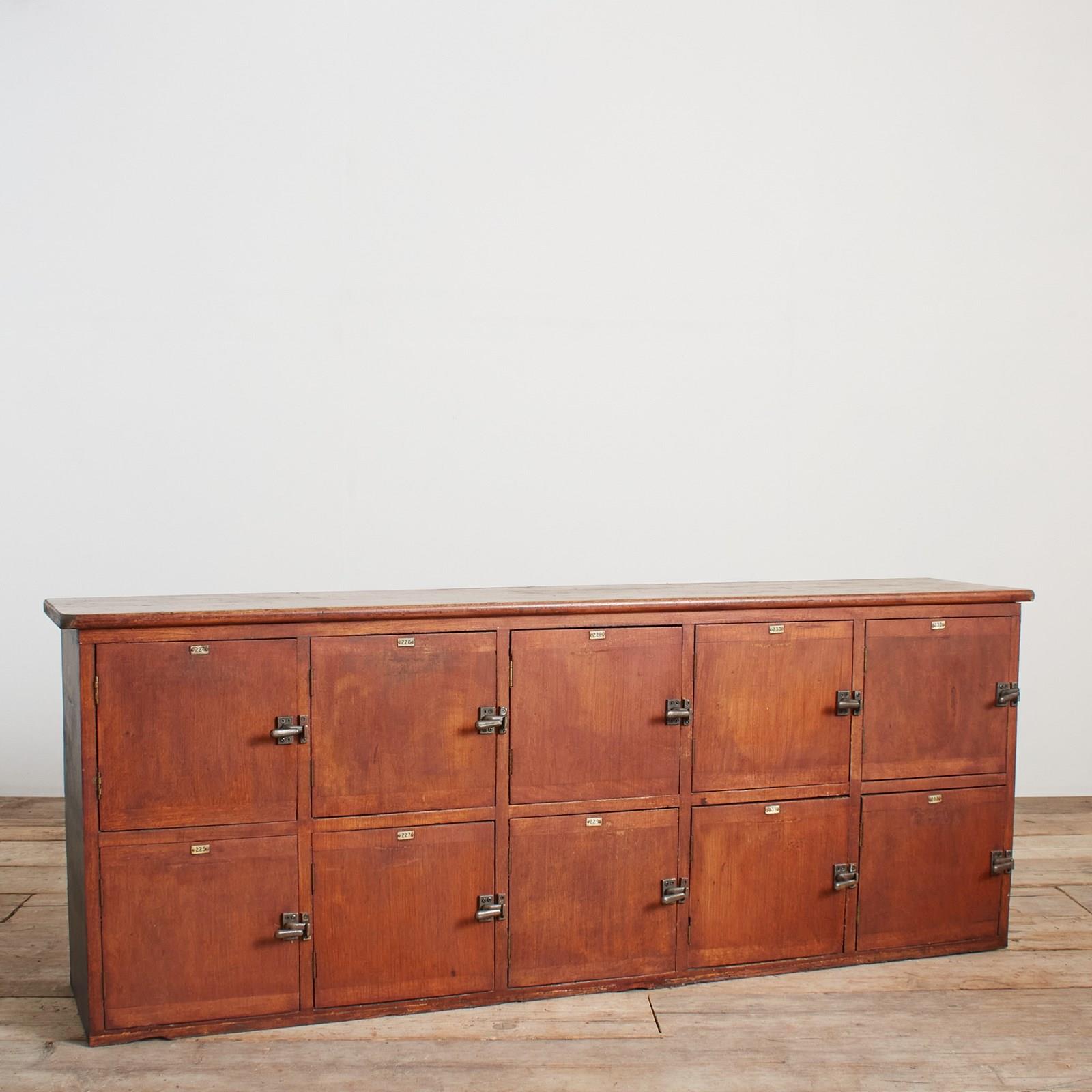 An original antique bank of wooden lockers with a lovely original hardwood top salvaged from a Scottish golf club. There are 10 individual lockers, each with an internal shelf. Each locker retains its original number plate, there is a cast metal catch on each door to enable the opening and closing of the lockers. The sides and rear are finished in black.
