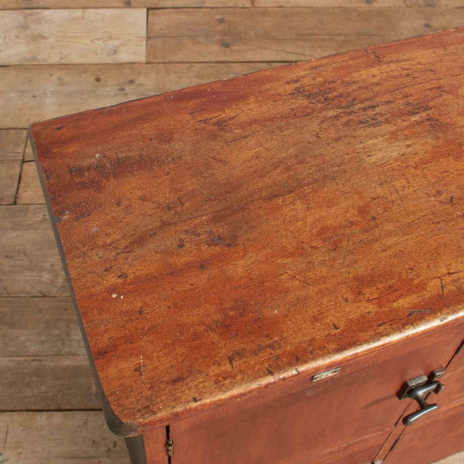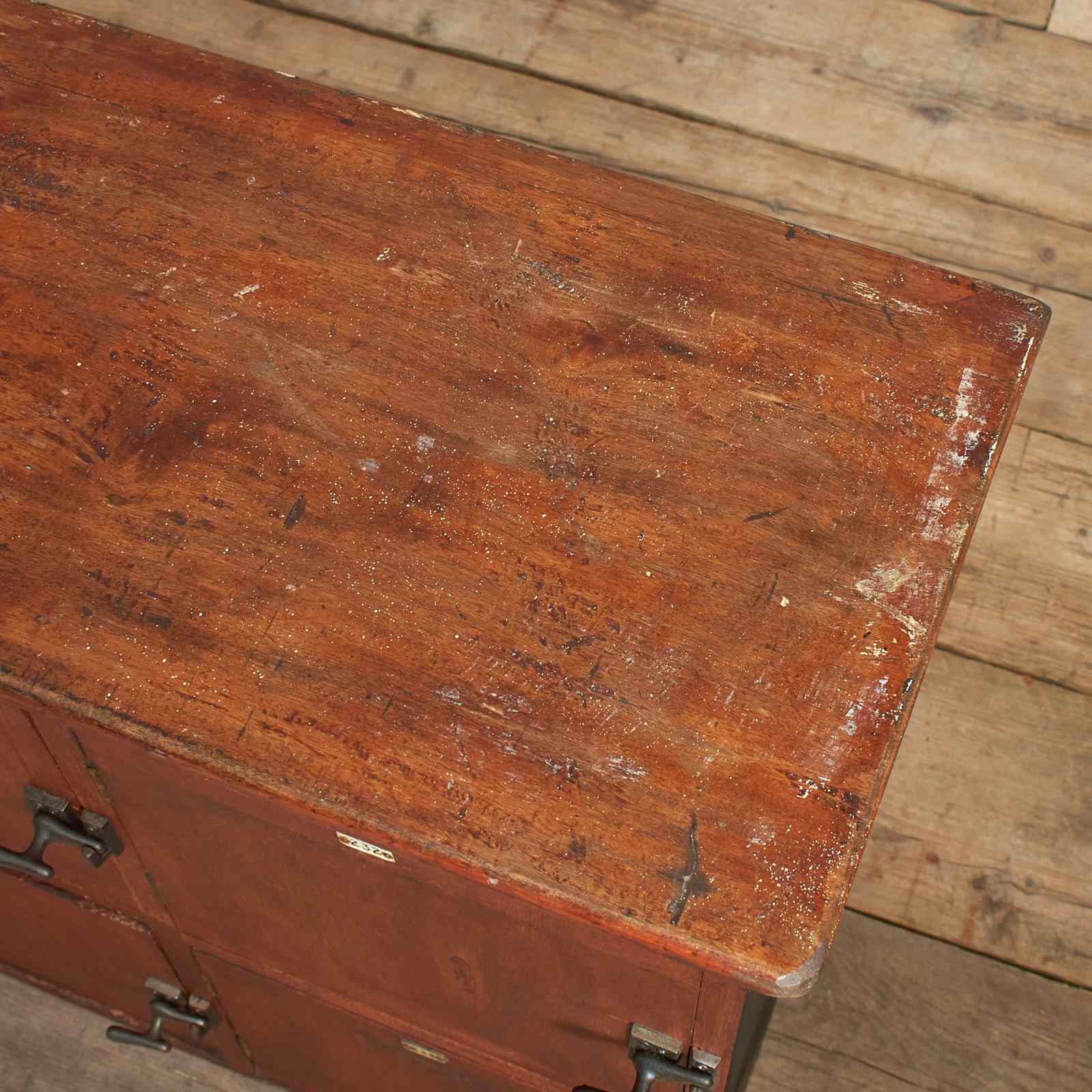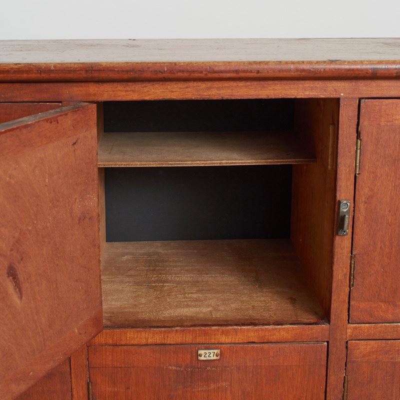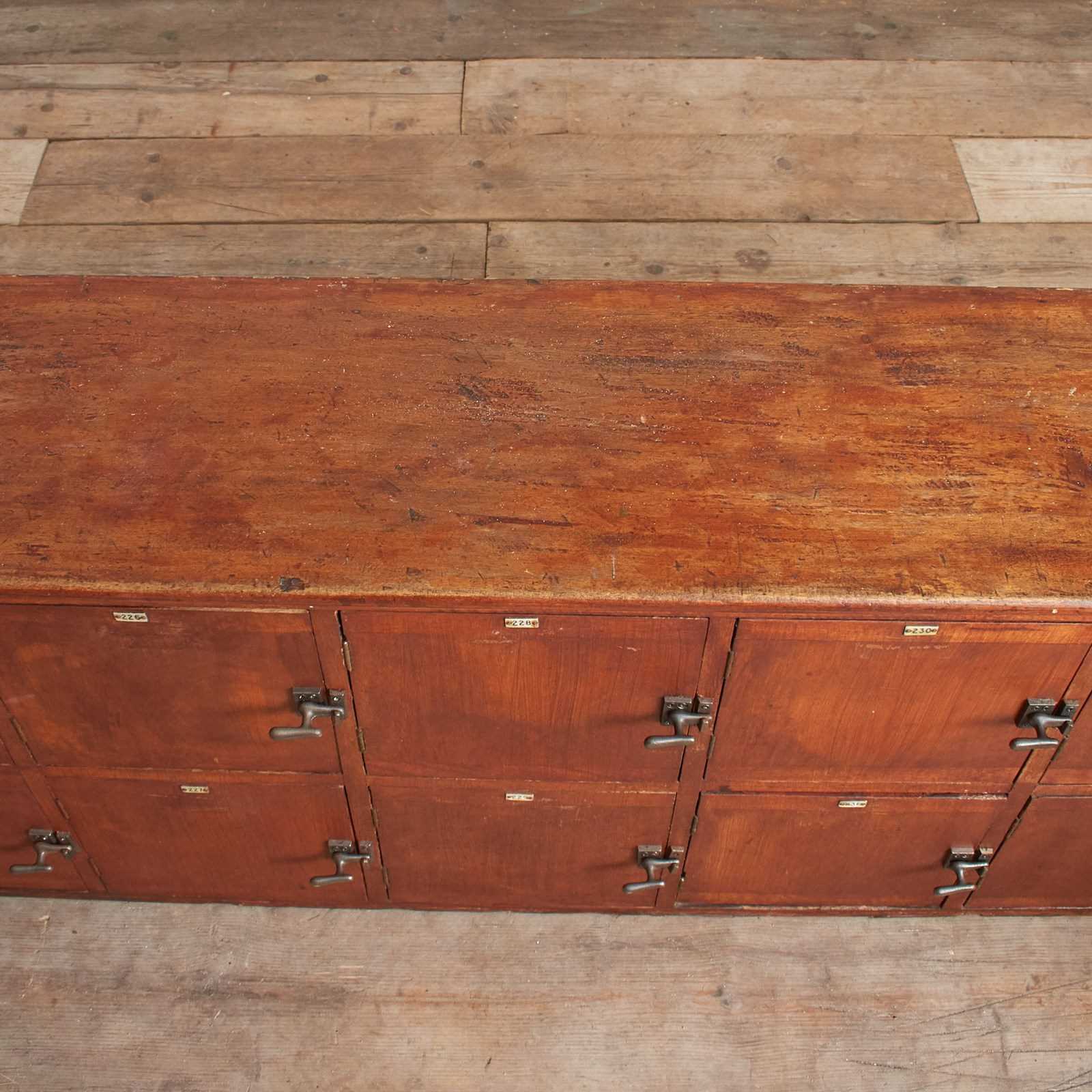 Workshop Report: Original vintage condition, the hardwood top plank has natural wear markings. The lockers are pine with a hardwood top and plywood back, there are age related markings to the wooden top, some markings to the number plates and some to the door fronts, the lockers have been waxed for future protection.