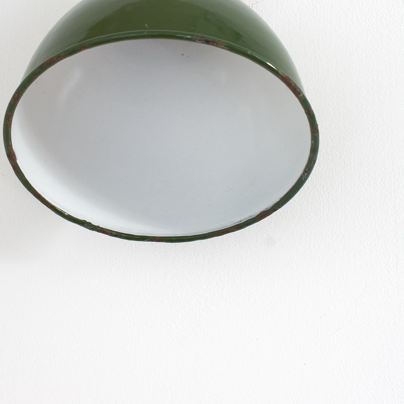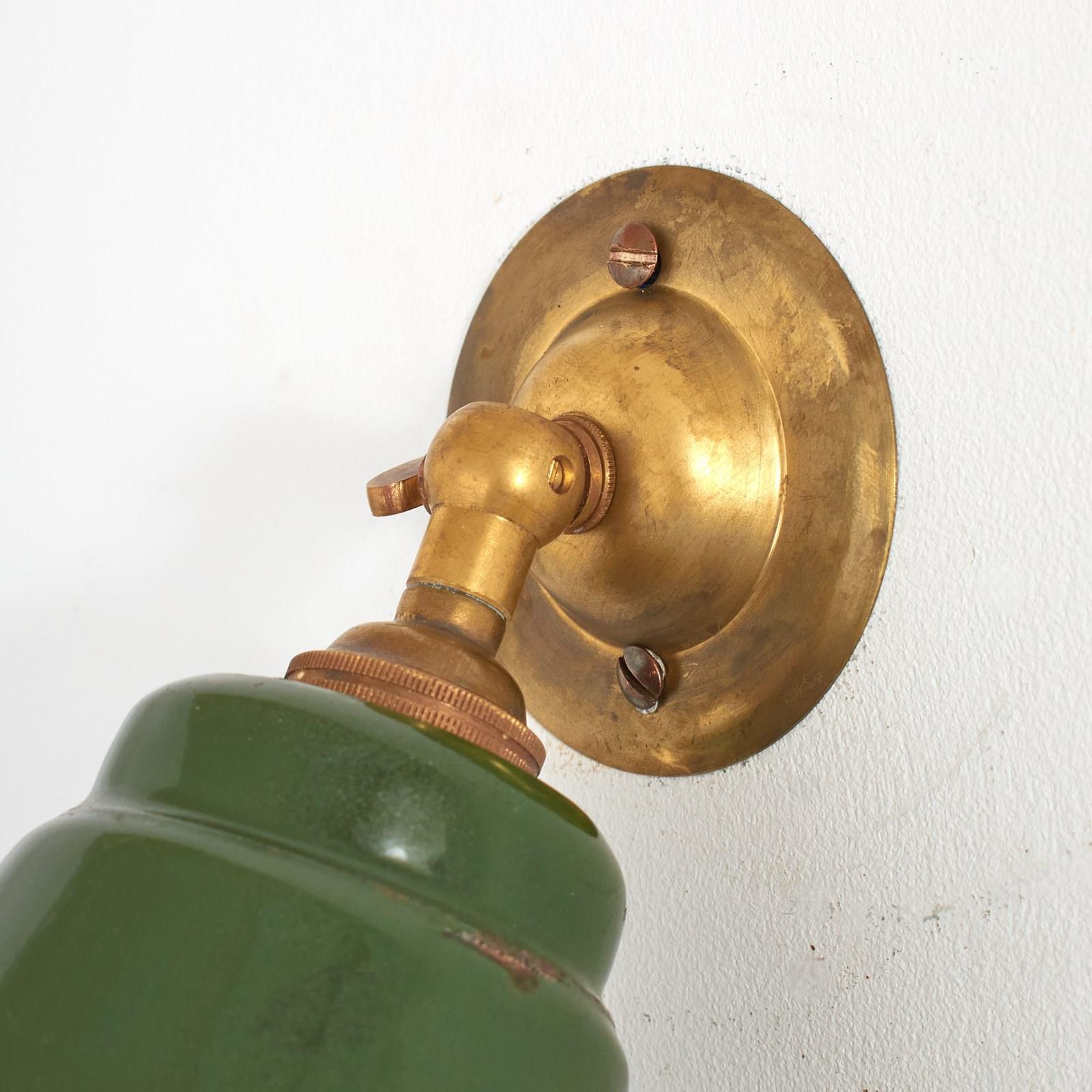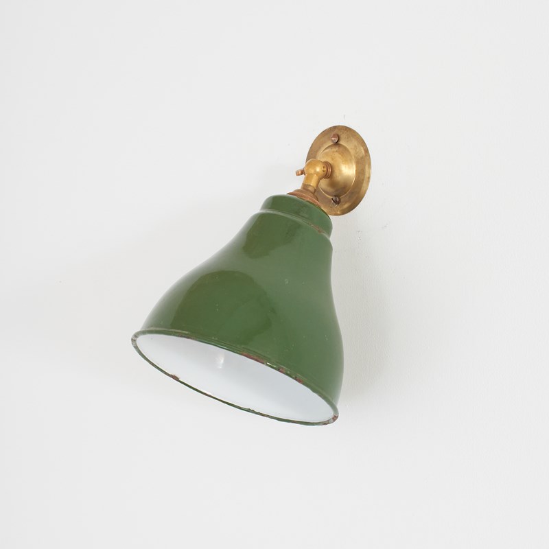 A green enamel light manufactured by Benjamin. The shade is dark green enamel with a white interior. The light has an aged brass gallery and wall fitting, perfect for a task light in the kitchen or workspace.
