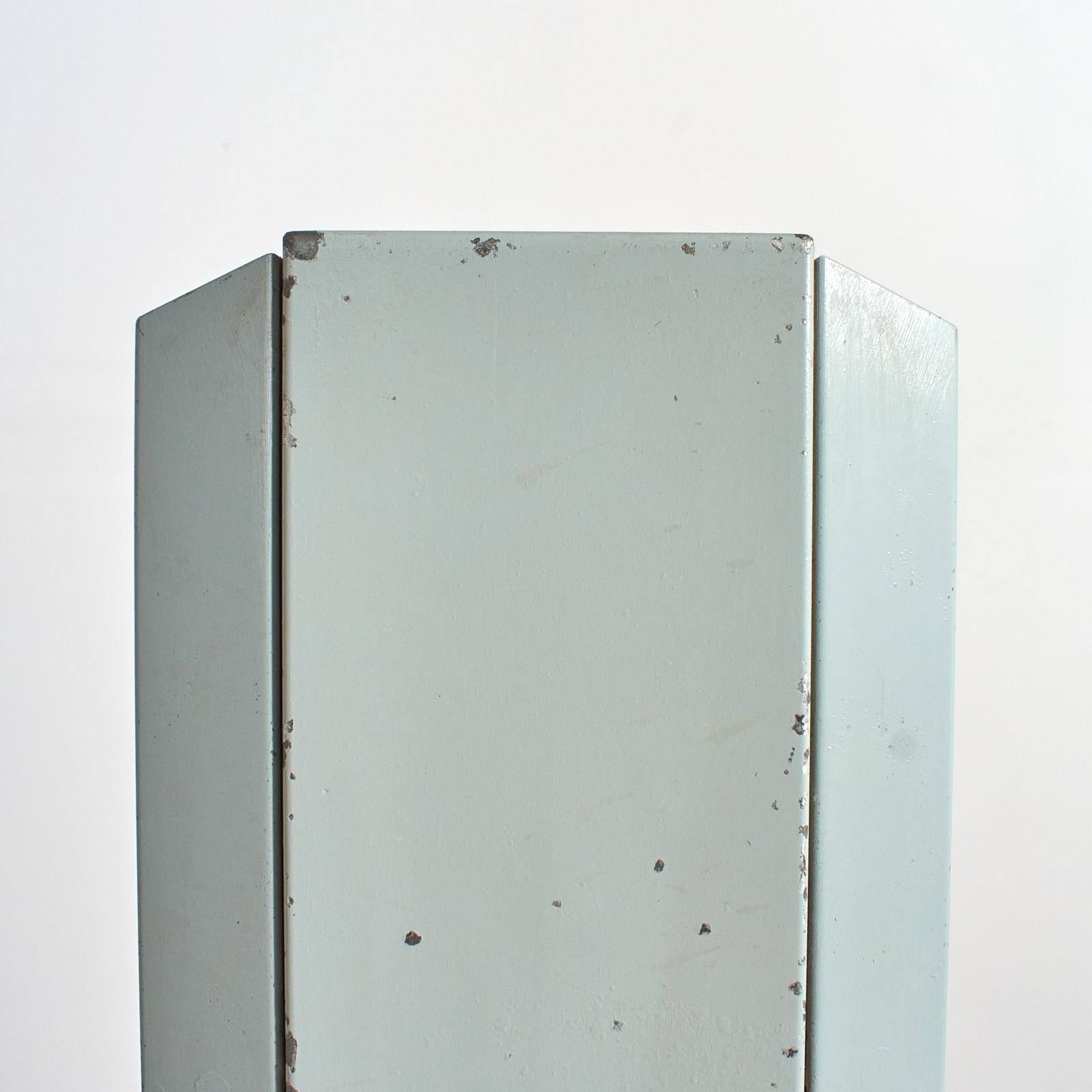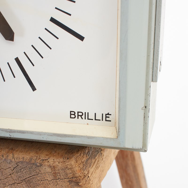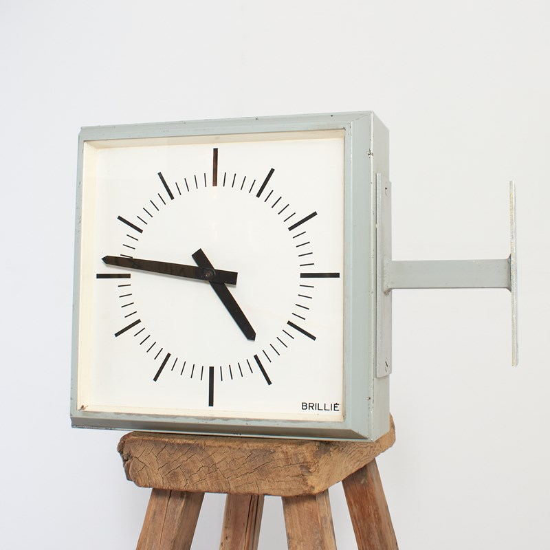 An original French Factory clock manufactured by Brillie. The clock has a steel metal surround painted in a pale blue/grey finish. Both clock faces have been converted to quartz battery mechanism, retaining their original hands. Each clock face is the same, there is a sturdy steel arm to support the clock and mount onto the wall.