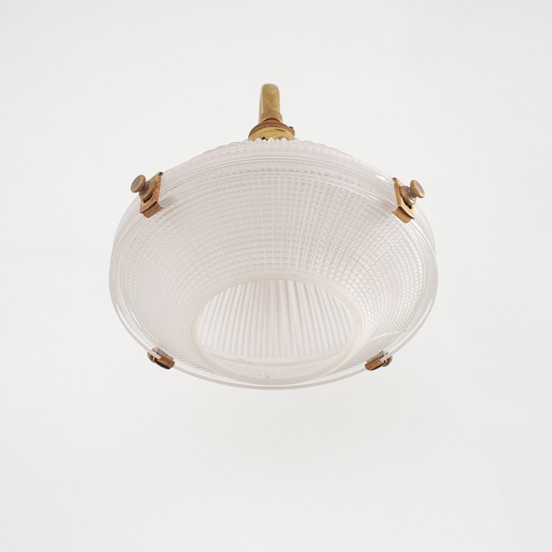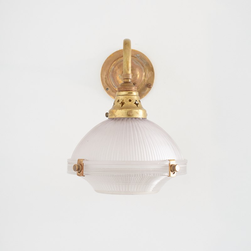 An original Holophane glass wall light retaining its original brass gallery and components. The brass metalwork has been left in its original condition and retains the original makers stamp. The two part type glass retains its original Holophane makers mark to the glassware.The crisp clean lines create a beautiful glow when illuminated. Holophane glass was invented in the 1890s and was made in many shapes, sizes and patterns to provide specific types of illumination, this particular one was used in a church.