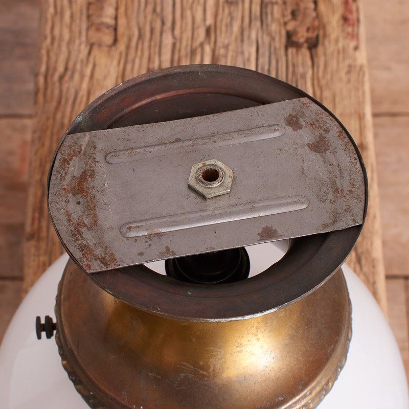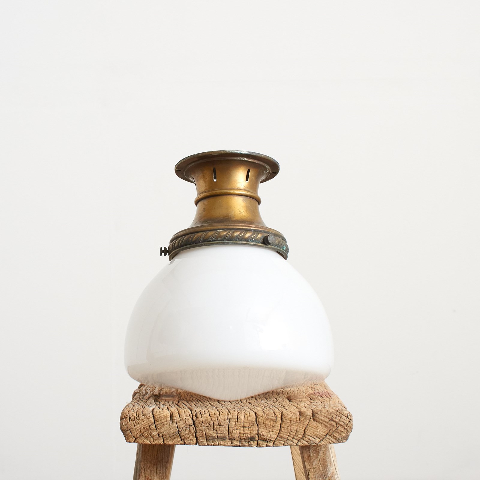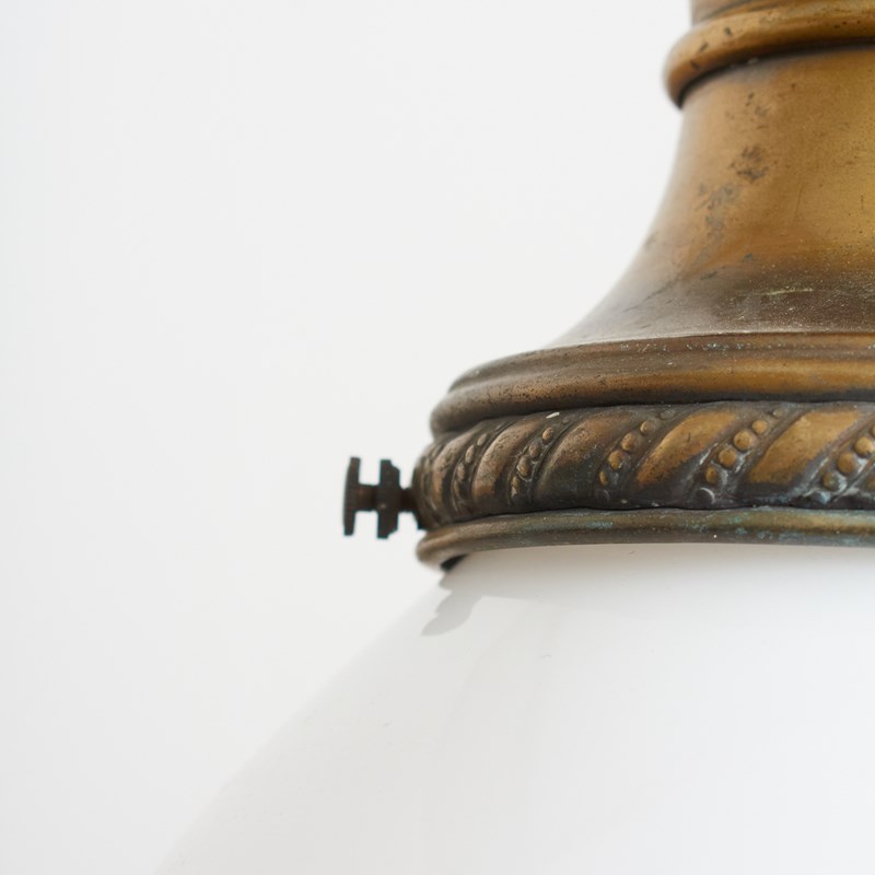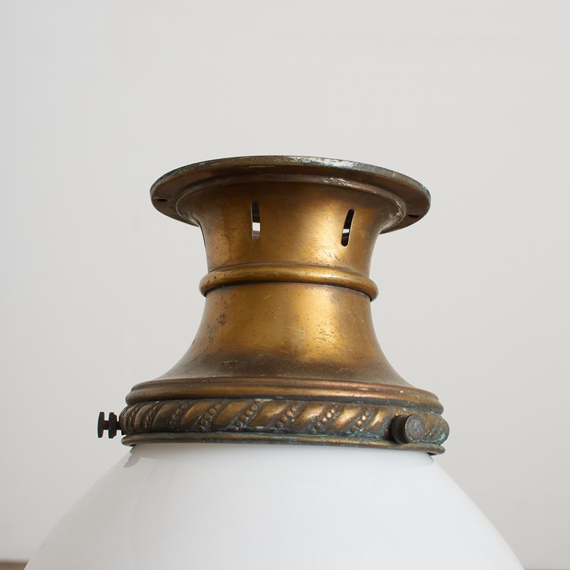 An original opaline glass ceiling light. The light has a milk glass opaline shade and retains its original brass ceiling gallery. The stepped brass gallery finish has been left untouched in it original condition.
