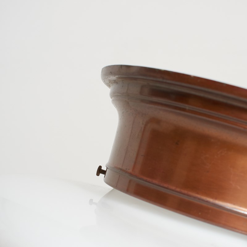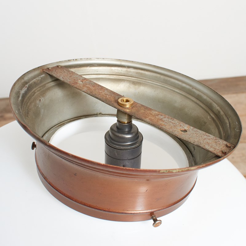 An original opaline glass ceiling light. The light has a school house shaped milk glass opaline shade and retains its original brass ceiling gallery. The stepped brass gallery finish has been left untouched in it original condition.