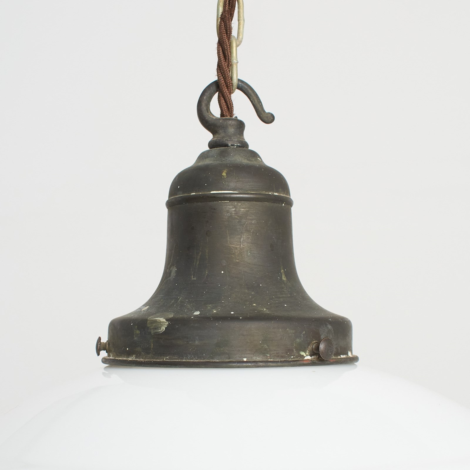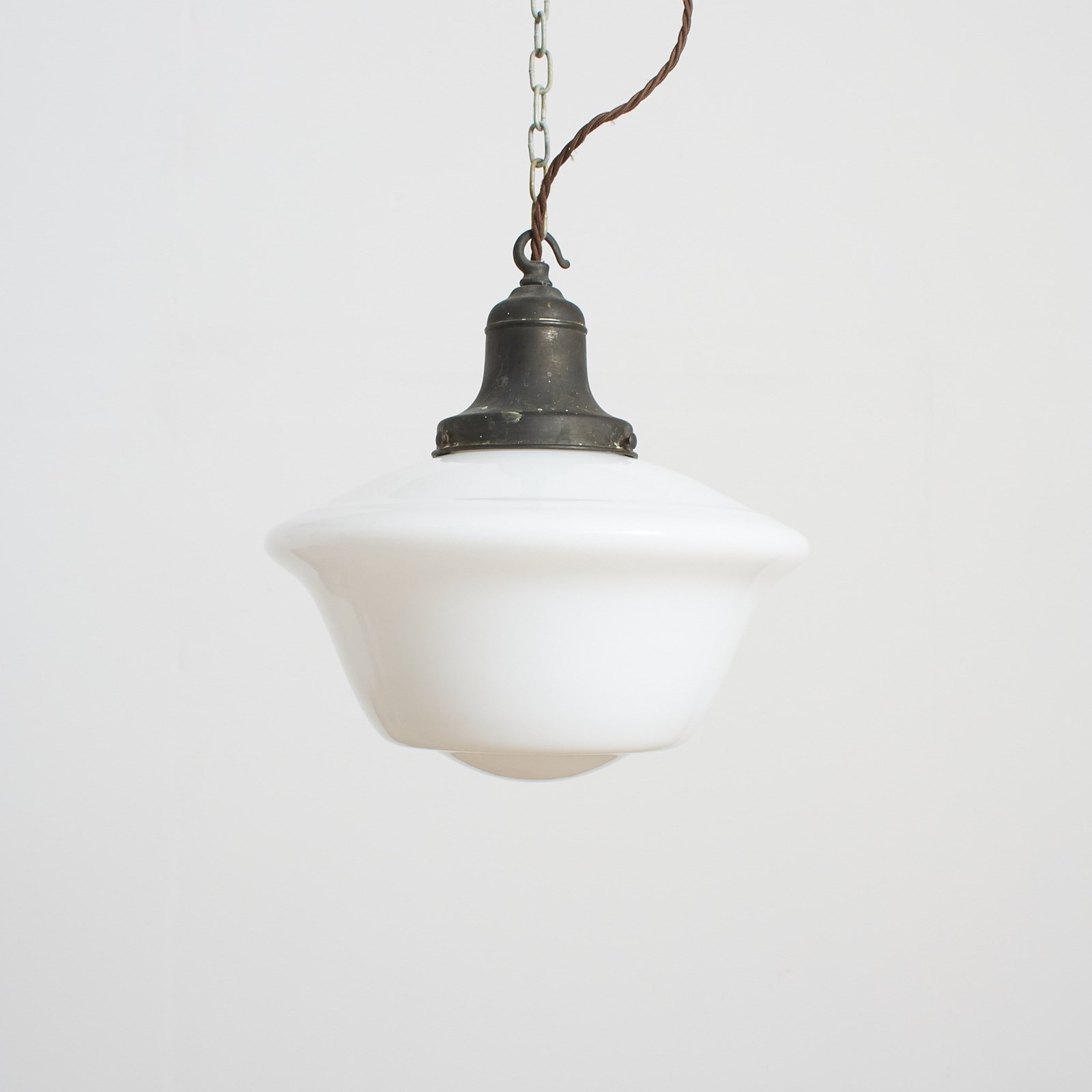 Workshop Report: The workshop team inspect all products and perform any necessary repairs to ensure many more years of future use, with lighting we deep clean the shades and professionally remove all existing electrical components and fit new CE certified electrical fittings. This light is supplied with new period style brown twisted 3 core fabric flex, ceiling rose and CE certified E27 screw lampholder. There is 50cm of original chain, we can supply longer if required. The light can take up to 100W Equivalent LED bulb. Please contact us if the wire colour and chain lengths need to be adjusted. We can also supply wired for US standards with UL flex and e26 bulb holder.