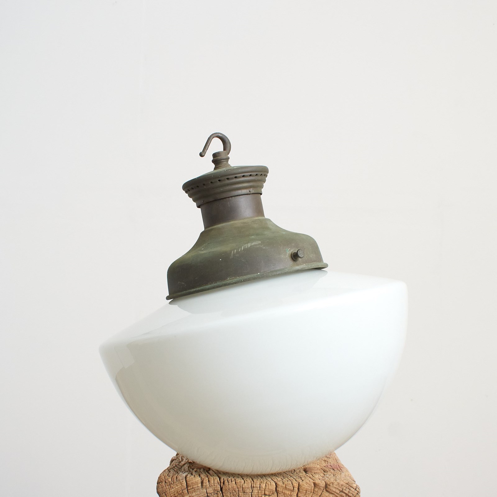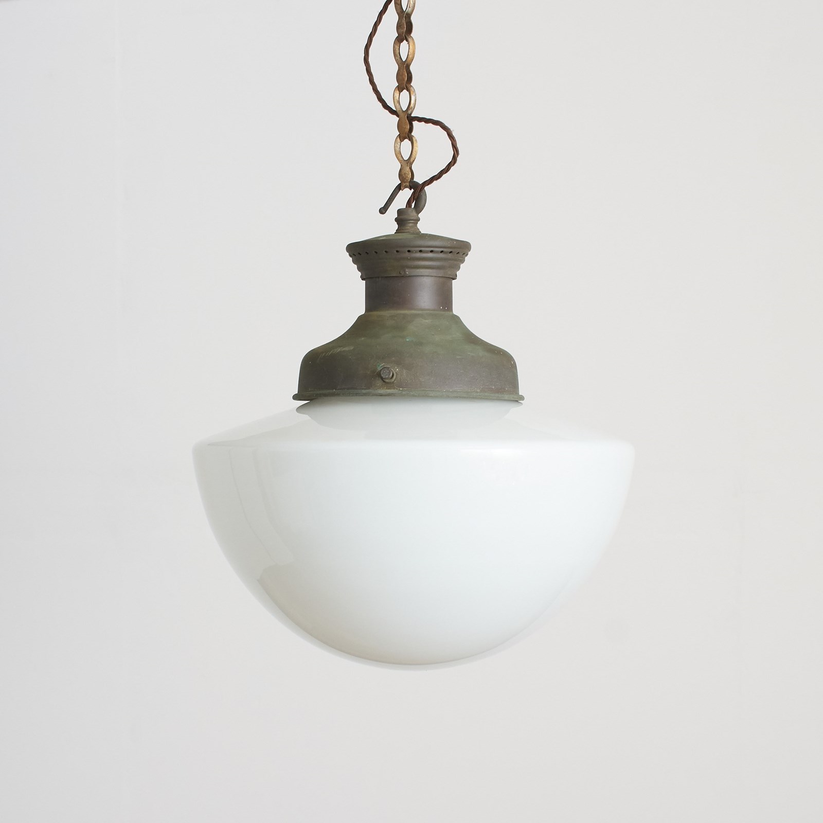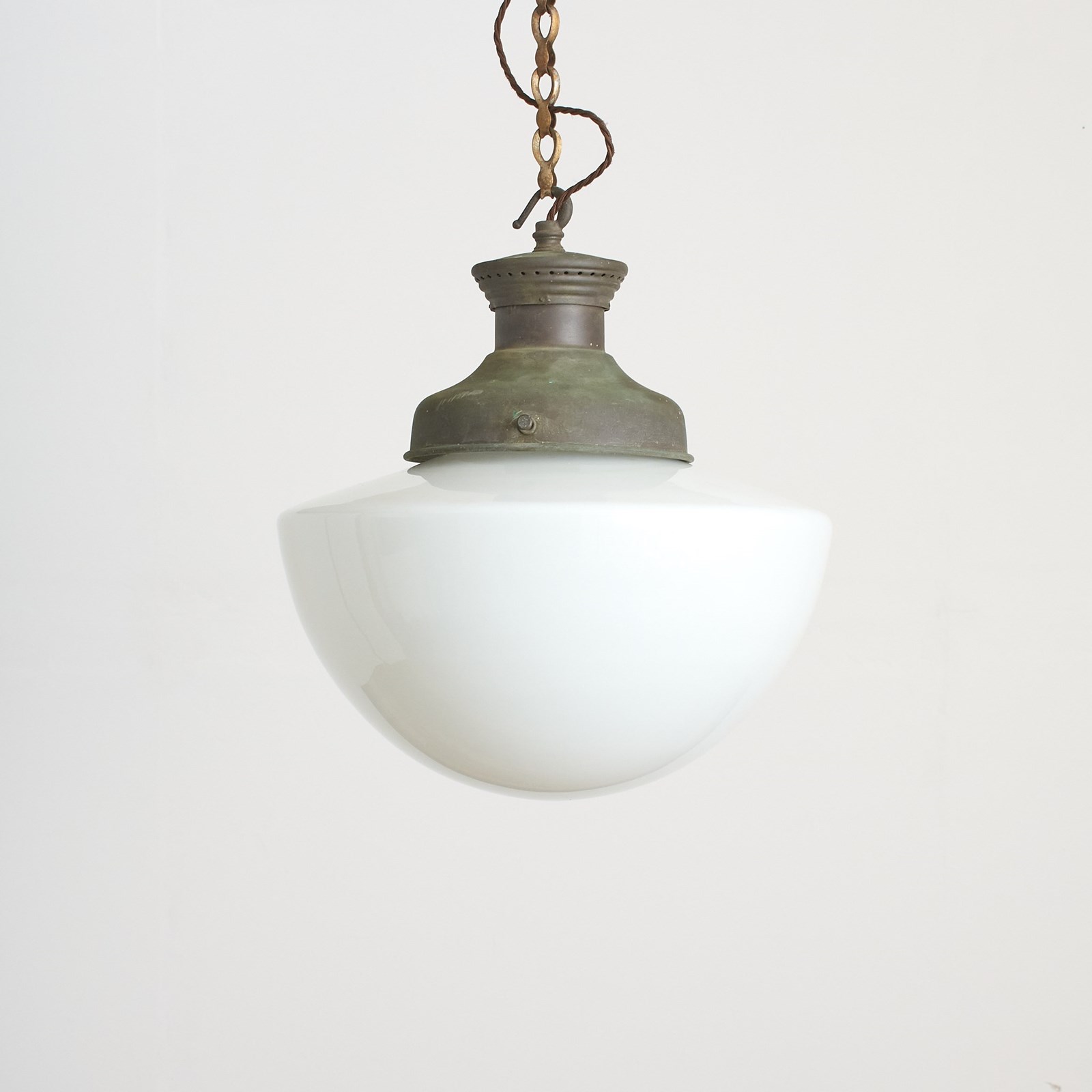 An original opaline glass pendant light salvaged from school chapel. The light has a milk glass opaline larger than standard shade and original brass hanging gallery. The gallery finish has been left untouched in it original condition. These style lights are a scarce find with their unusual shape and originally retain gallery fitting. The light is stamped with the makers mark.