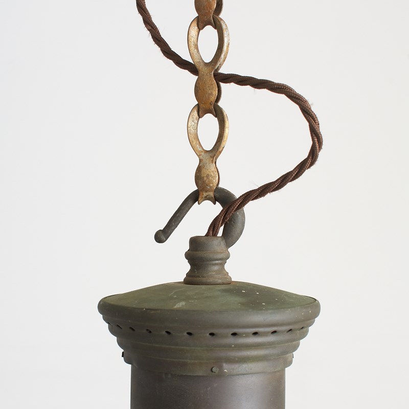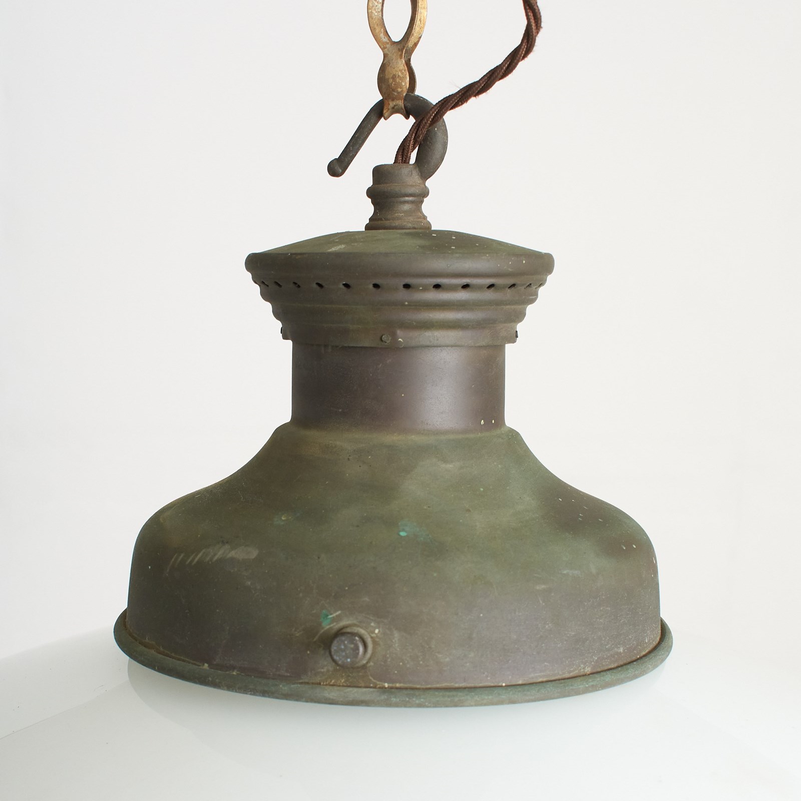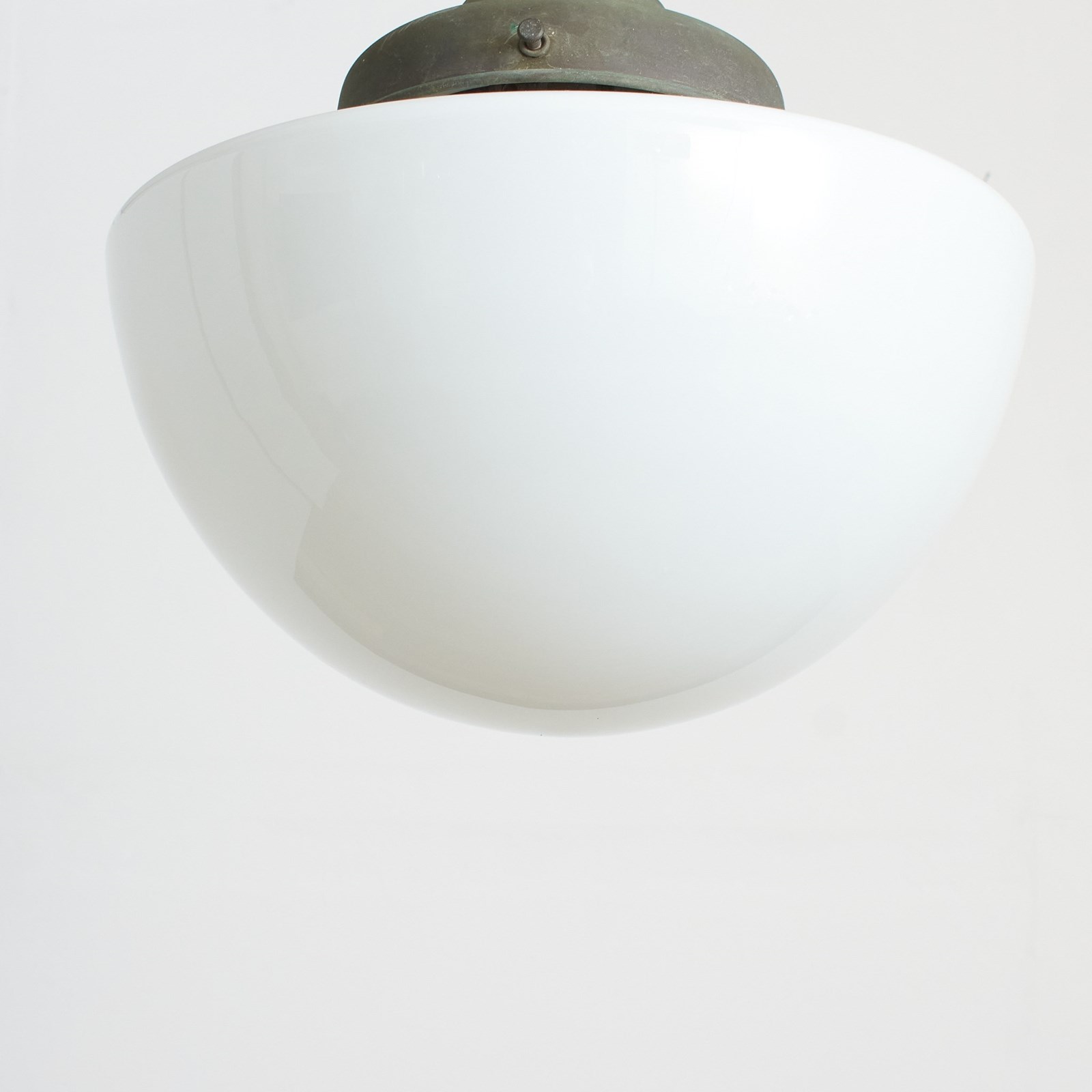 An original opaline glass pendant light salvaged from school chapel. The light has a milk glass opaline larger than standard shade and original brass hanging gallery. The gallery finish has been left untouched in it original condition. These style lights are a scarce find with their unusual shape and originally retain gallery fitting. The light is stamped with the makers mark.
