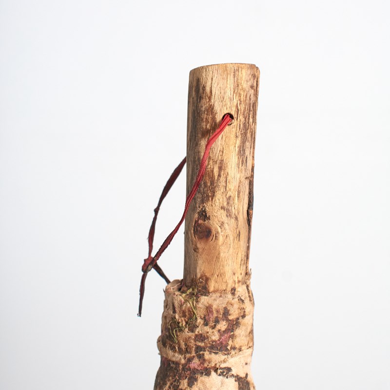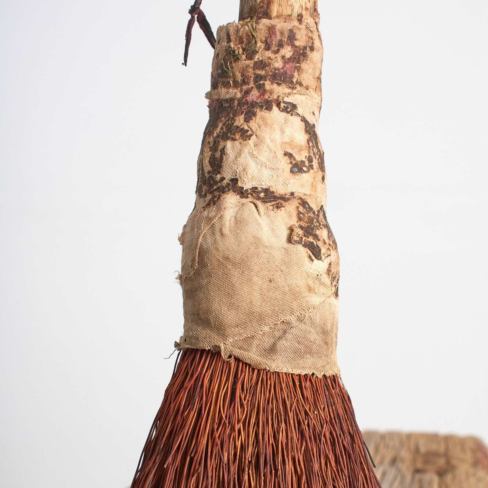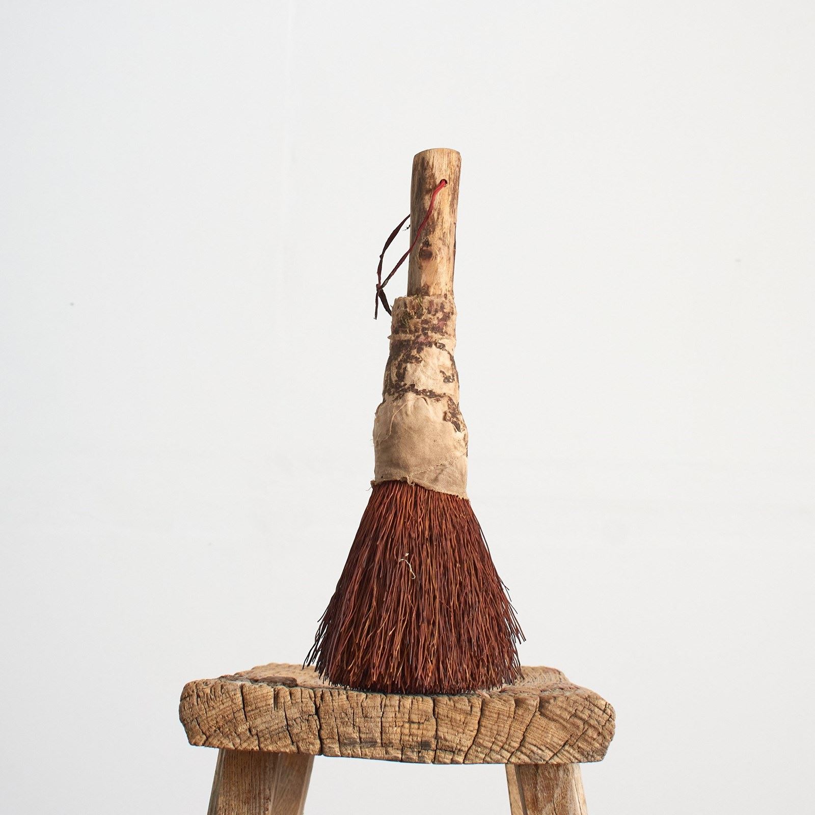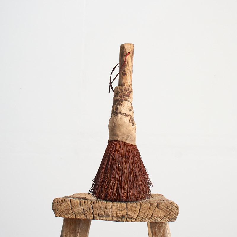 A unique handmade brush, the brush has a wooden handle with natural fibre bristles and a rag top with string handle. Great for use or as a decorative object.