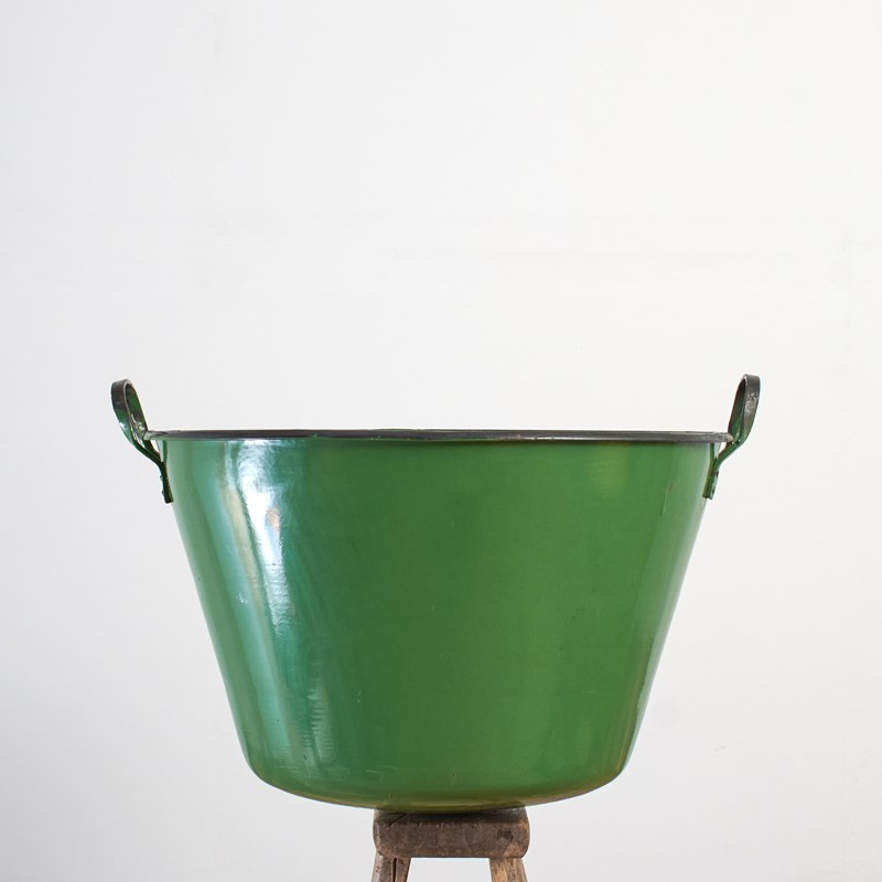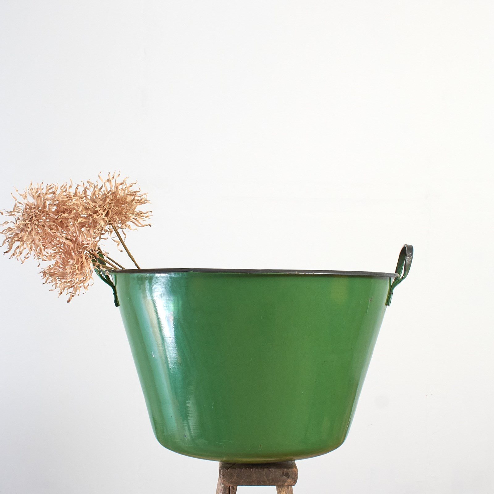 An original Hungarian goulash cooking cauldron. Metal handles on either side with a vibrant green enamel finish. It would make a great garden planter, olive tree pot, log basket.