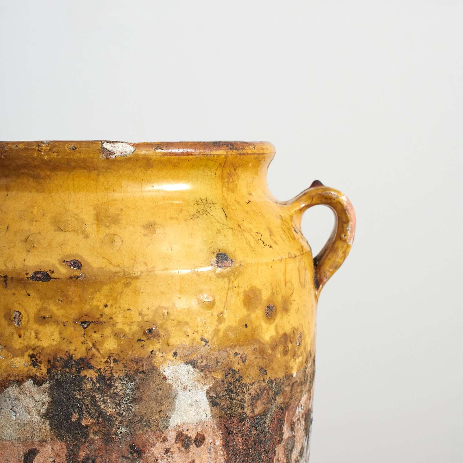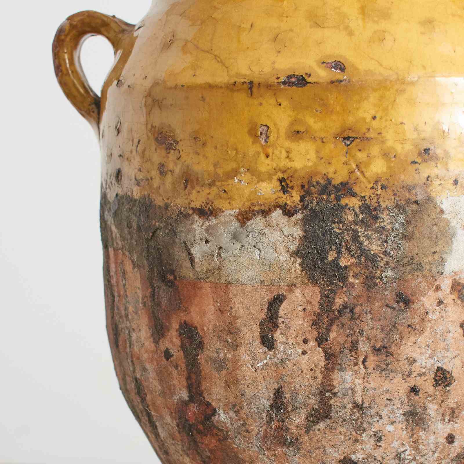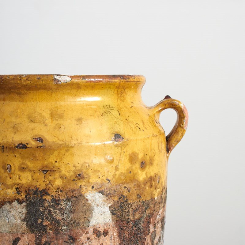 A nineteenth century French confit pot jar with classic dark yellow pottery and glaze. Originally used to store food such as duck in fat before refrigeration they are now beautiful decorative pieces in their own right on a table or with dried flowers on a windowsill. This pot is in its original condition and has various imperfections to the finish and glaze giving a lovely rustic look.