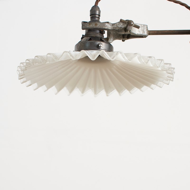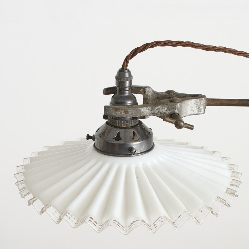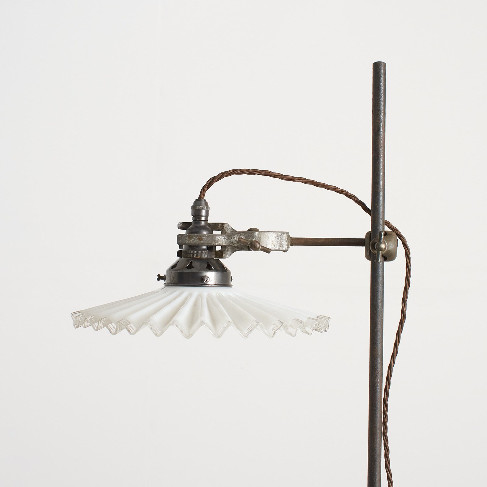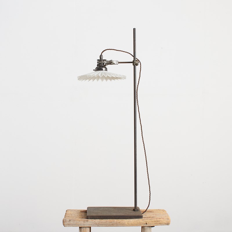 A French metal laboratory stand with a cast metal base and steel upright. The stand retains its original bosshead and clamp. The clamp attaches to a new bulb holder and gallery. The French antique milk glass coolie shade is white with a frilly edge. The bosshead can be adjusted to swivel the light shade and adjust the height.