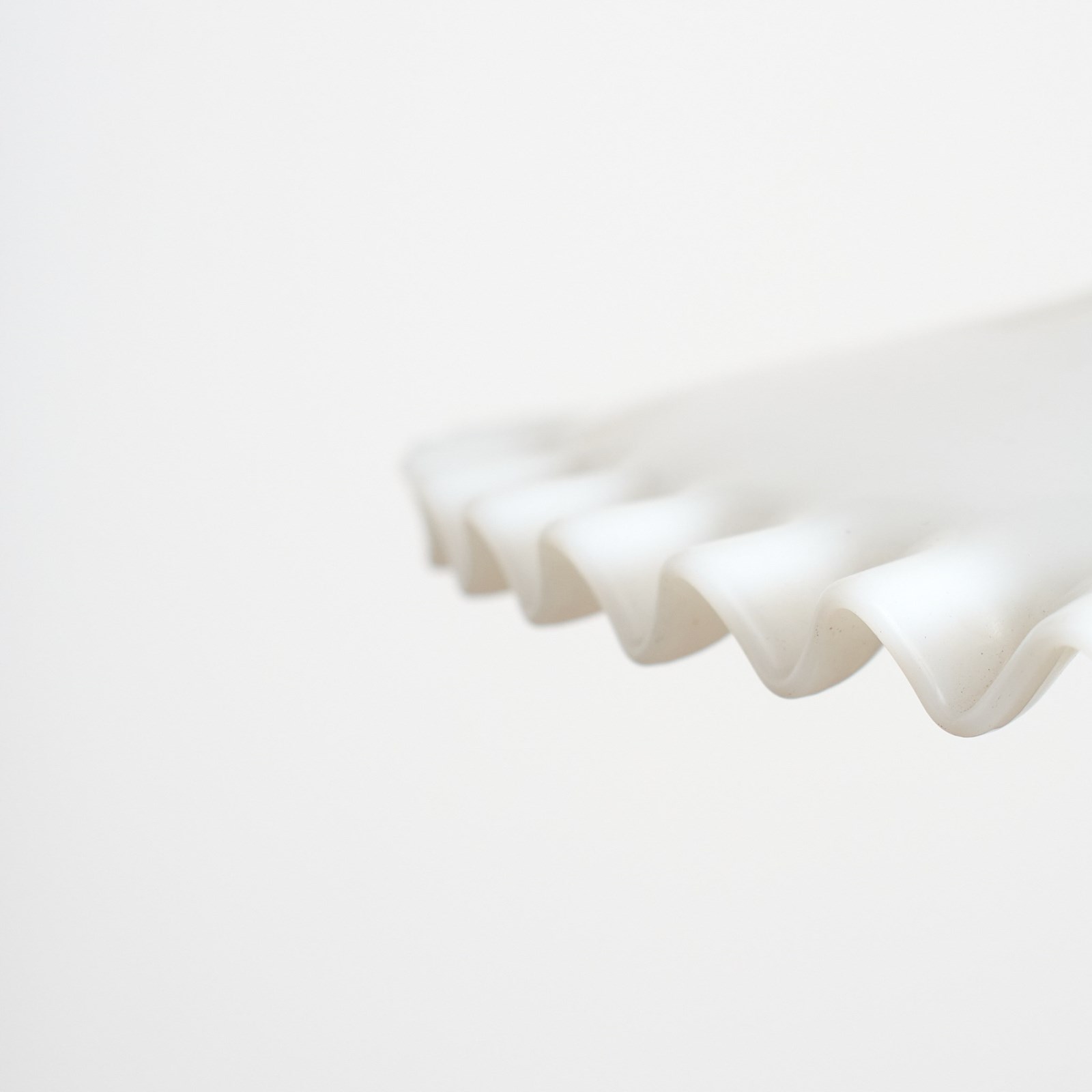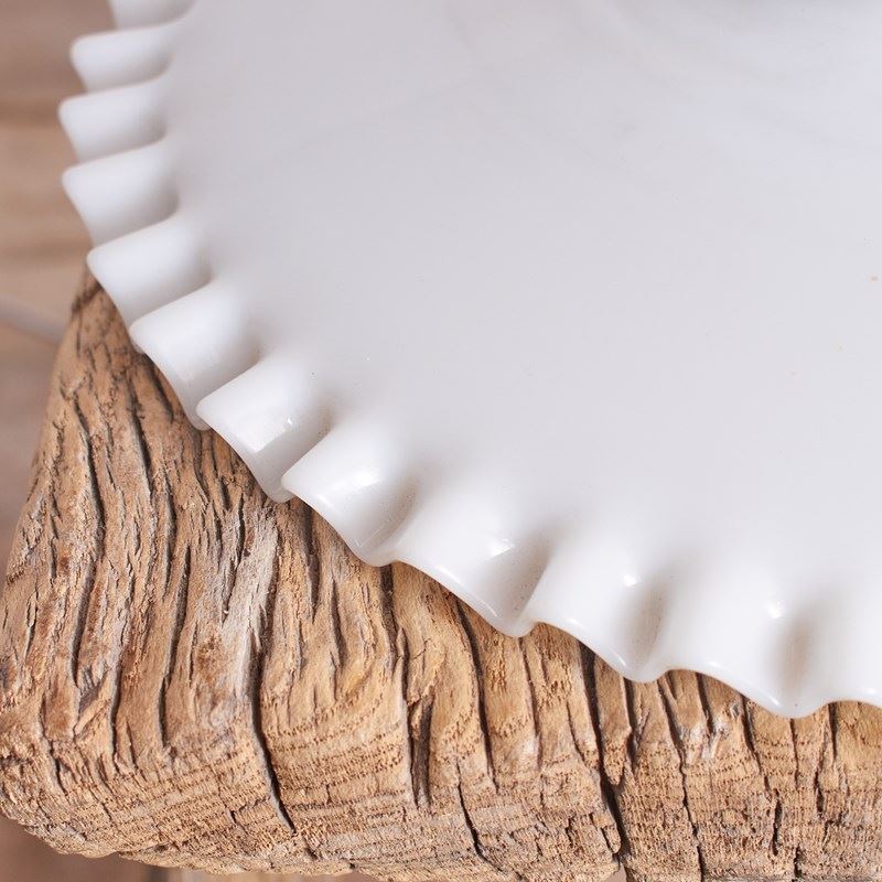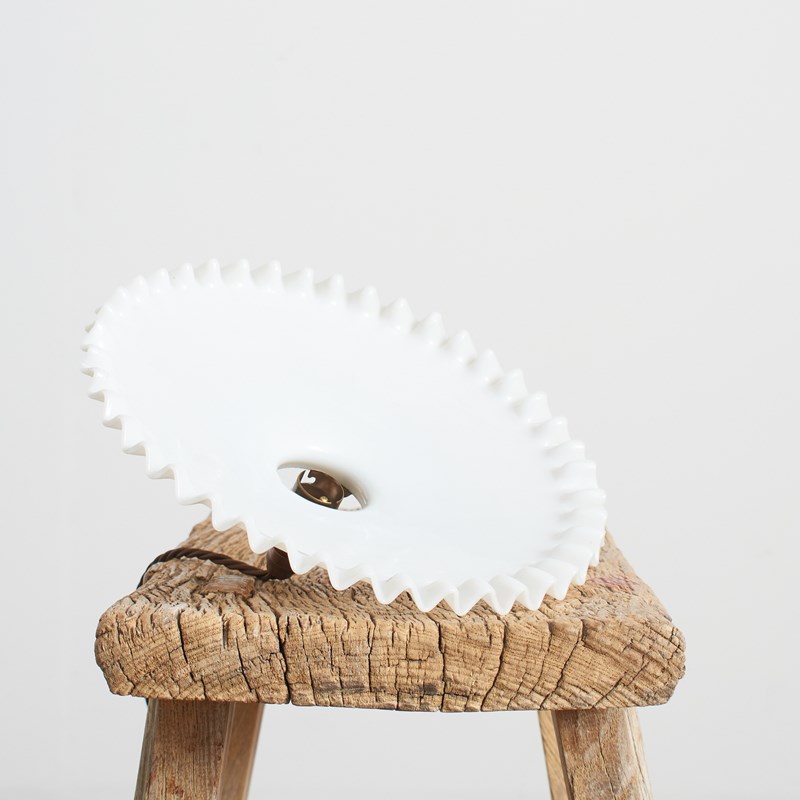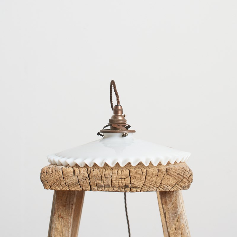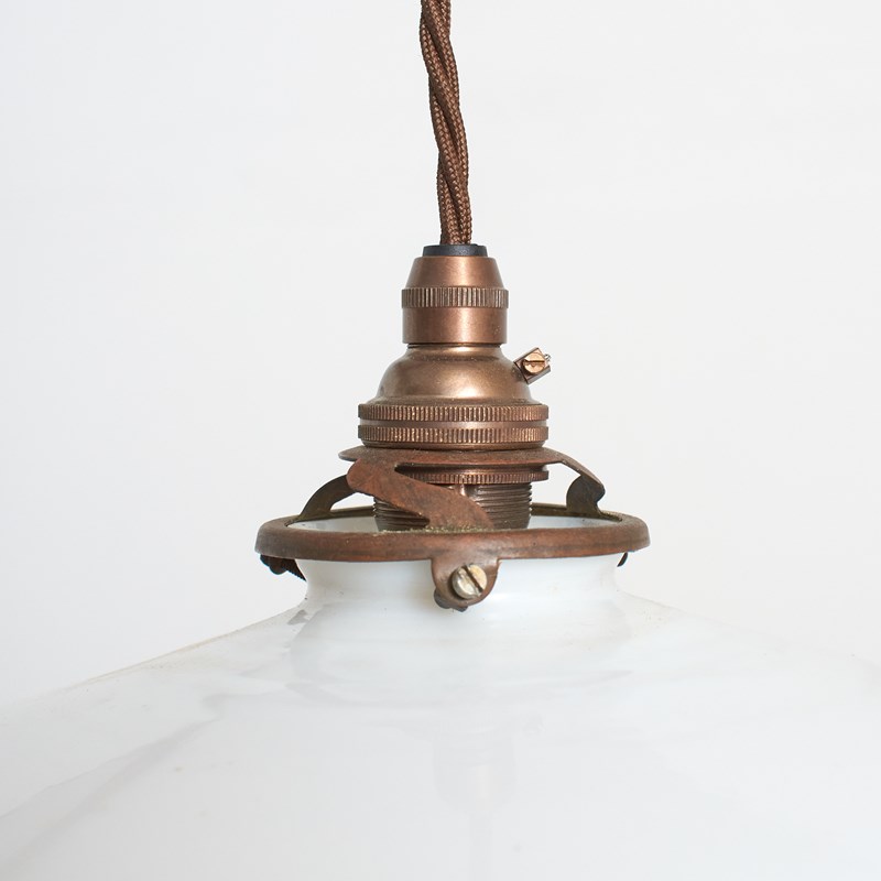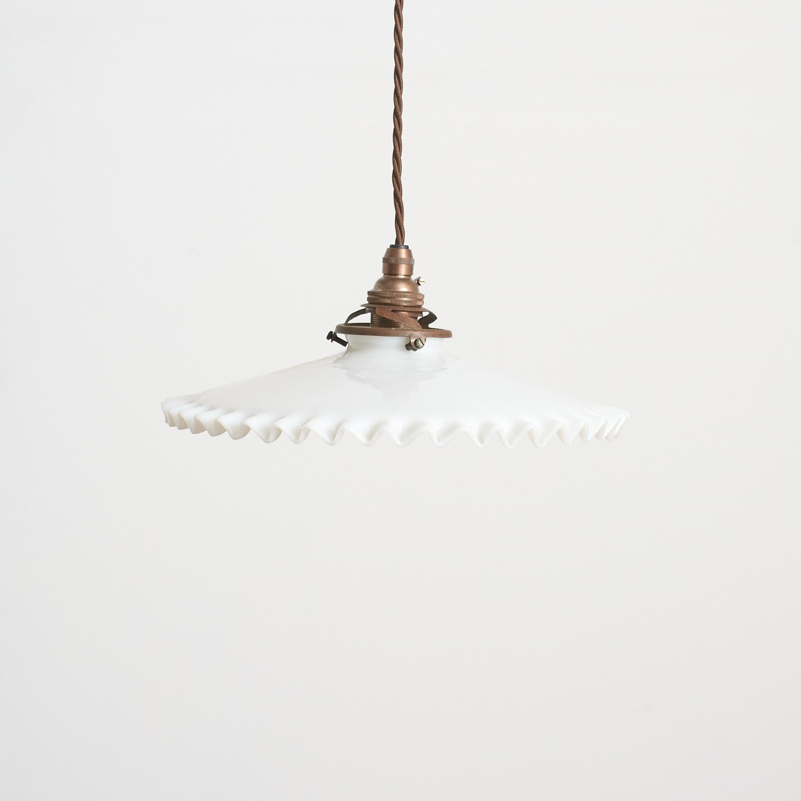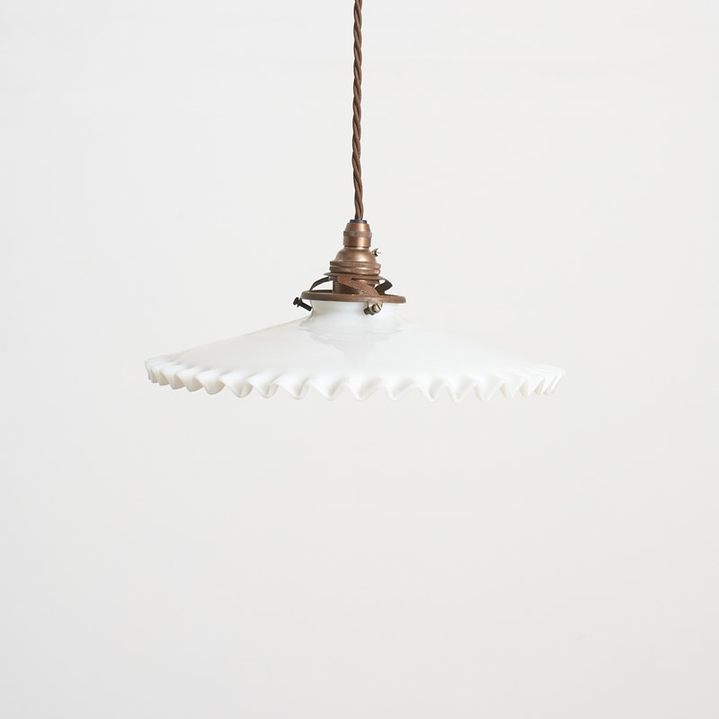 An early French glass coolie pendant light. The conical milk glass shade has been hand spun from opaque glass, the shade has a frilly edge. The light has retained its original aged brass gallery. Great as a task light in the kitchen or work room. These French shades have taken on many names over the years – ‘Pie Crust’ ‘Handkerchief’ ‘Frilly’ ‘Crinkle’