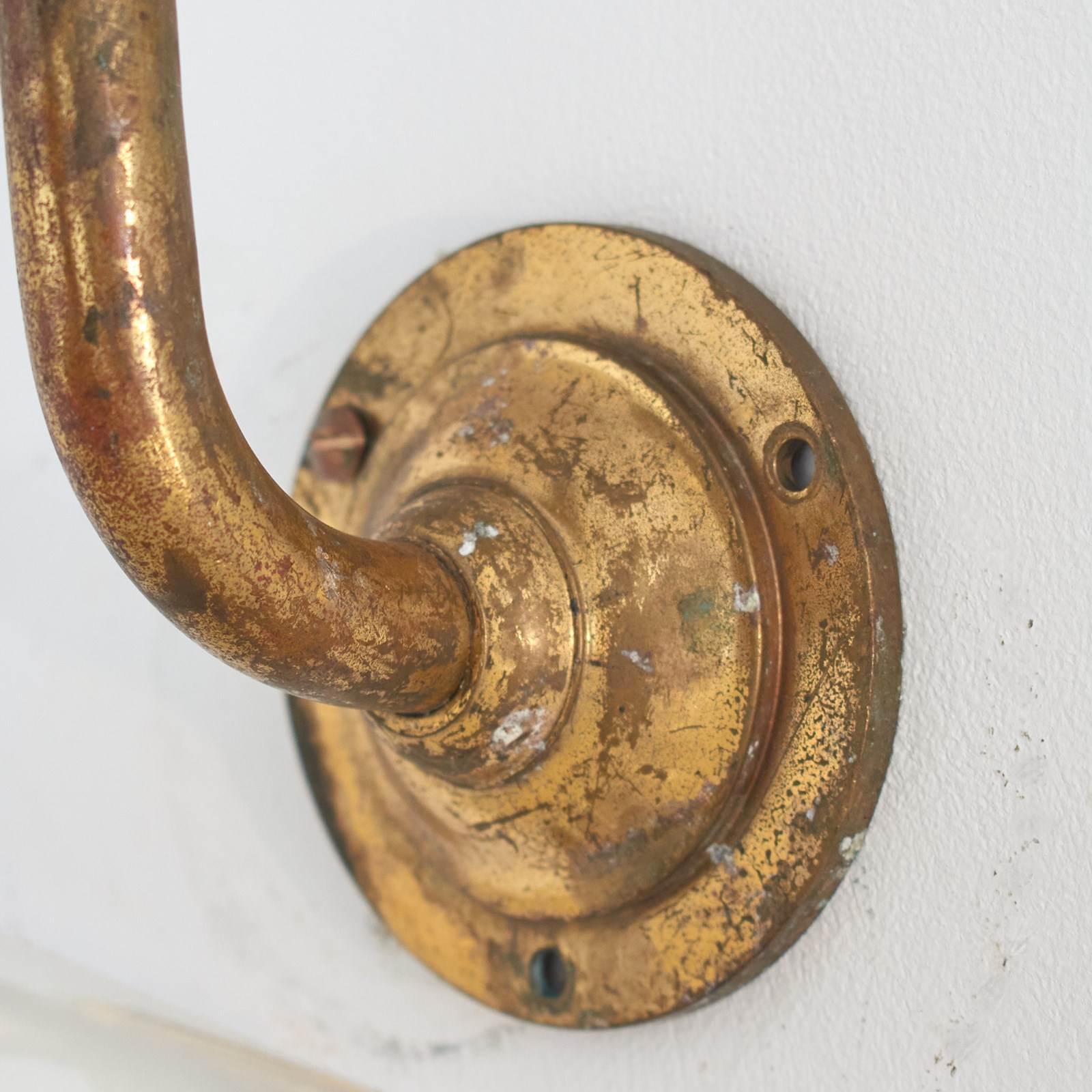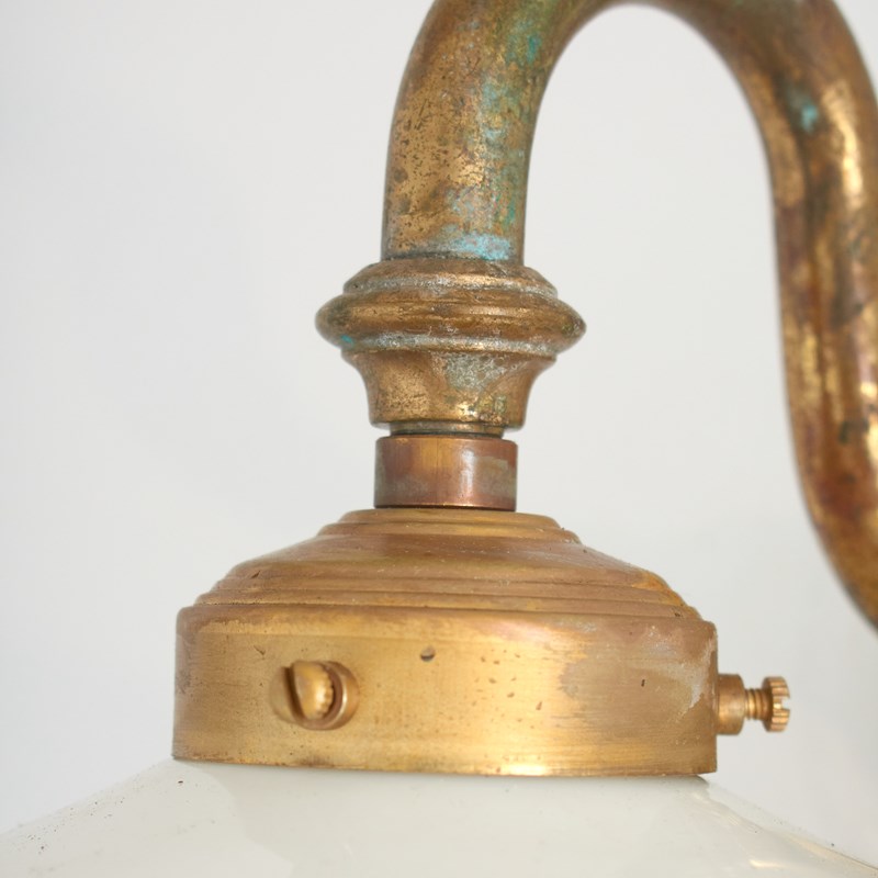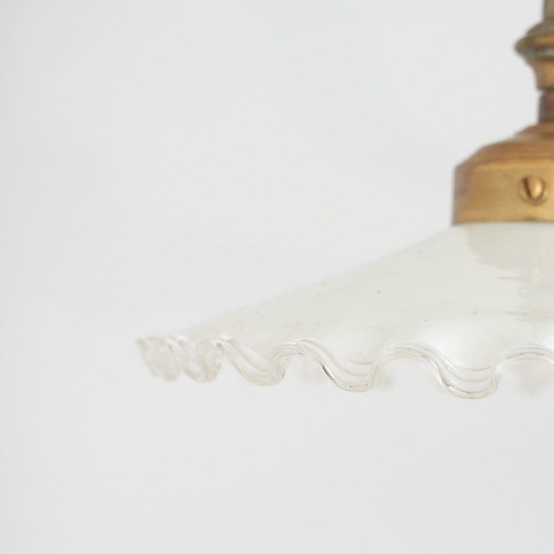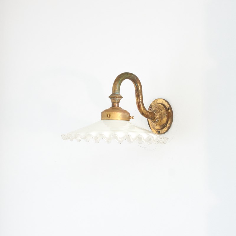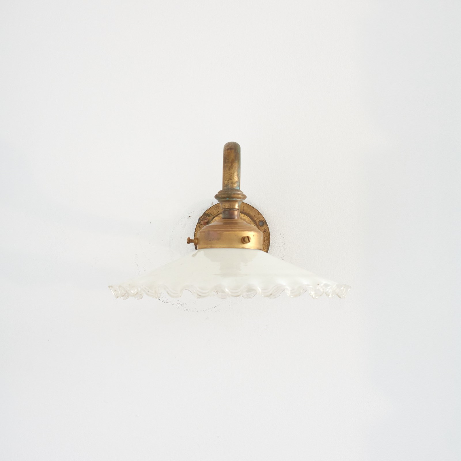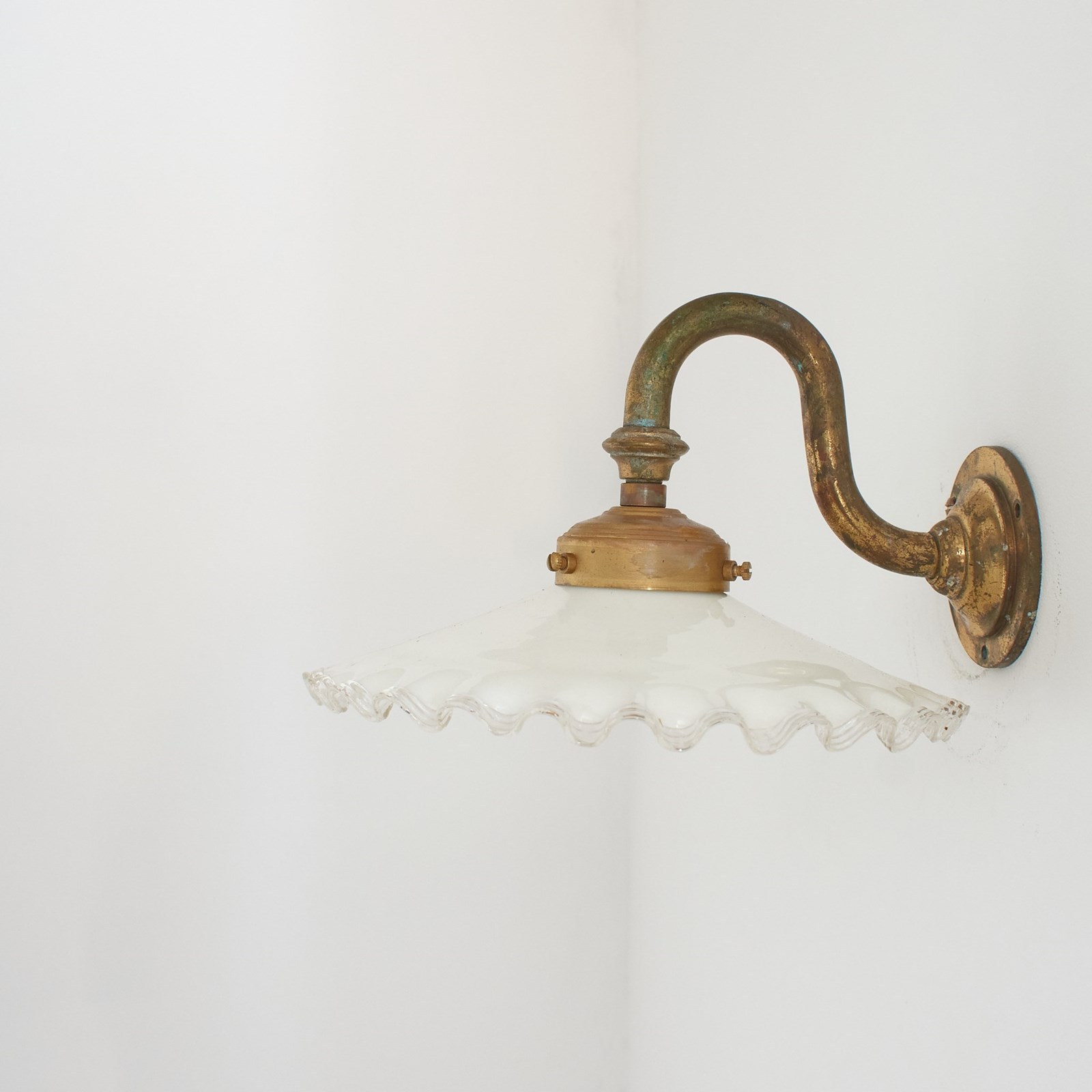 An early French glass coolie light. The frilly milk glass shade has been hand spun from opaque glass. The light has an aged brass gallery and wall fitting. Great as a task light in the kitchen or work room.