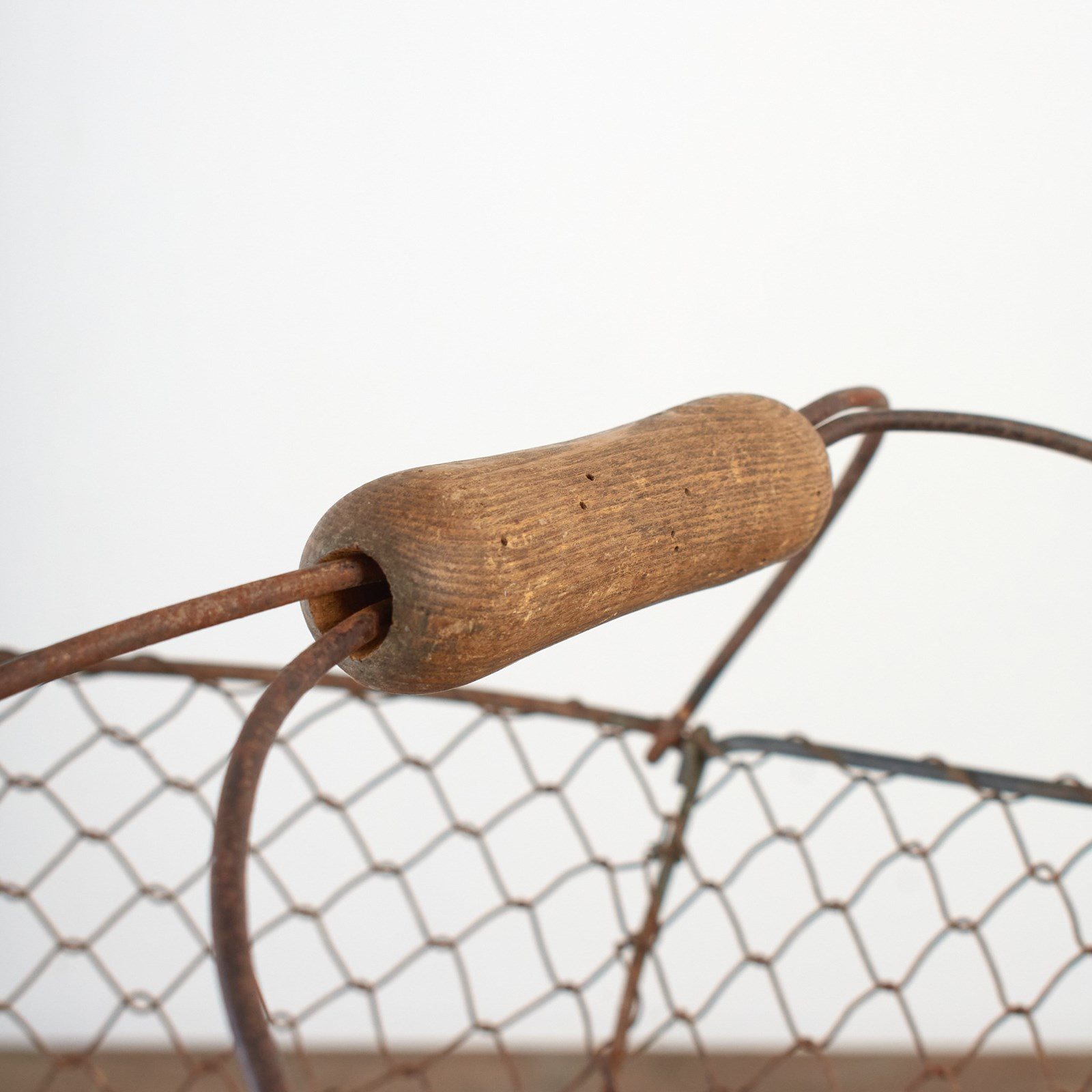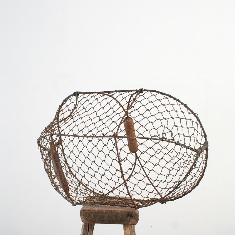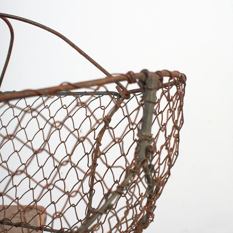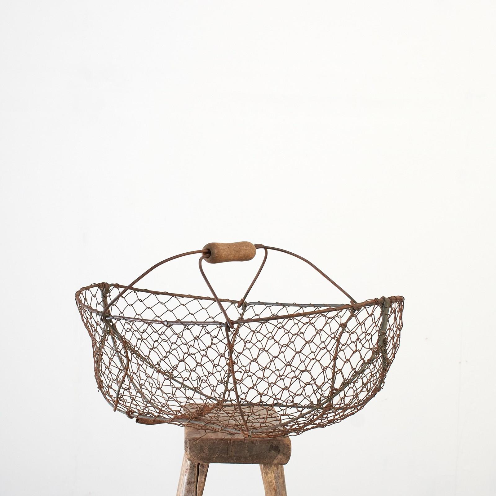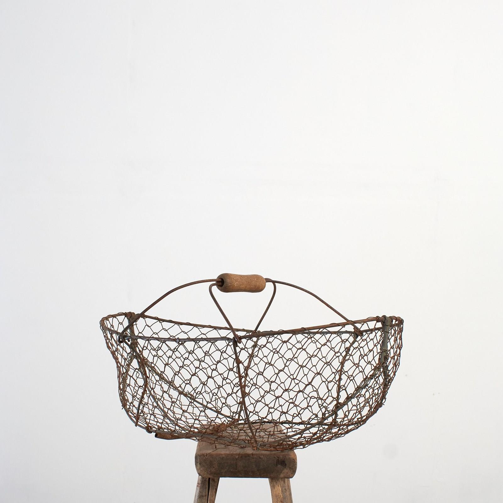 A practical vintage wire garden basket constructed from galvanised wire mesh with wire handle supports and a wooden handle.