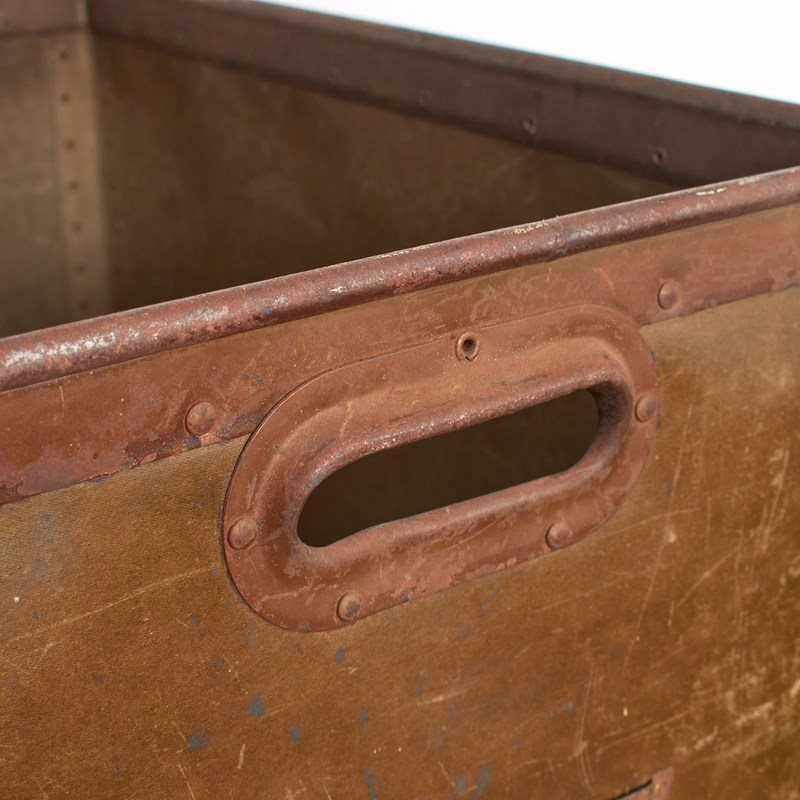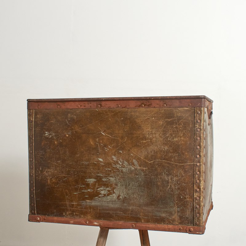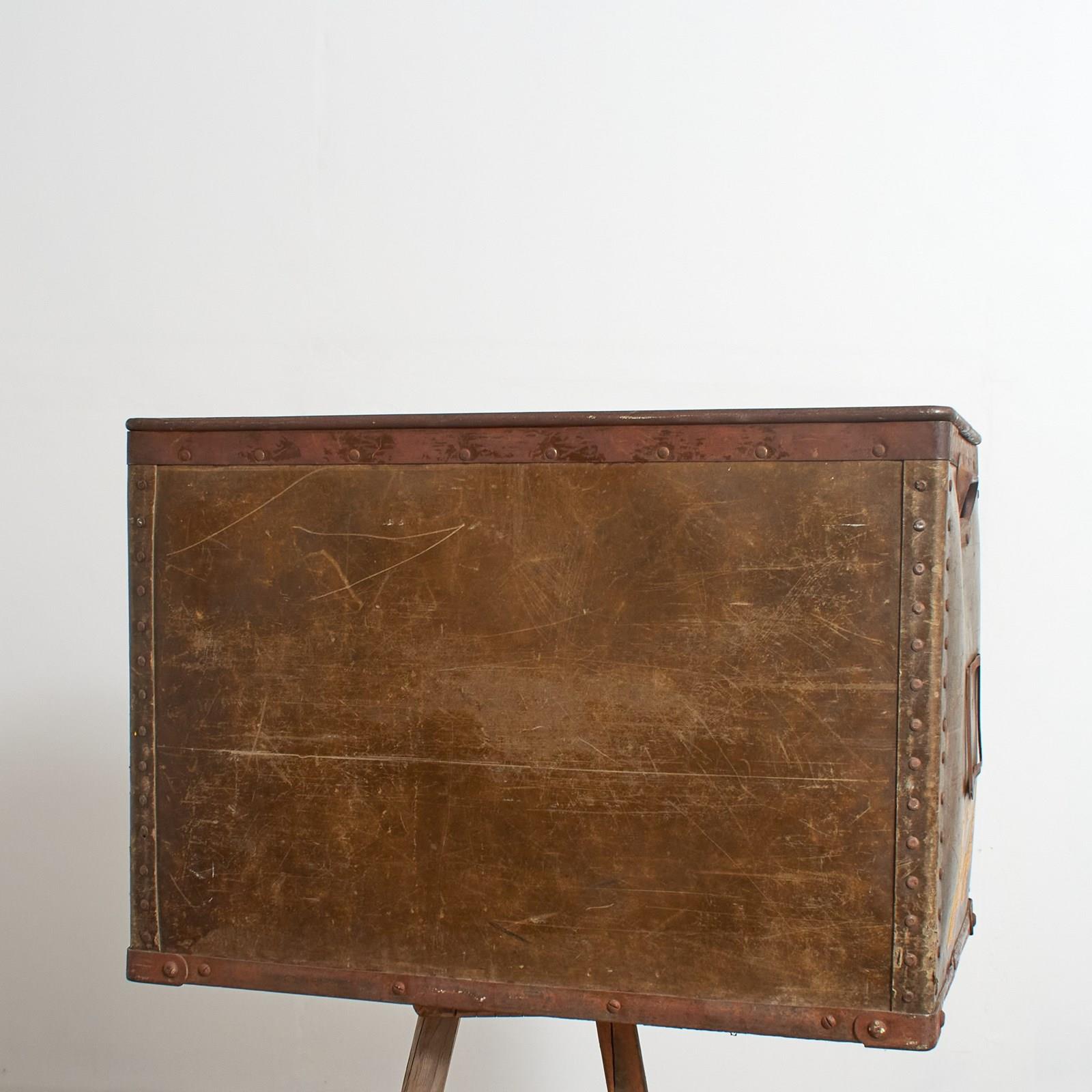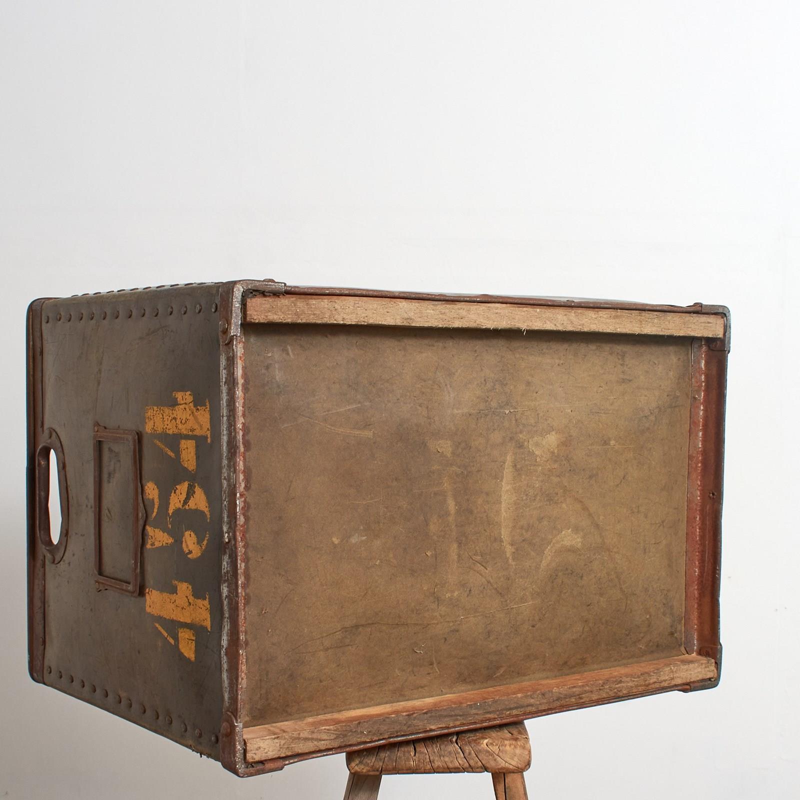 The box has practical carry handles and is sturdy with riveted corners and metal rim to the top and bottom. The base also has the original wooden supports.