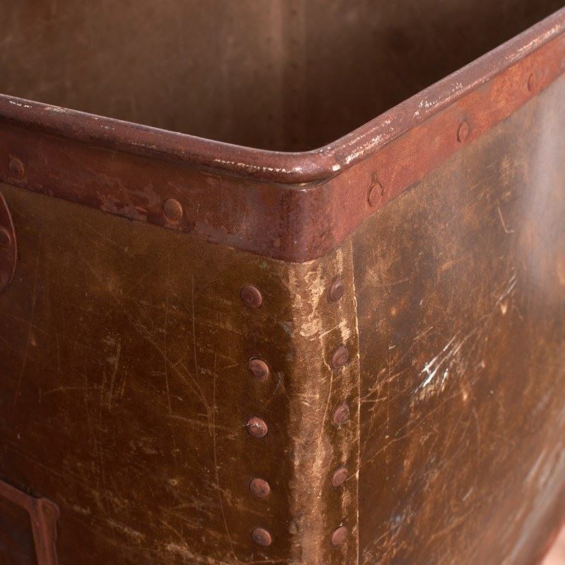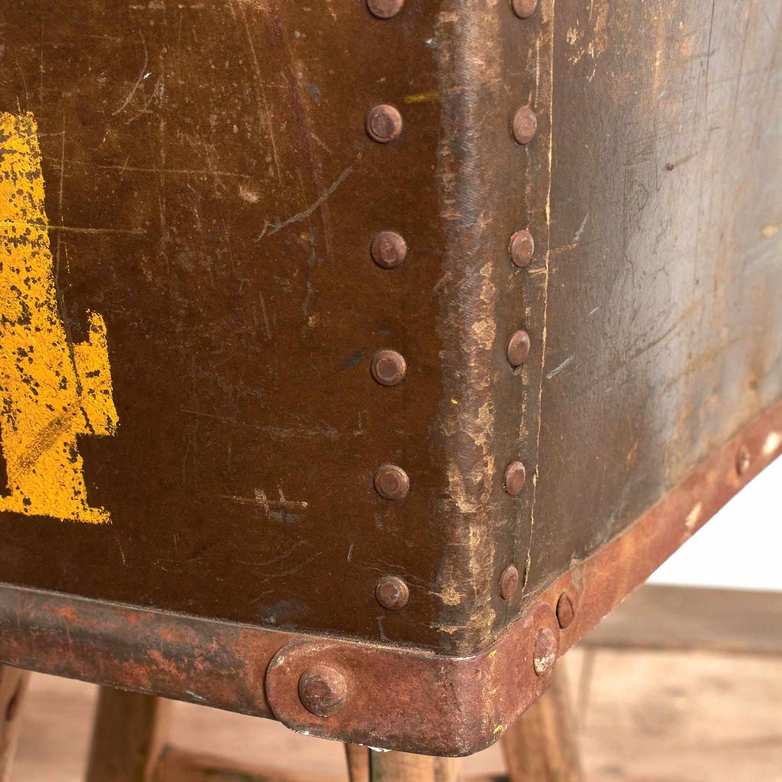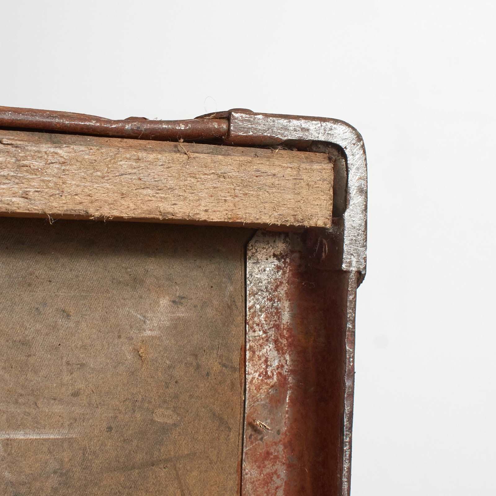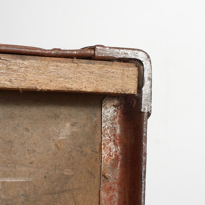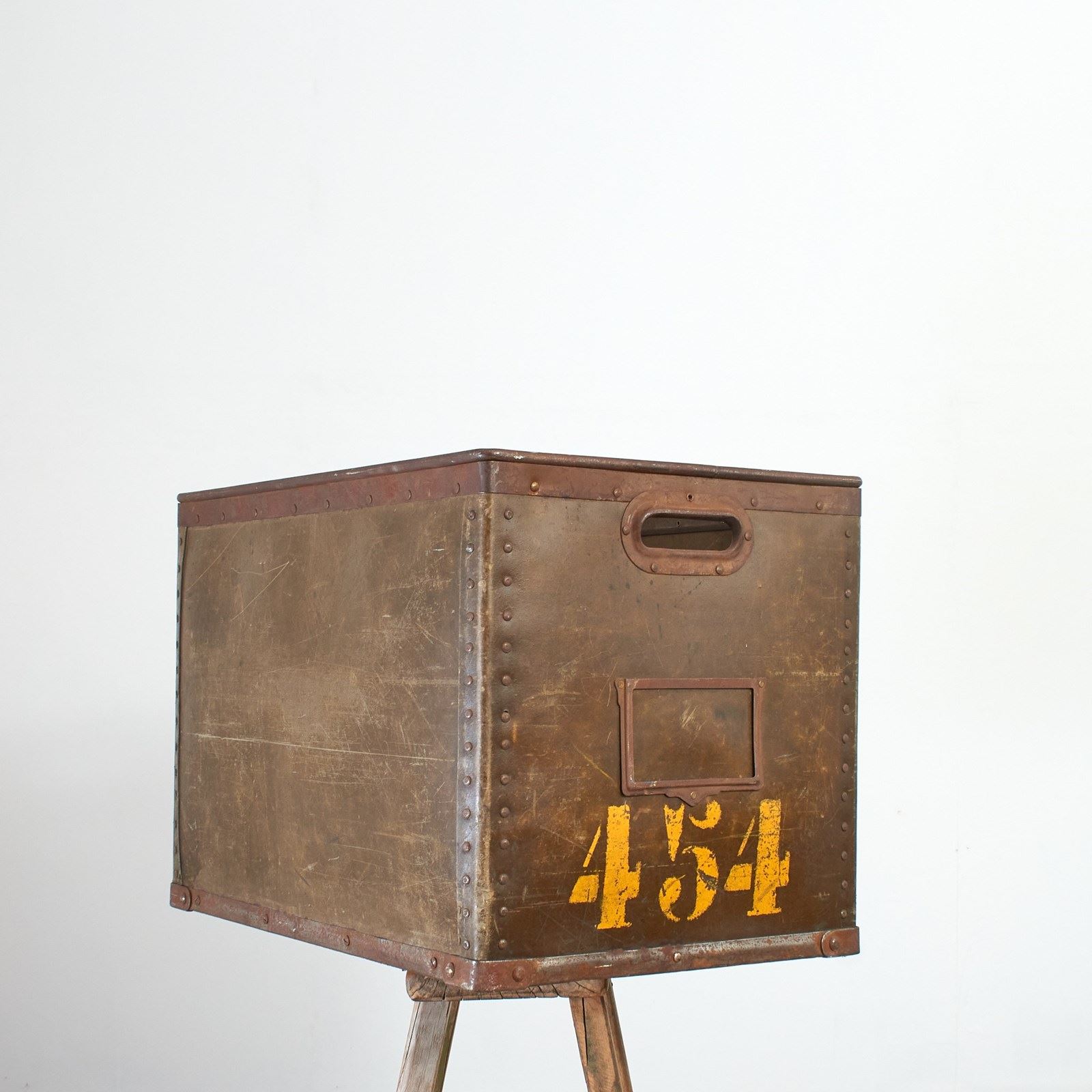 The box has practical carry handles and is sturdy with riveted corners and metal rim to the top and bottom. The base also has the original wooden supports.