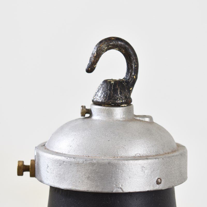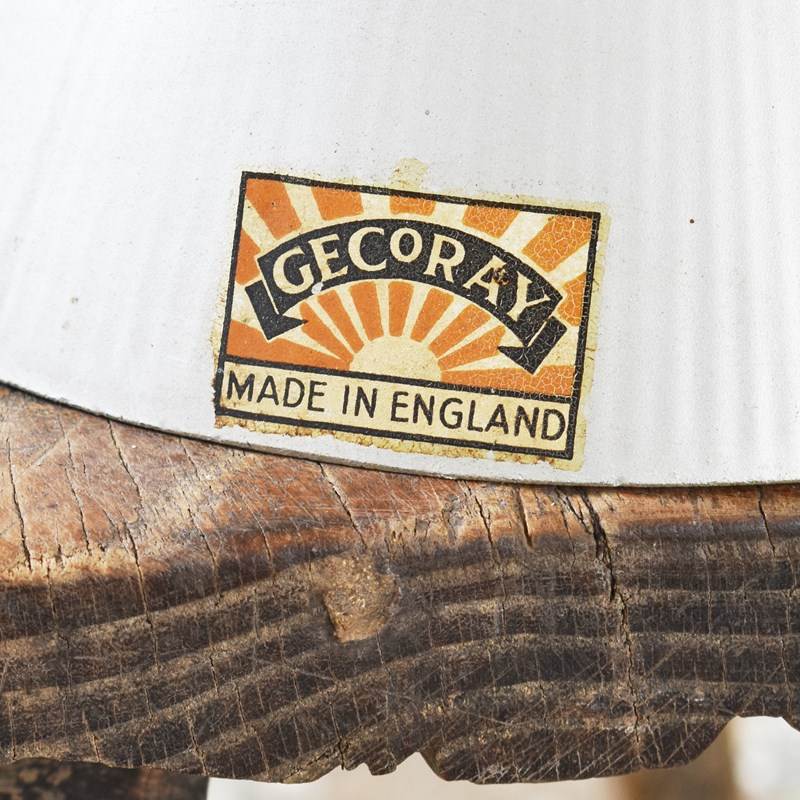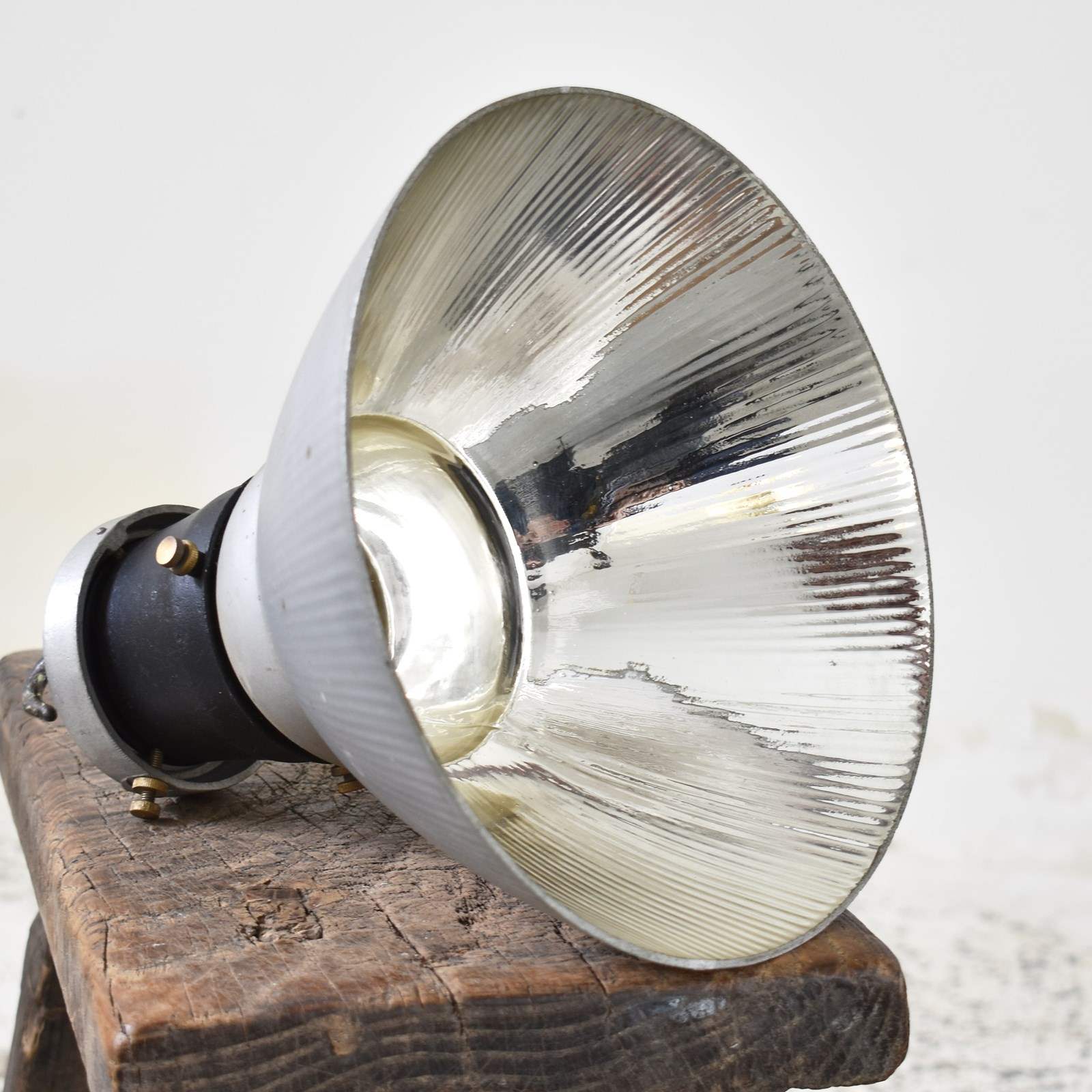 An early silver backed glass wall light by British manufacturer ‘GEC’ entitled the ‘GECoRAY’.It retains a cast aluminium and steel gallery fitting. The glass shade left in untouched original condition, has a grey painted exterior finish and the interior is mirrored finish. These lights were scientifically designed for the illumination of shop windows after hours and formed part of a range of reflectors of superior quality.