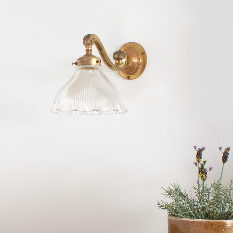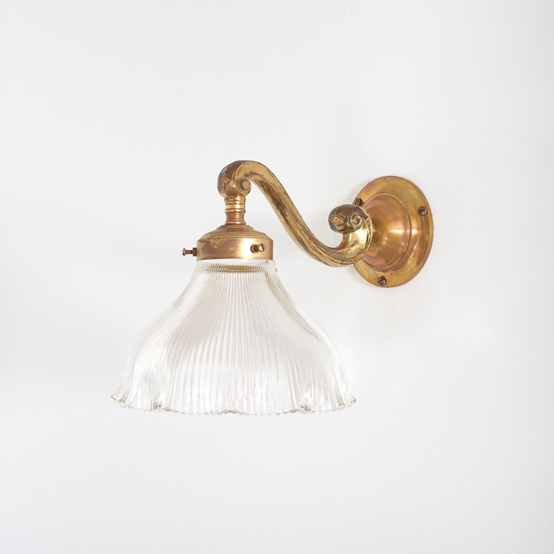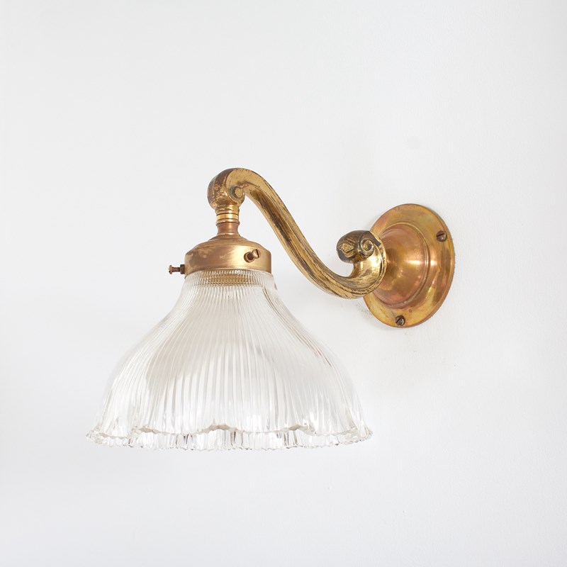 A vintage bell shaped glass prismatic light shade which looks great both lit and unlit. The light has retained its original brass gallery and wall bracket, which has some great age and painta. The glass shade isn’t stamped with any makers mark but this design of glass shade was typically manufactured by GEC. The light shade has an ‘focusing’ type shape.