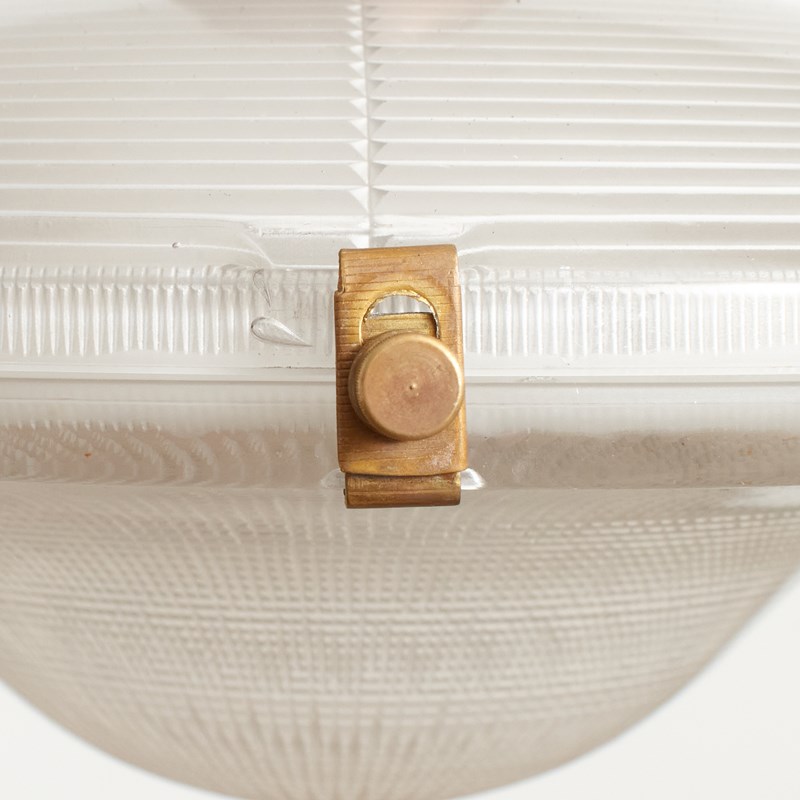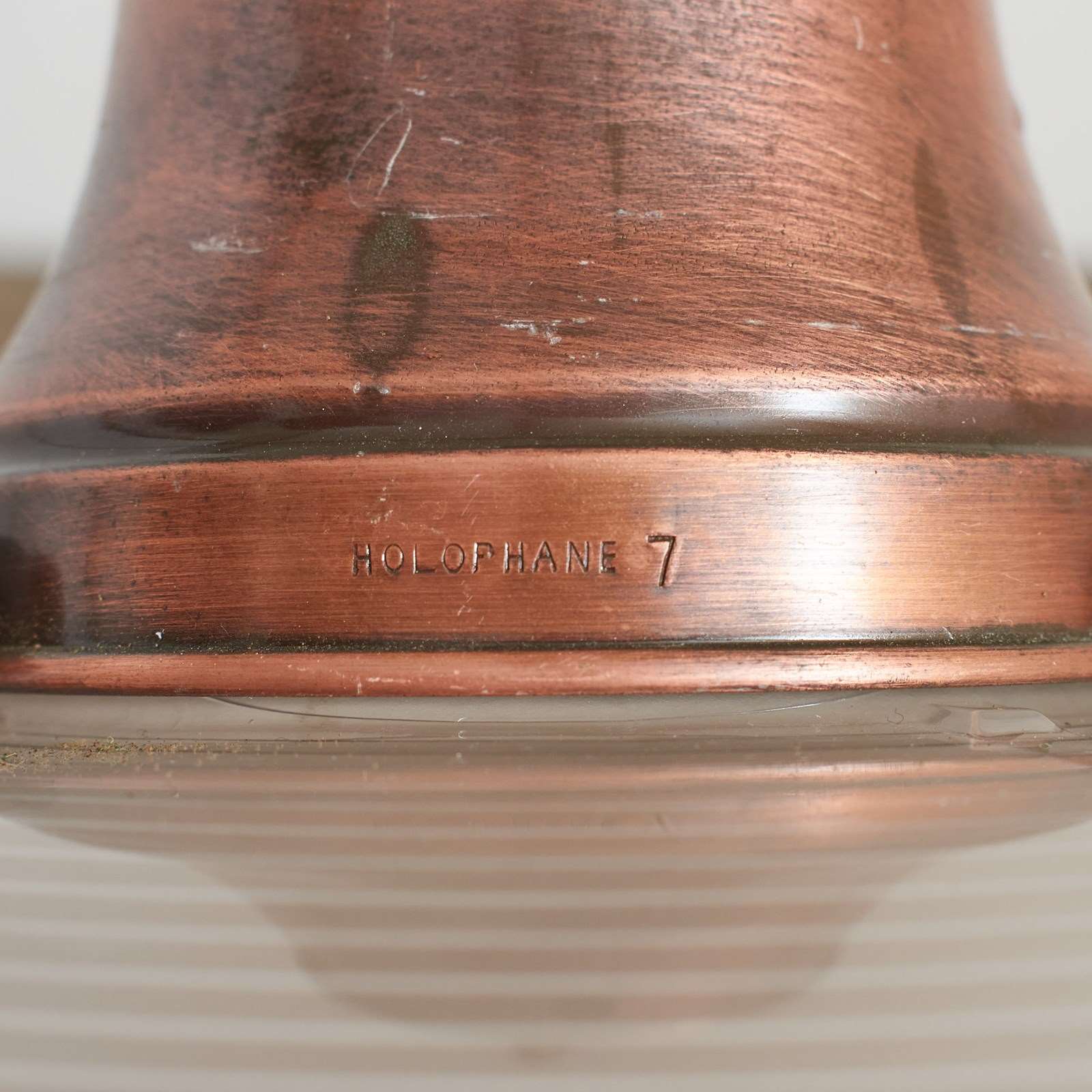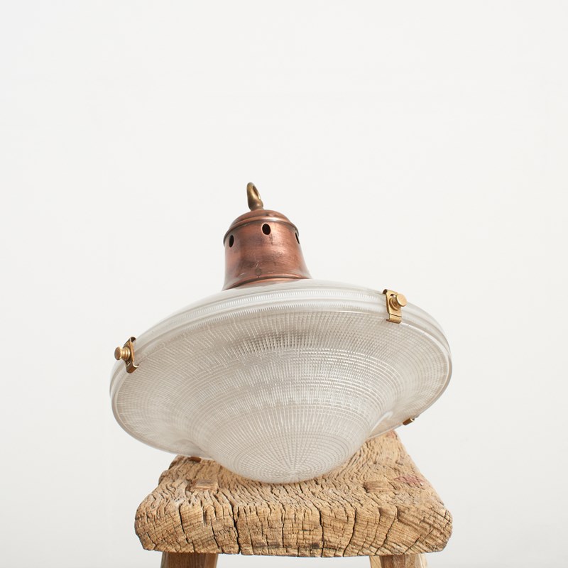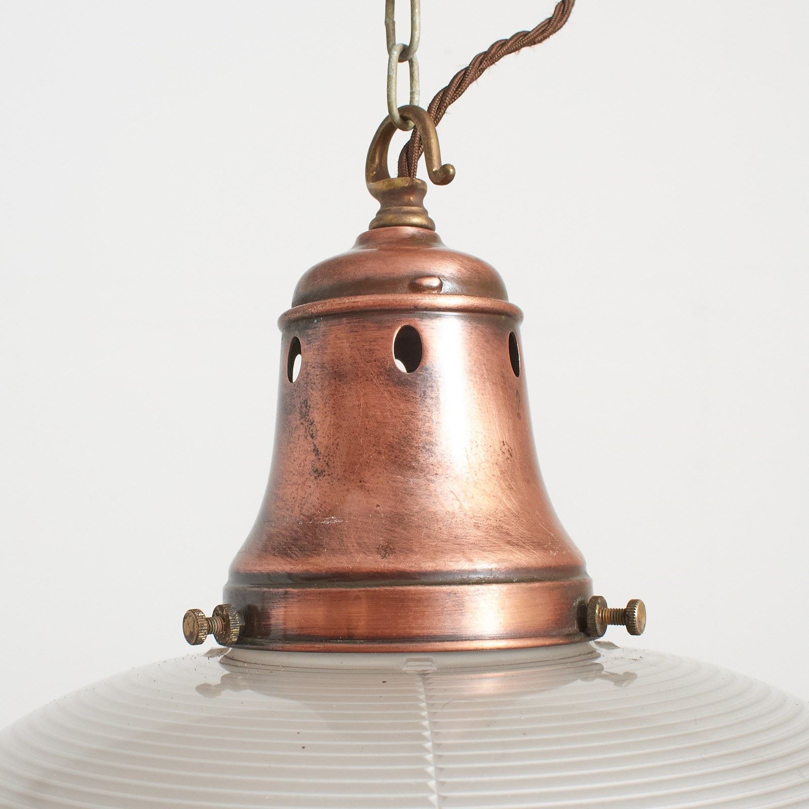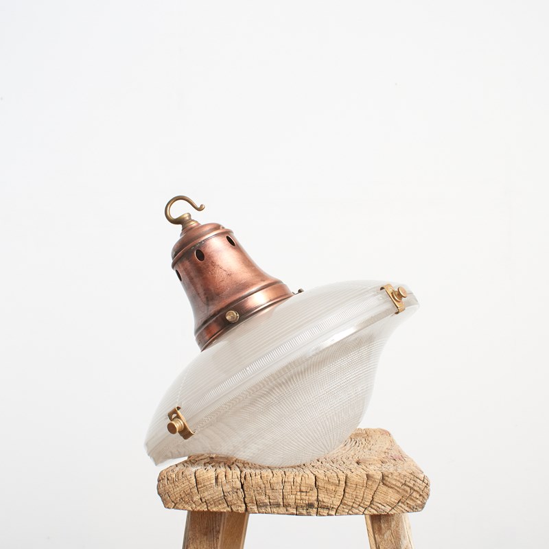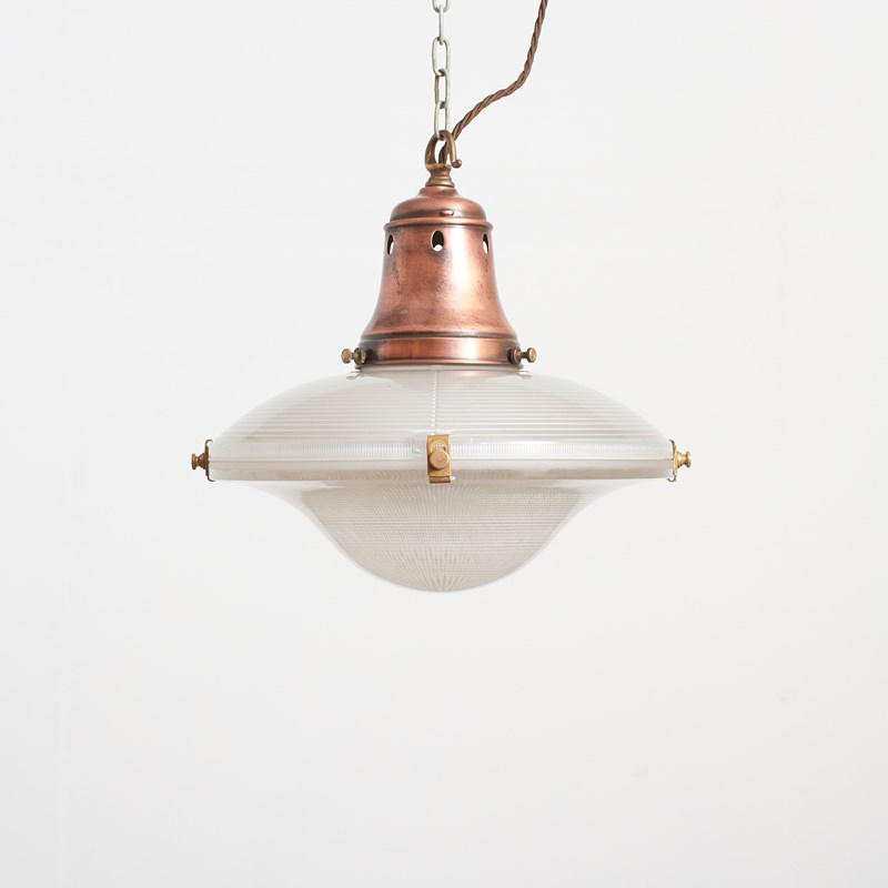 A prismatic glass pendant light Manufactured by ‘Holophane’. The light has retained its original coppered brass metal gallery, stamped with its model number ‘Holophane 7″. The shade consists of 2 glass parts retaining original cast makers mark around the neck rim. Four brass clips hold the shades in place.