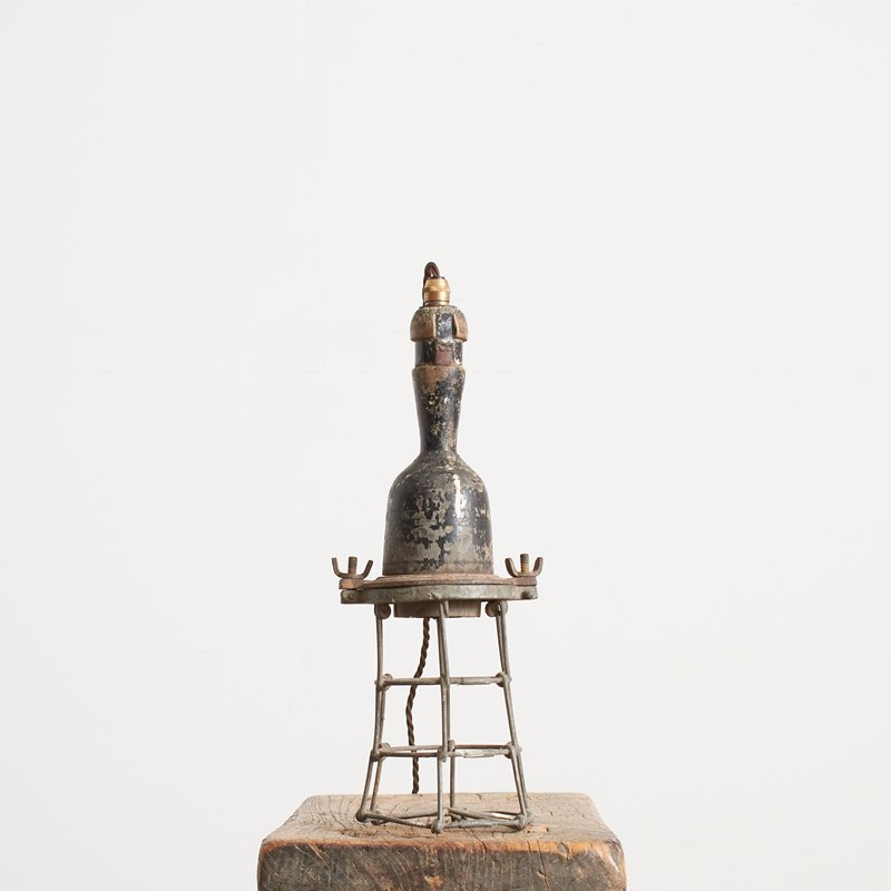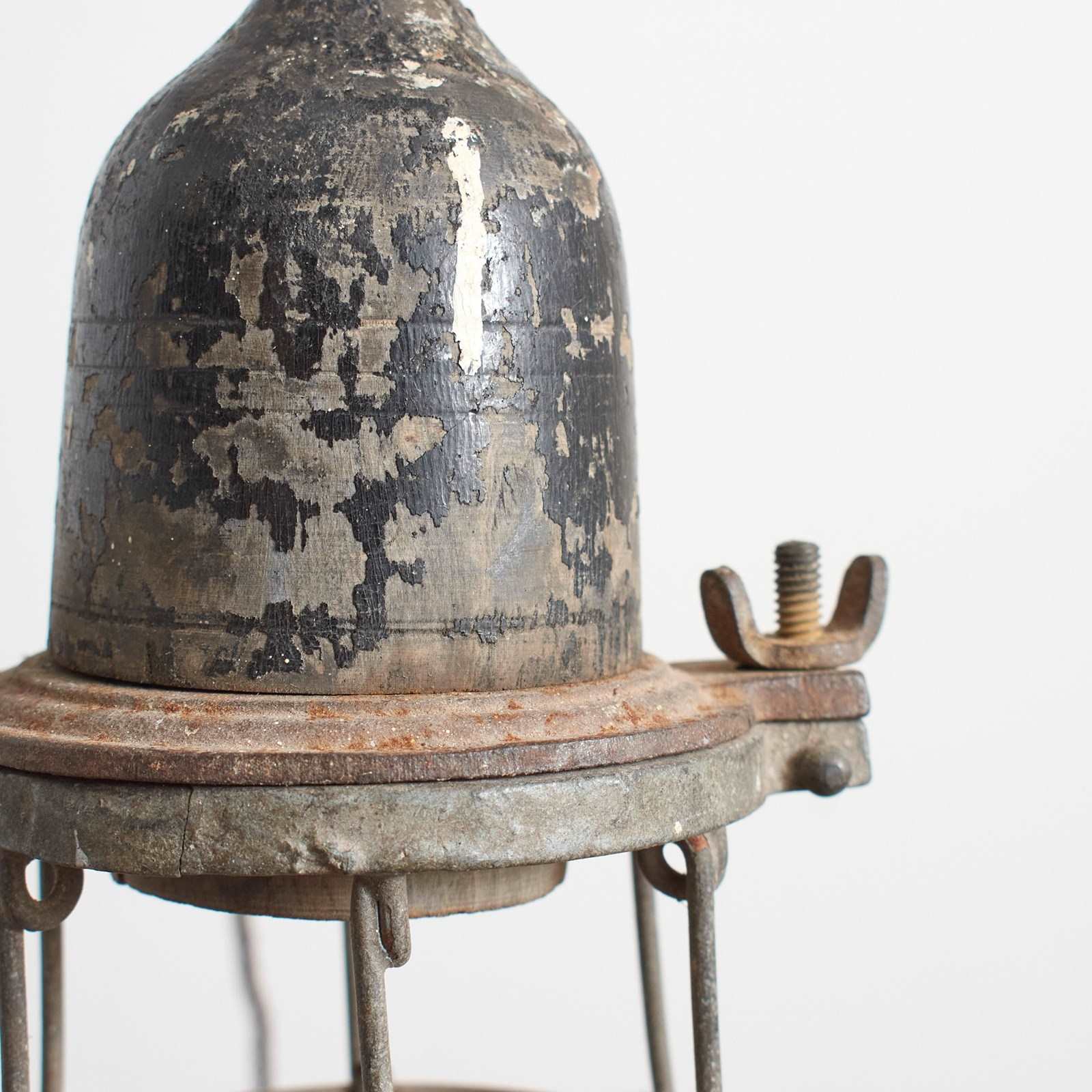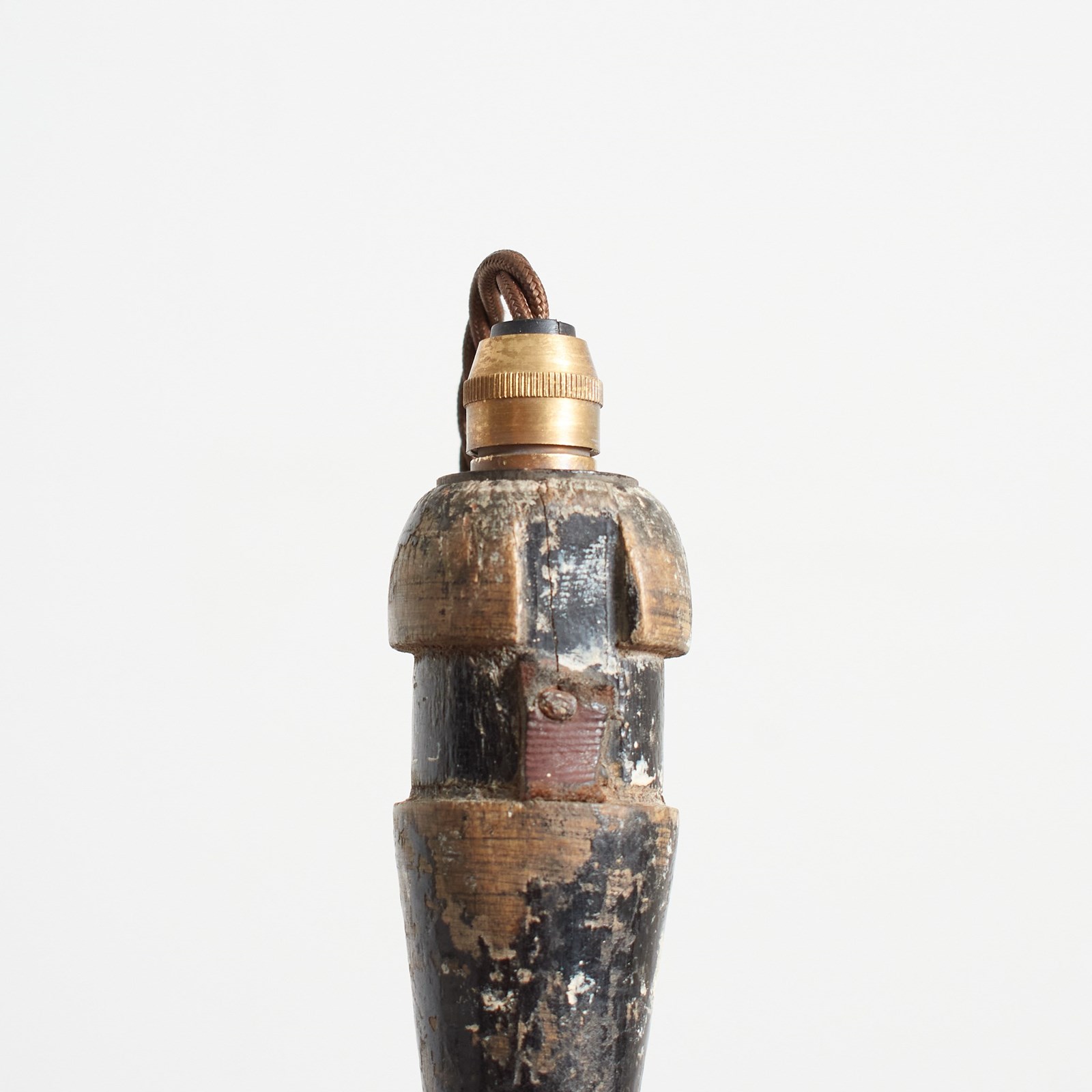 Workshop Report: The light has been left in its original condition, the wood and metal work will have age related markings. The lamp has new CE certified electrical fittings, a E27 (Screw) bulb holder, inline on/off switch and 3amp 3 pin plug.