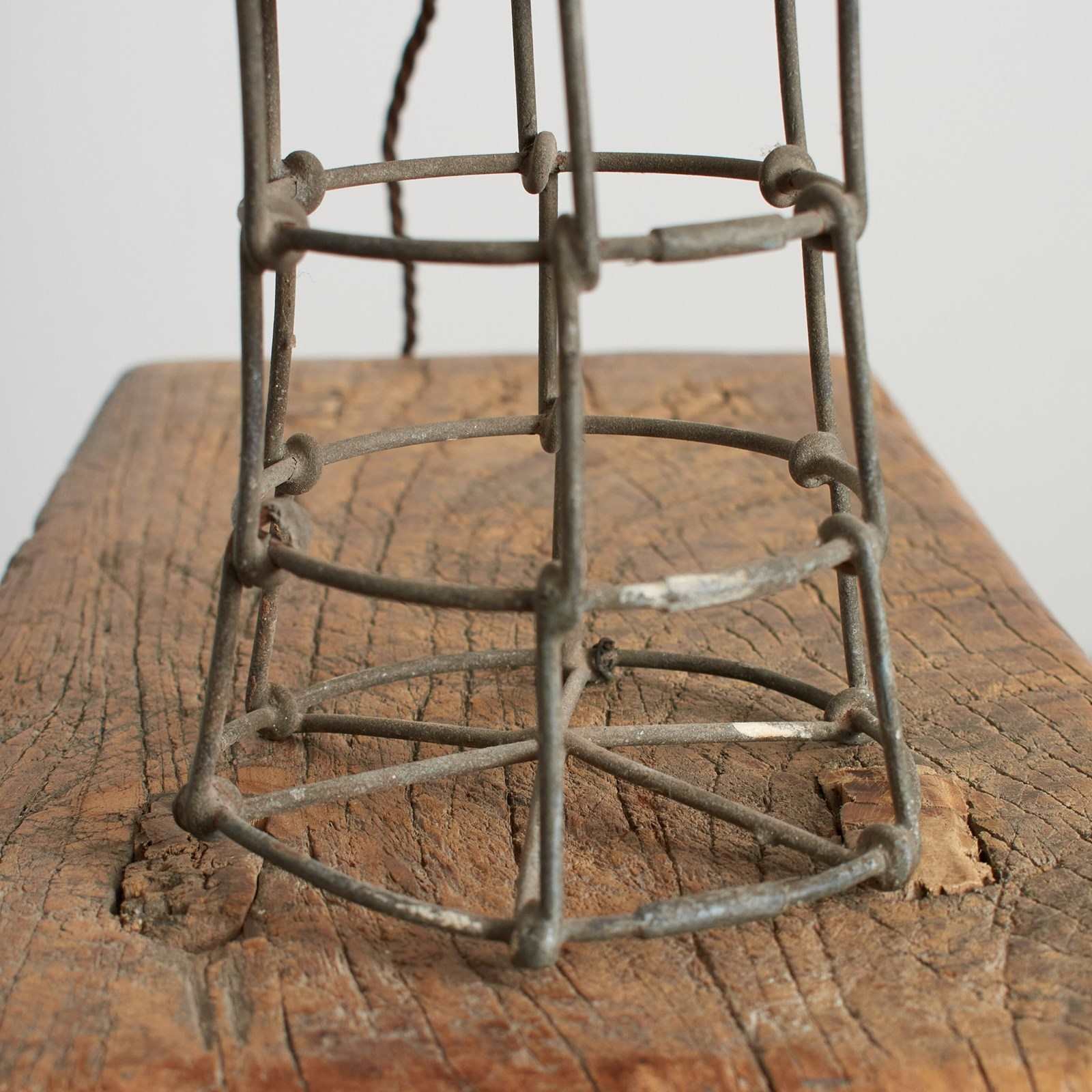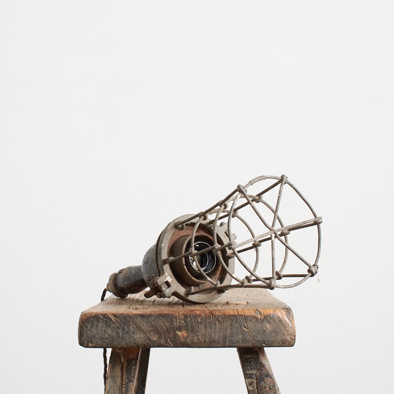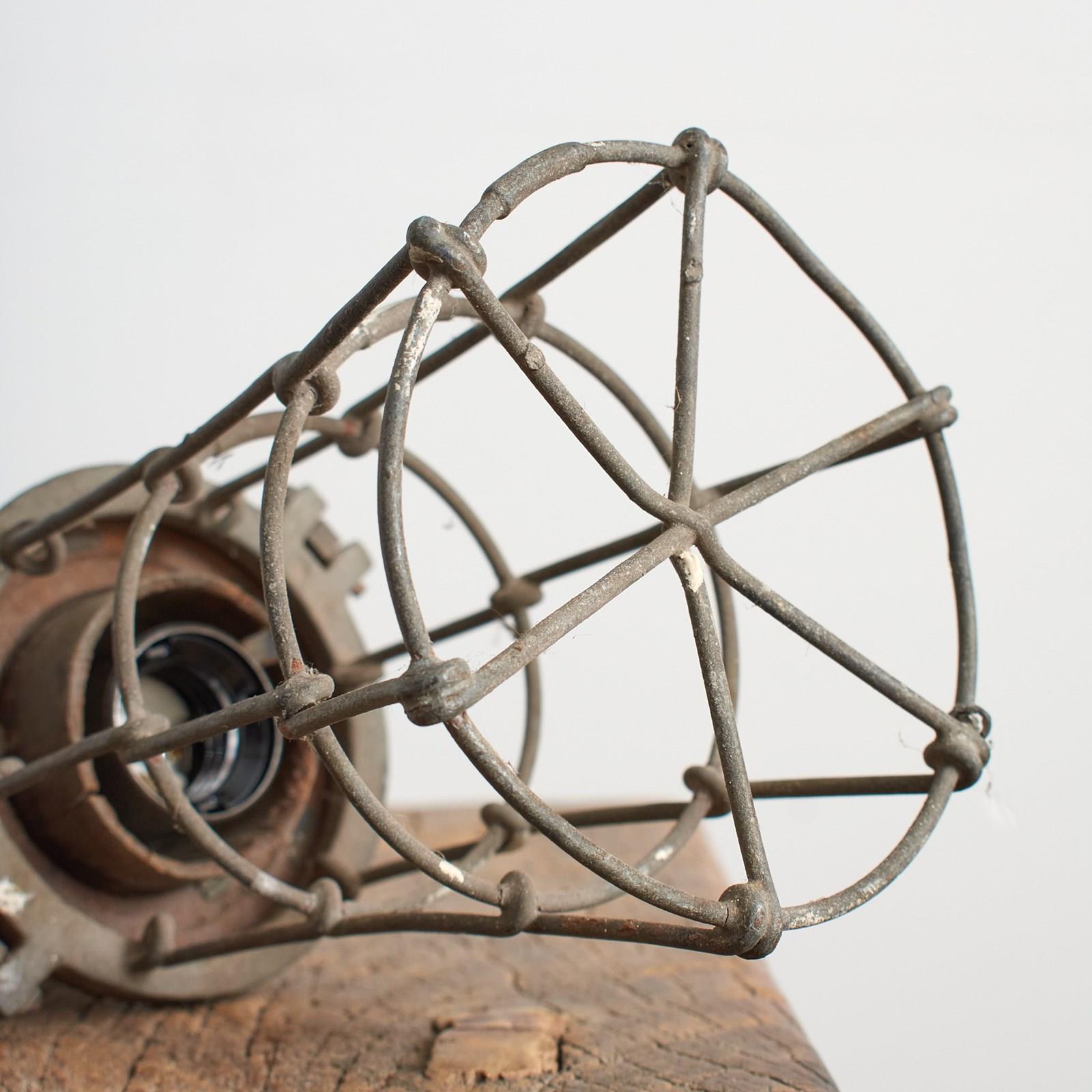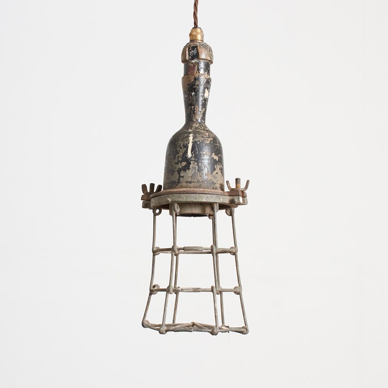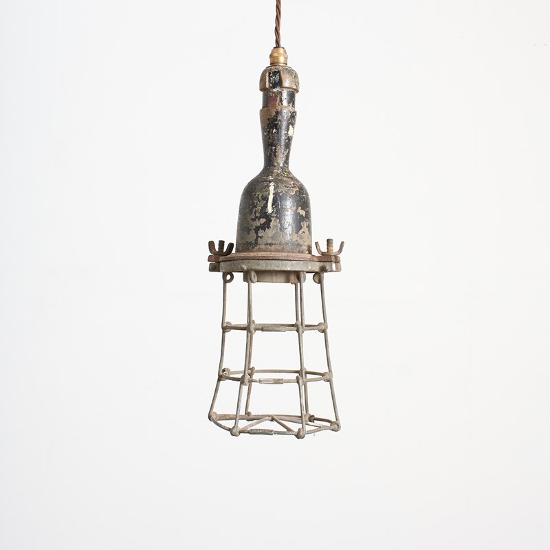 An antique inspection lamp salvaged from a Hampshire workshop, the lamp retains its original wooden handle and protective metal cage. The cage opens at the end to remove the bulb. The light has been rewired with new components and can be used as a pendant or desk lamp.