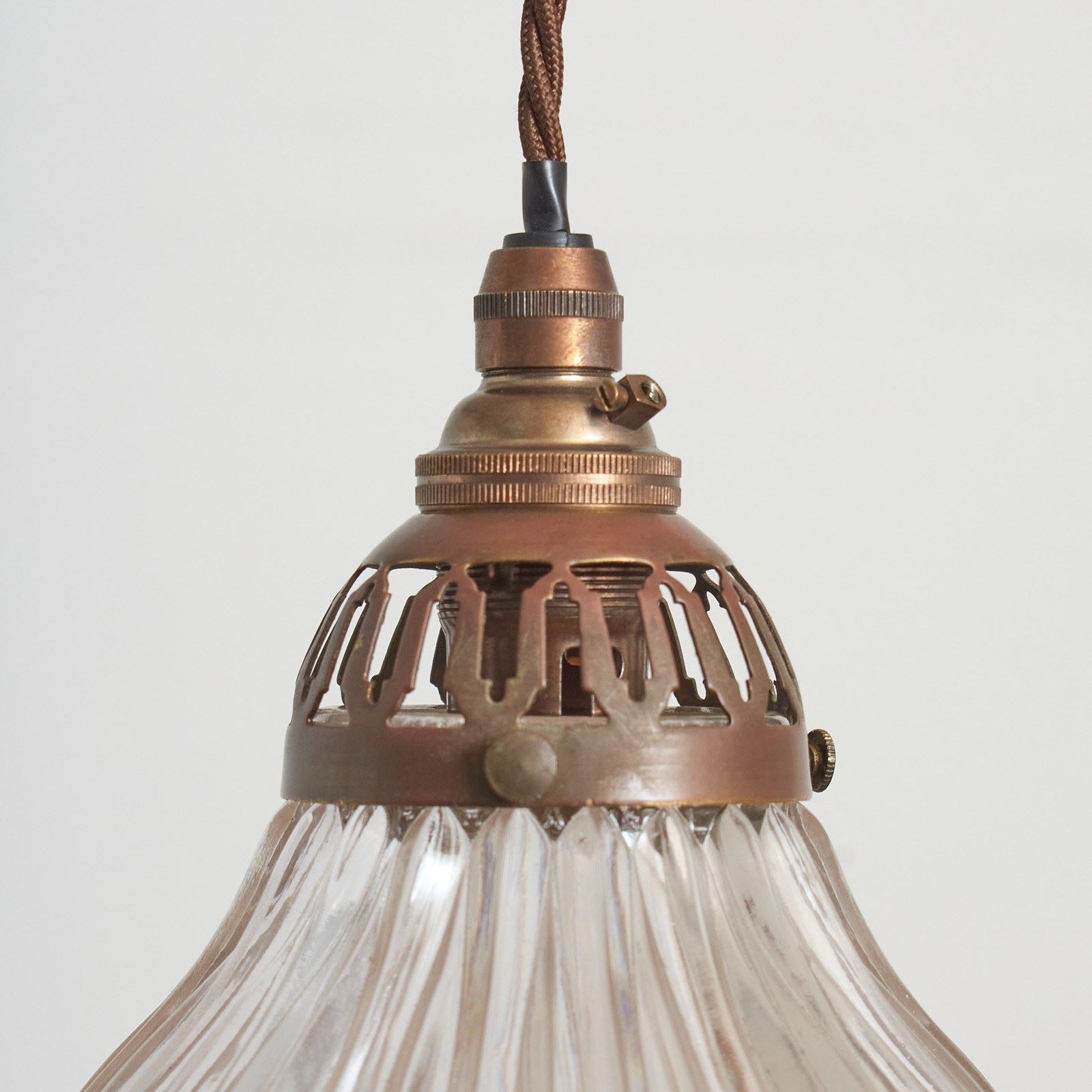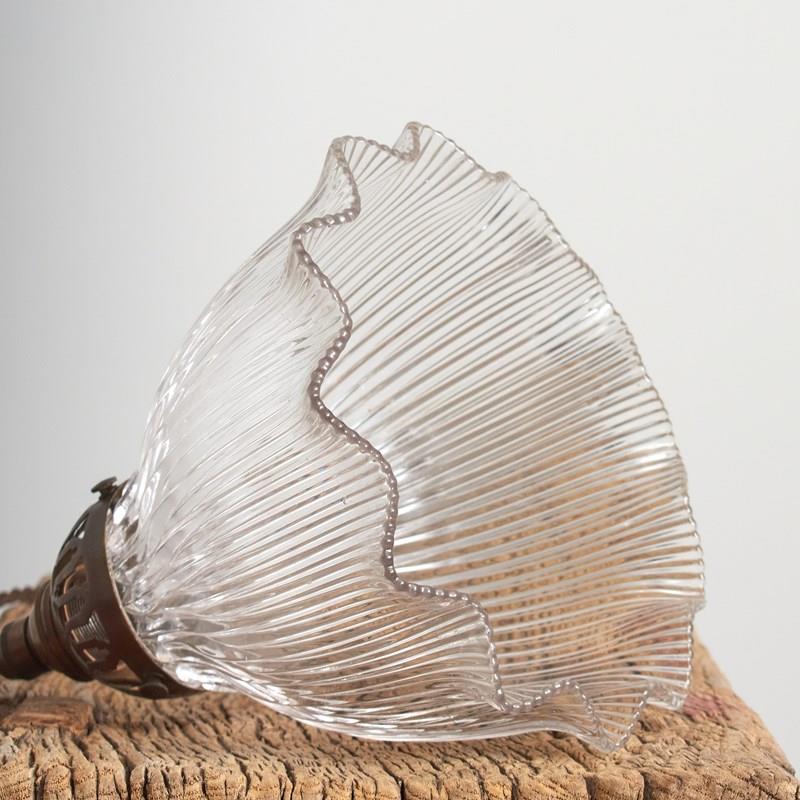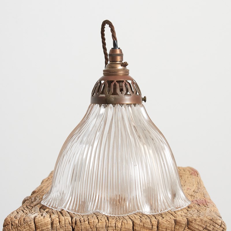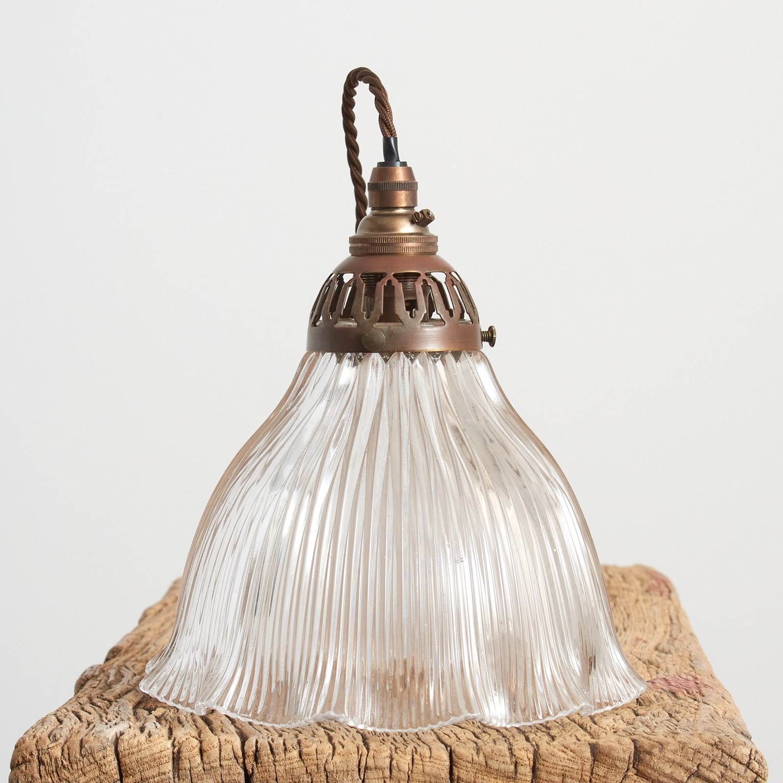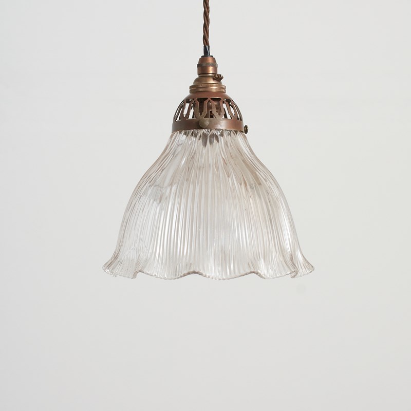 A vintage bell shaped glass prismatic pendant light shade which looks great both lit and unlit. The light has retained its original coppered brass gallery, which has some great age and painta. The glass shade is stamped with the ‘Holophane’ makers mark on the glass neck rim under the gallery. The light shade is 7″ and has an ‘intensive’ type shape.