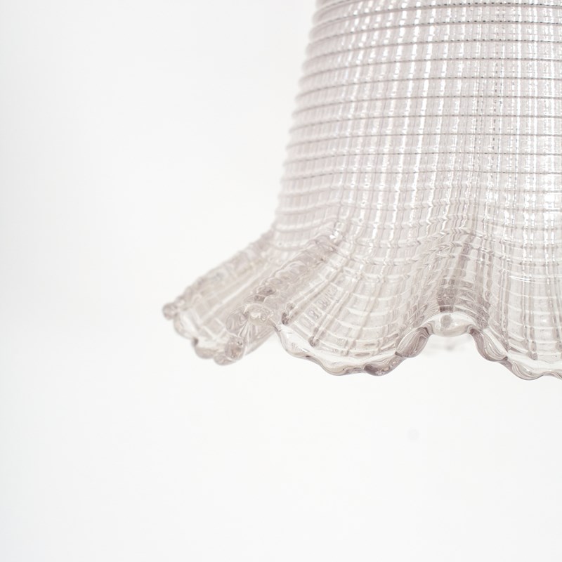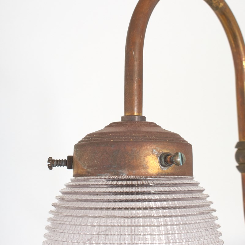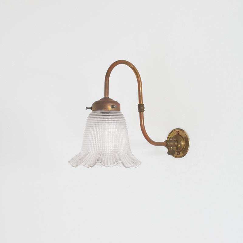 An original bell shaped frilly glass prismatic light shade originally from an old chapel. The light has retained its original brass wall bracket, which has some great age and painta. The original glass shade is stamped with its makers mark and manufactured by Holophane.