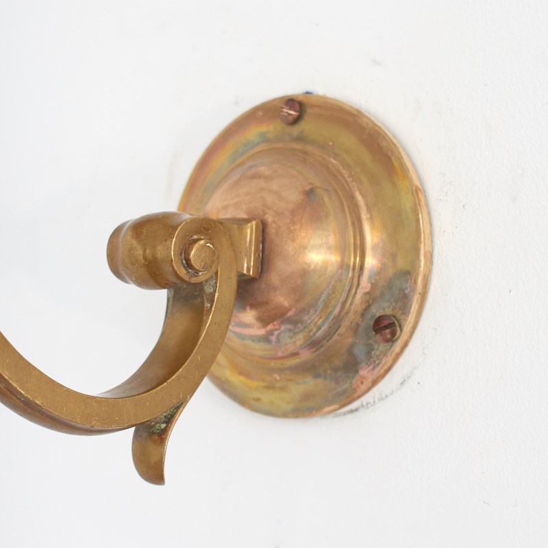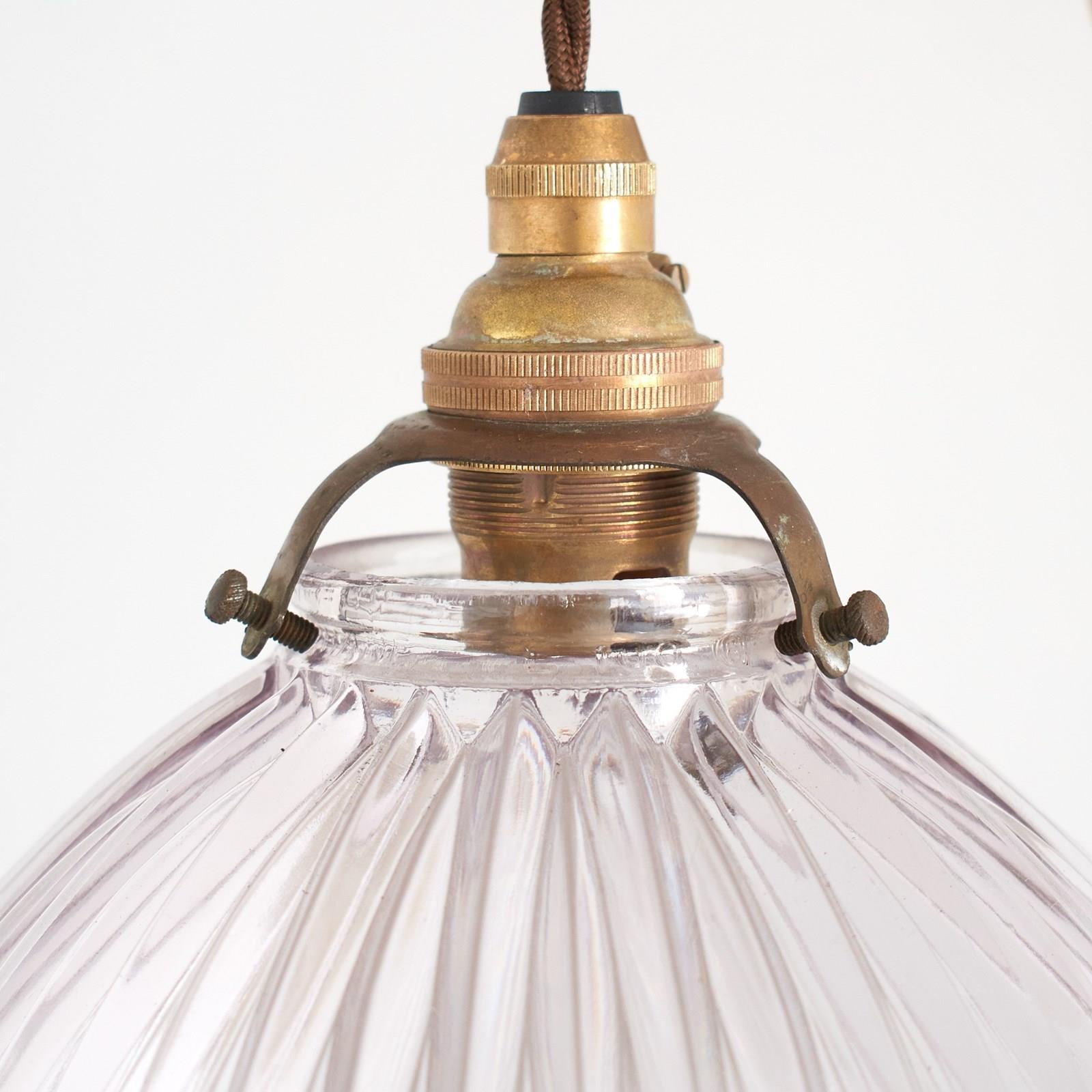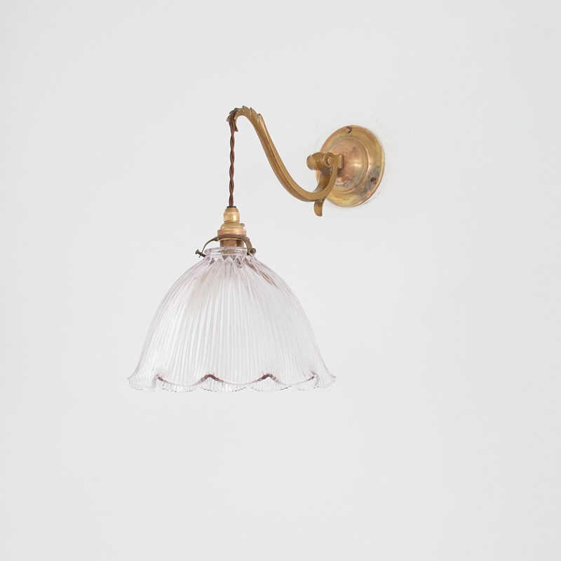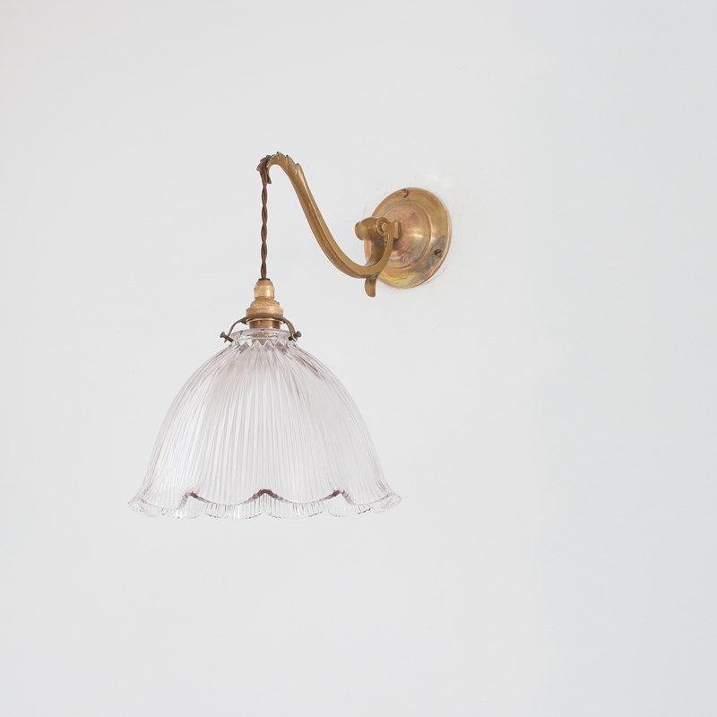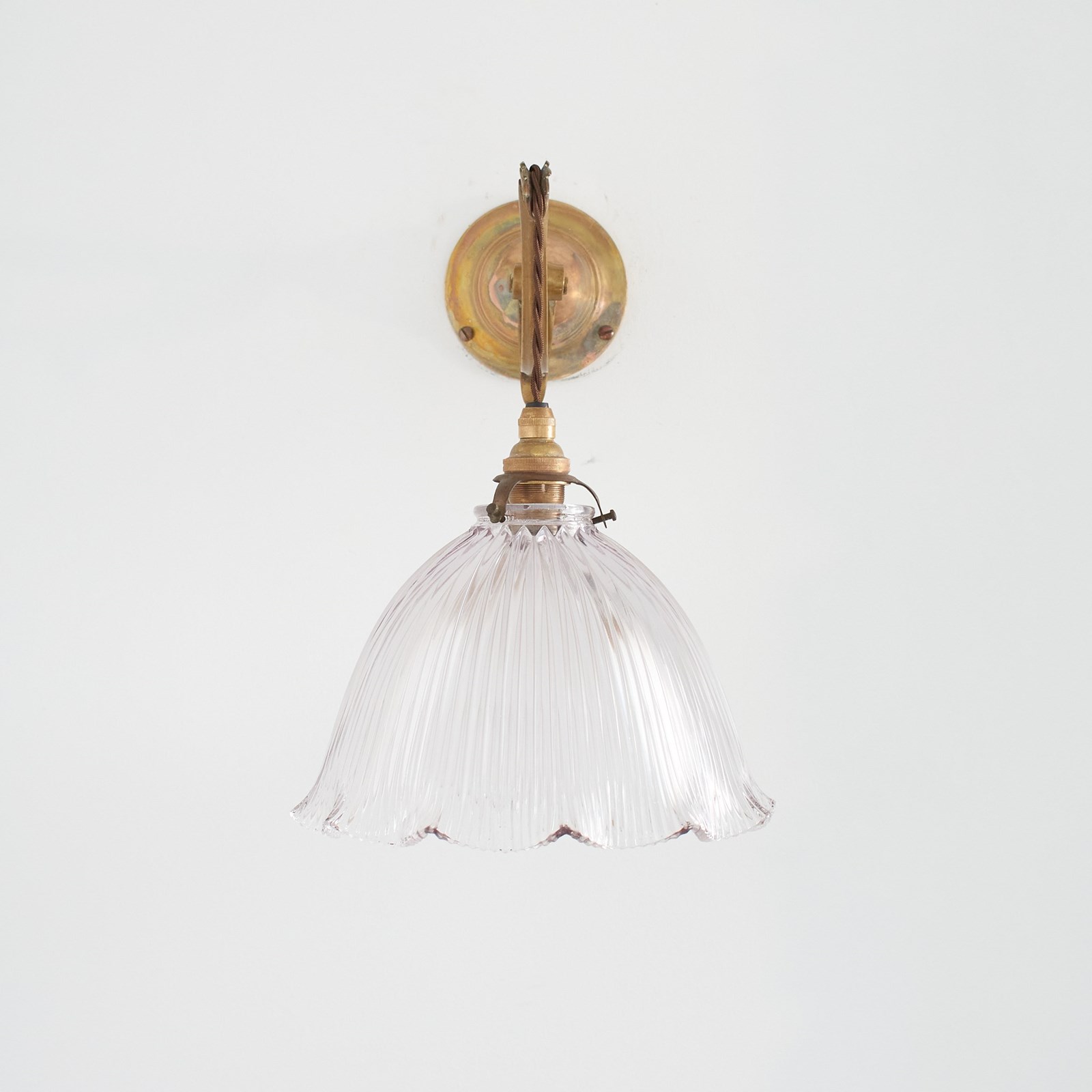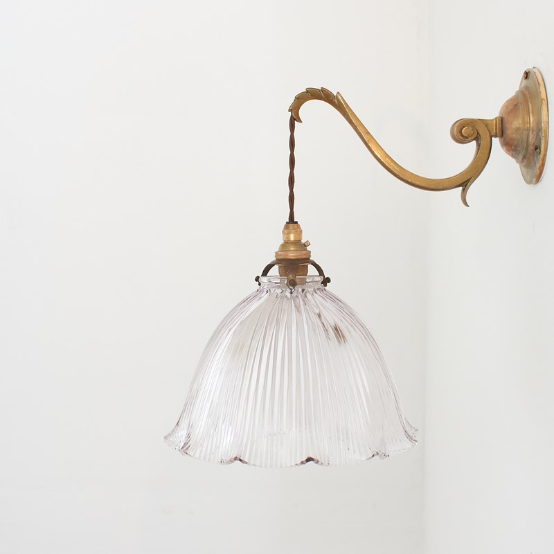 An antique frilly glass prismatic pendant light shade retaining its original brass wall bracket, which has some great age, painta and some rather elegant detailing to the front. The glass shade is stamped with its original makers mark ‘Holophane’ on the neck of the shade. The light shade has an ‘focusing’ type shape. The flex length can be adjusted if required.