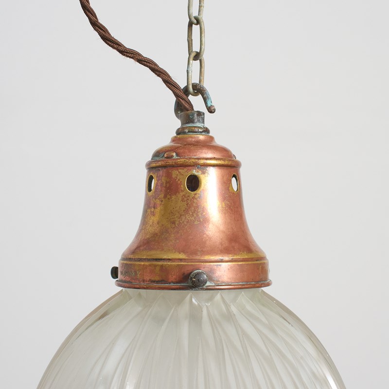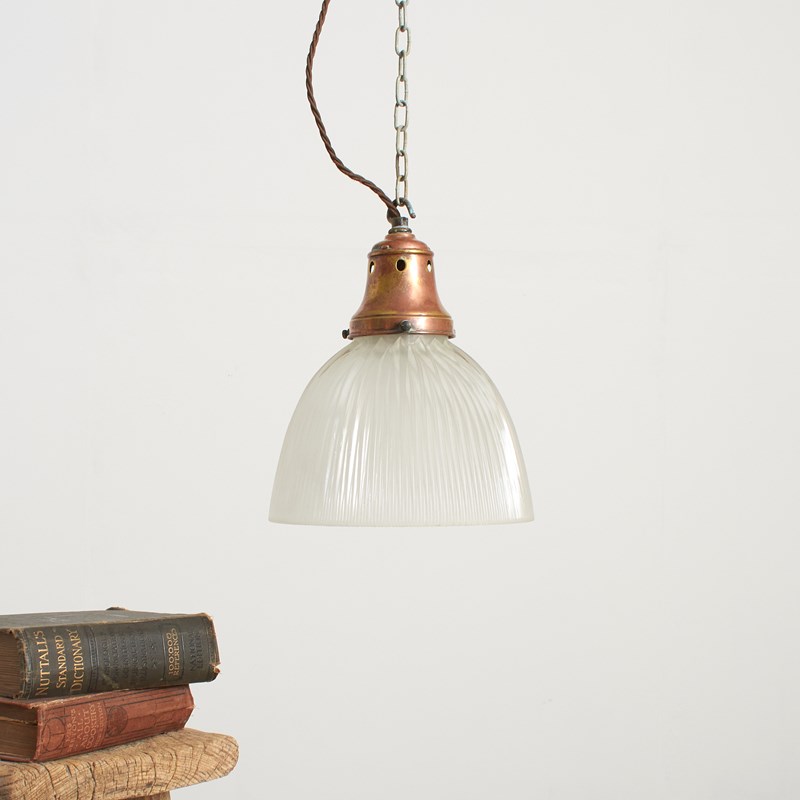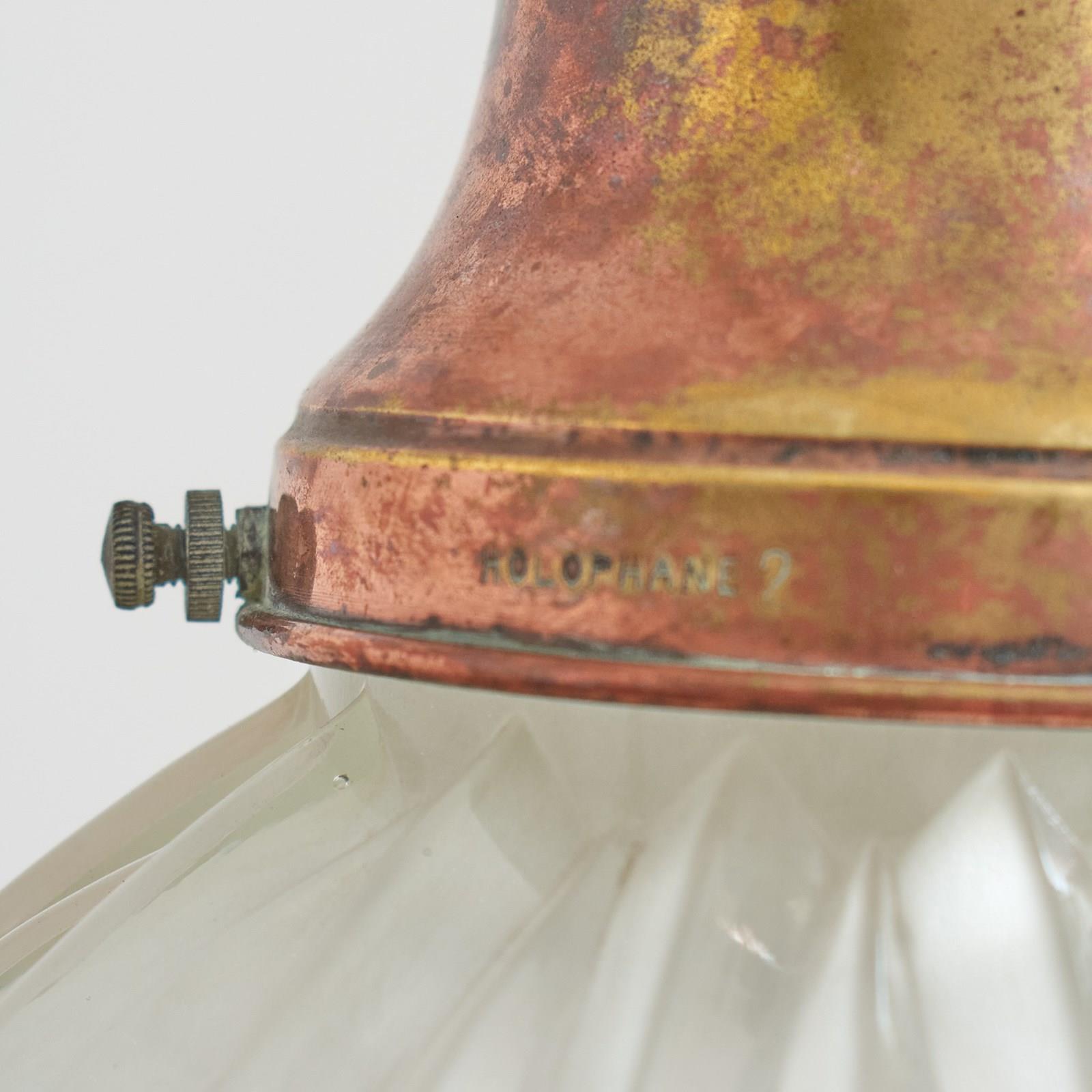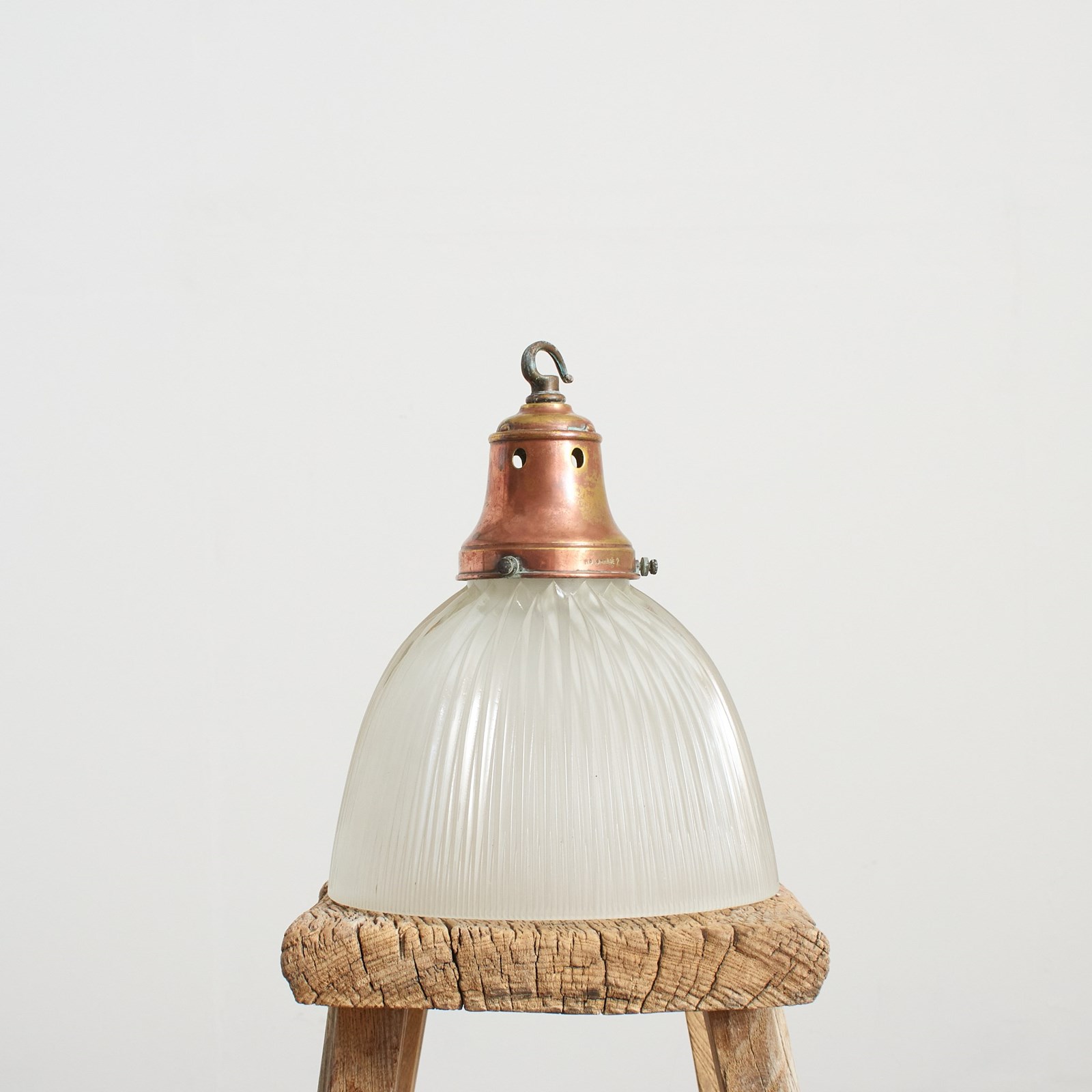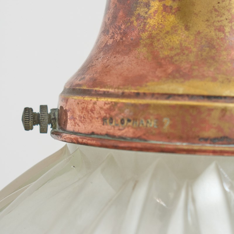 An original antique Holophane glass prismatic pendant light shade . The light has retained its original Holophane gallery left in its original aged copper / brass finish, stamped with the model number ‘Holophane 2’. The glass shade is stamped with the makers mark ‘Holophane” and was a typical bell shaped pendant light with a straight edge.