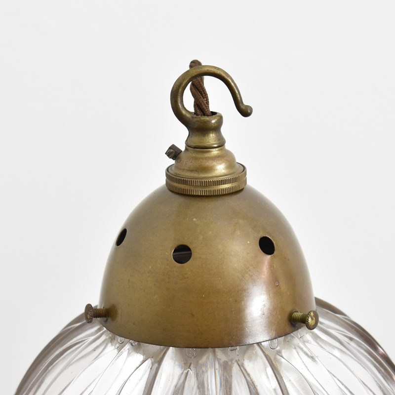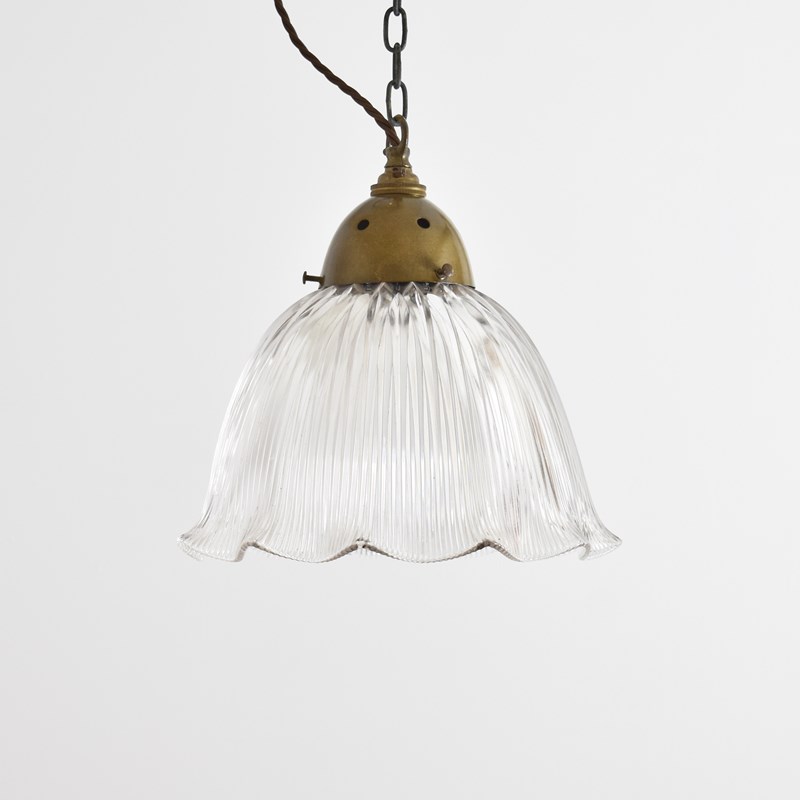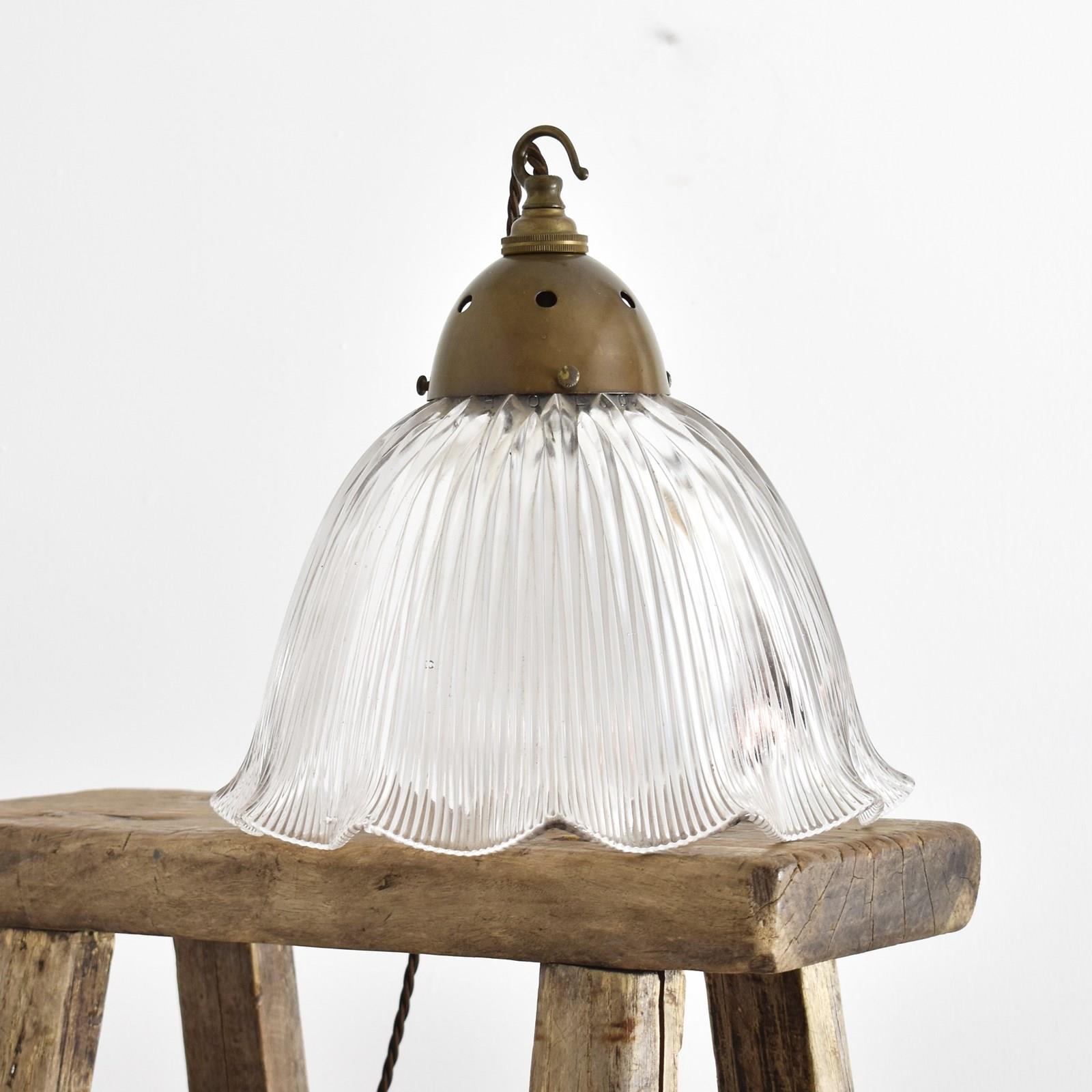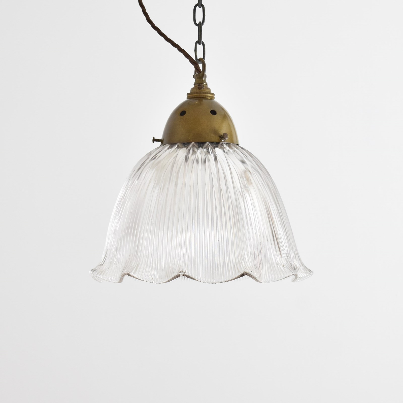 An antique Holophane glass prismatic pendant light shade which looks great both lit and unlit. The light has retained its original brass gallery, which has some great age and patina. The glass shade is stamped with the makers mark ‘Holophane” and was a typical bell shaped pendant light with the lovely frill detail to the edges..
