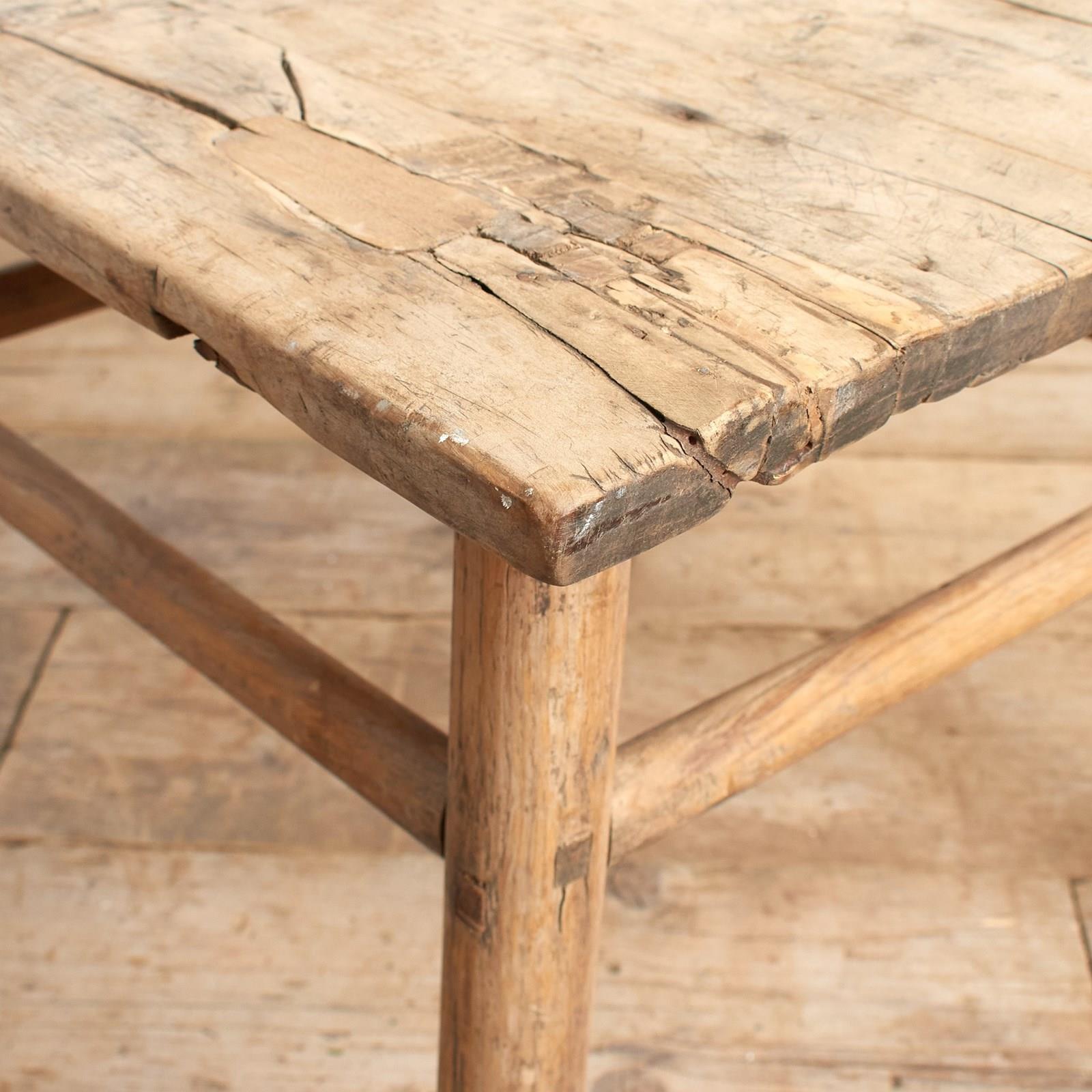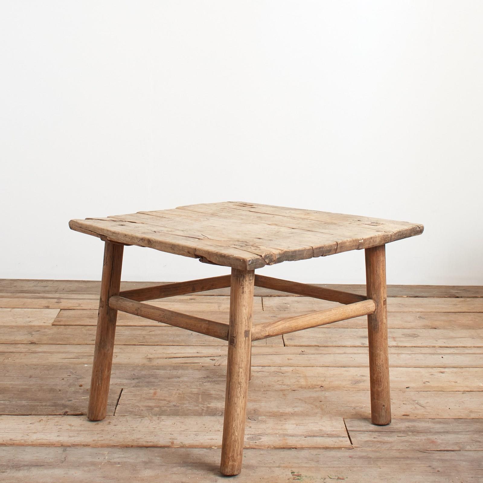 A beautiful square wooden elm lamp table. The top is wooden planks, the legs are rounded in shape. Lovely original patina and character. Traditional construction joints the table is constructed from elm over 100 years old.