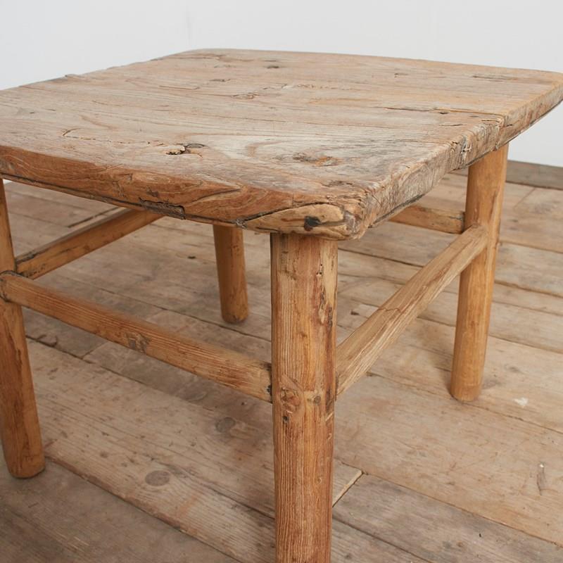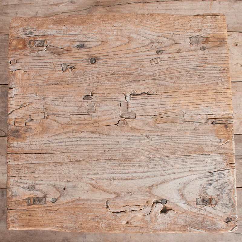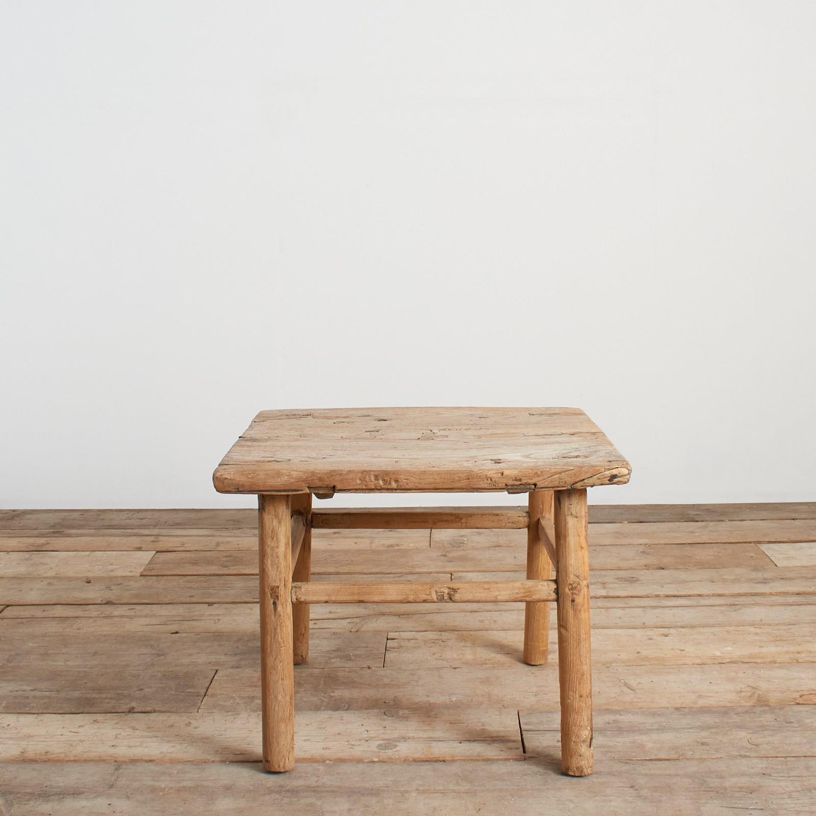 A beautiful square wooden elm lamp table with a wooden plank top and rounded legs. Full of age related markings retaining plenty of original patina and character. The table has traditional construction joints on the 100 year old elm.