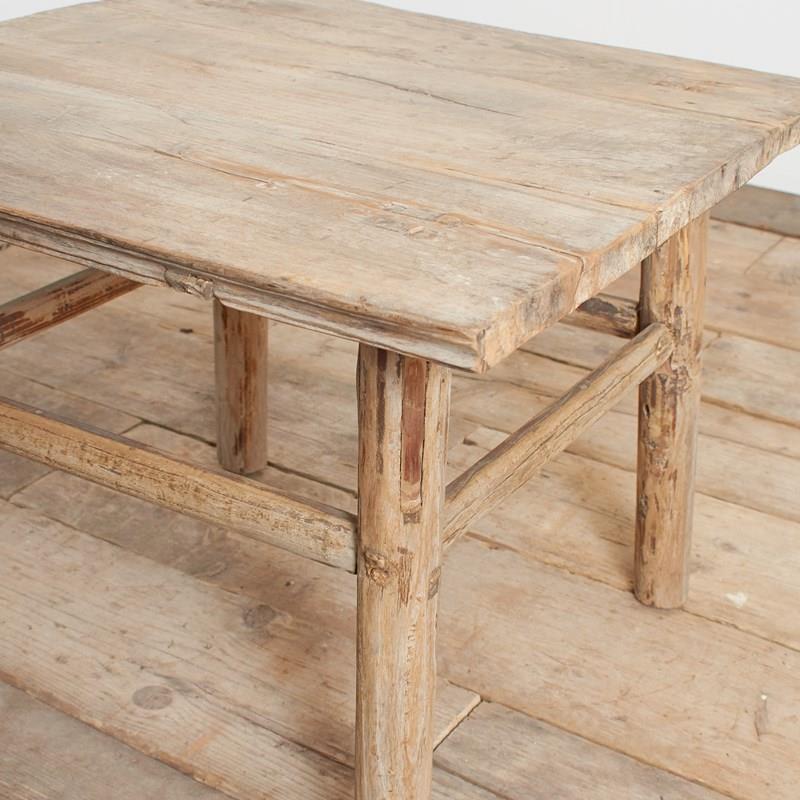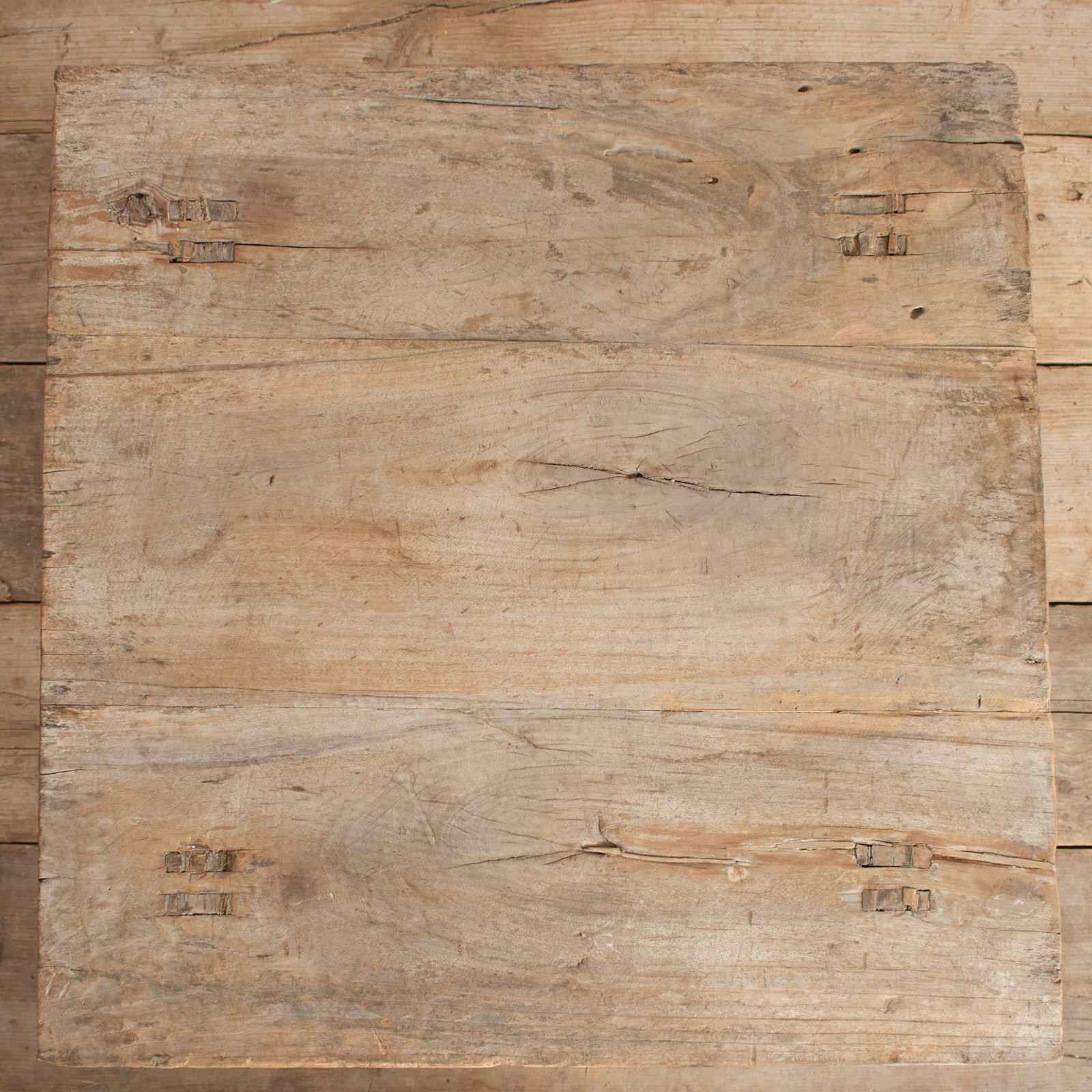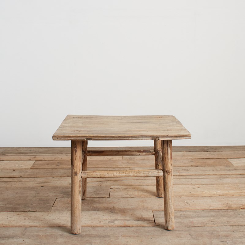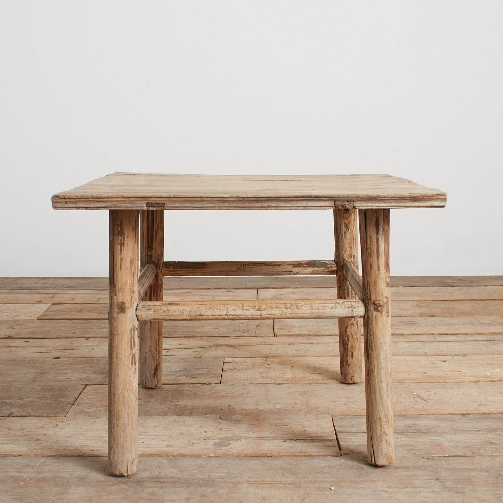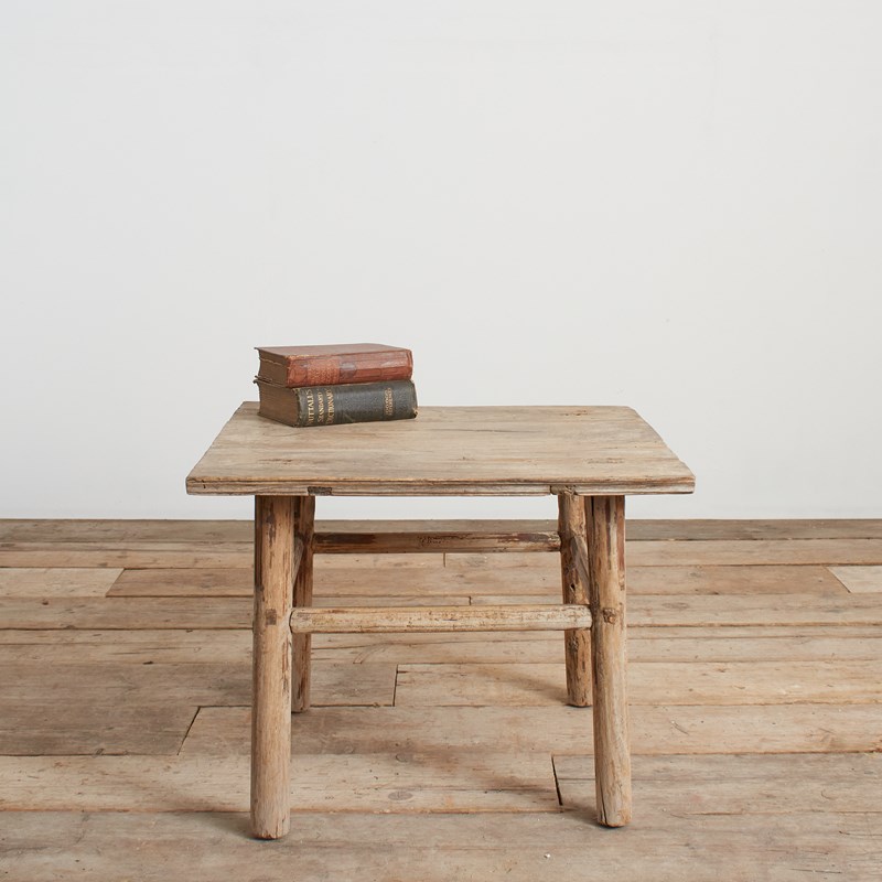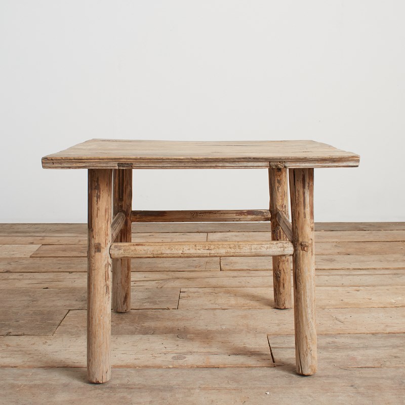 A beautiful square wooden elm lamp table with a wooden plank top and rounded legs. Full of age related markings retaining plenty of original patina and character. The table has traditional construction joints on the 100 year old elm.