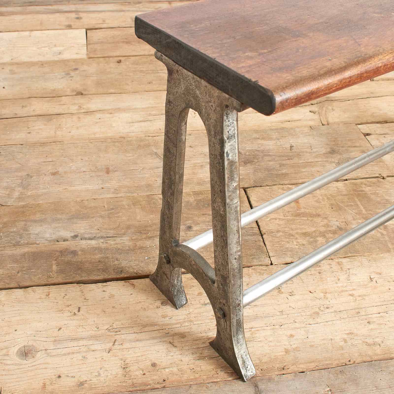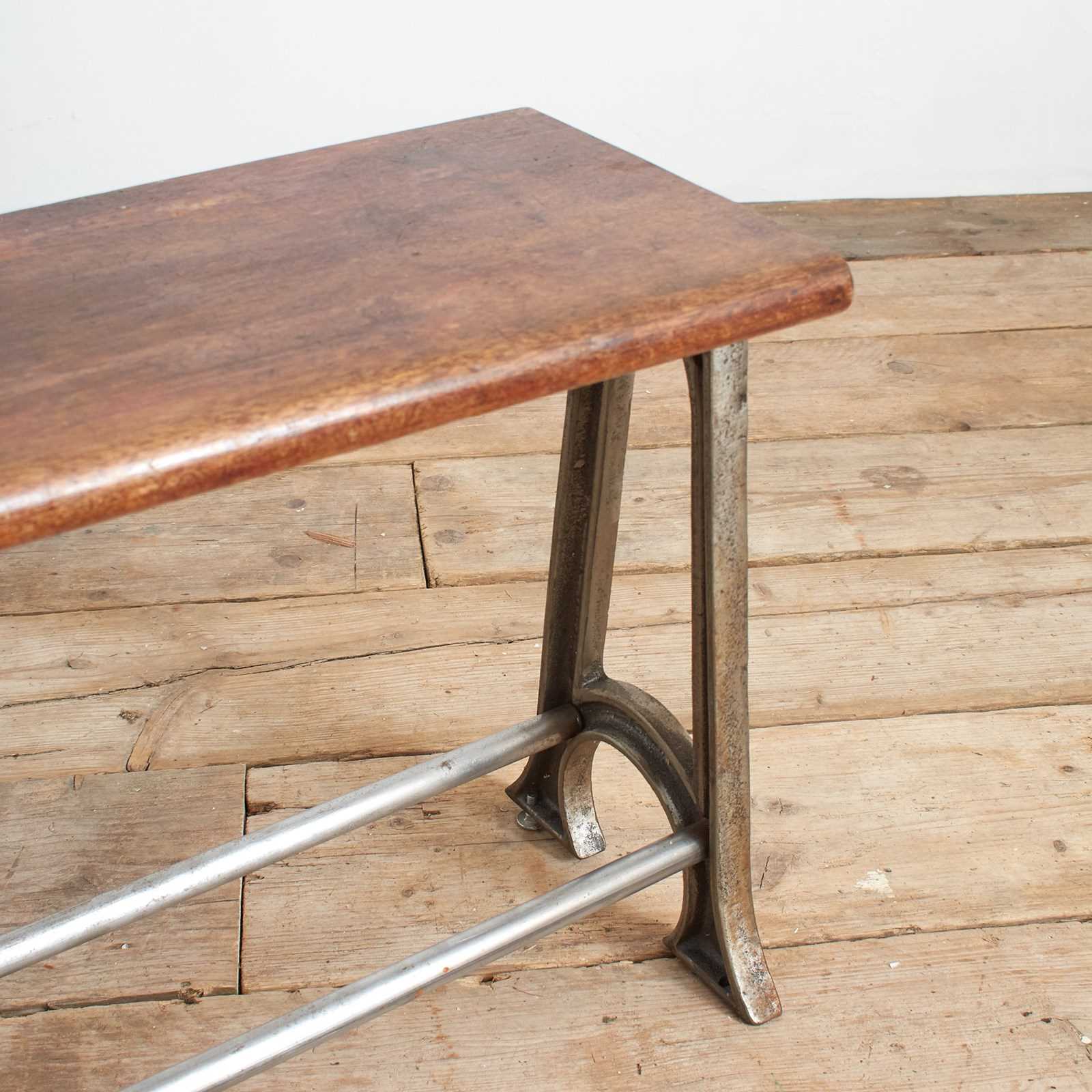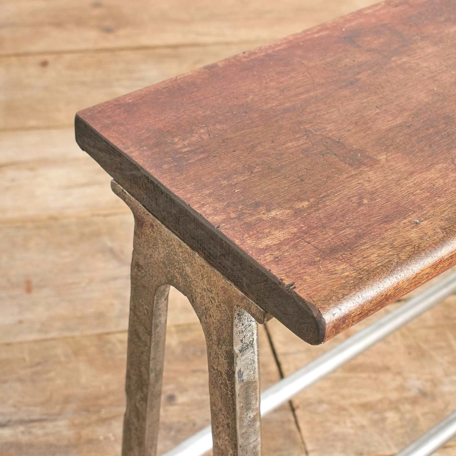 A School Locker Room Bench, with a lovely original hardwood wooden top salvaged from a Grammar school. The bench has cast metal legs and a pair of metal stretcher rods serving as a lower shelf.