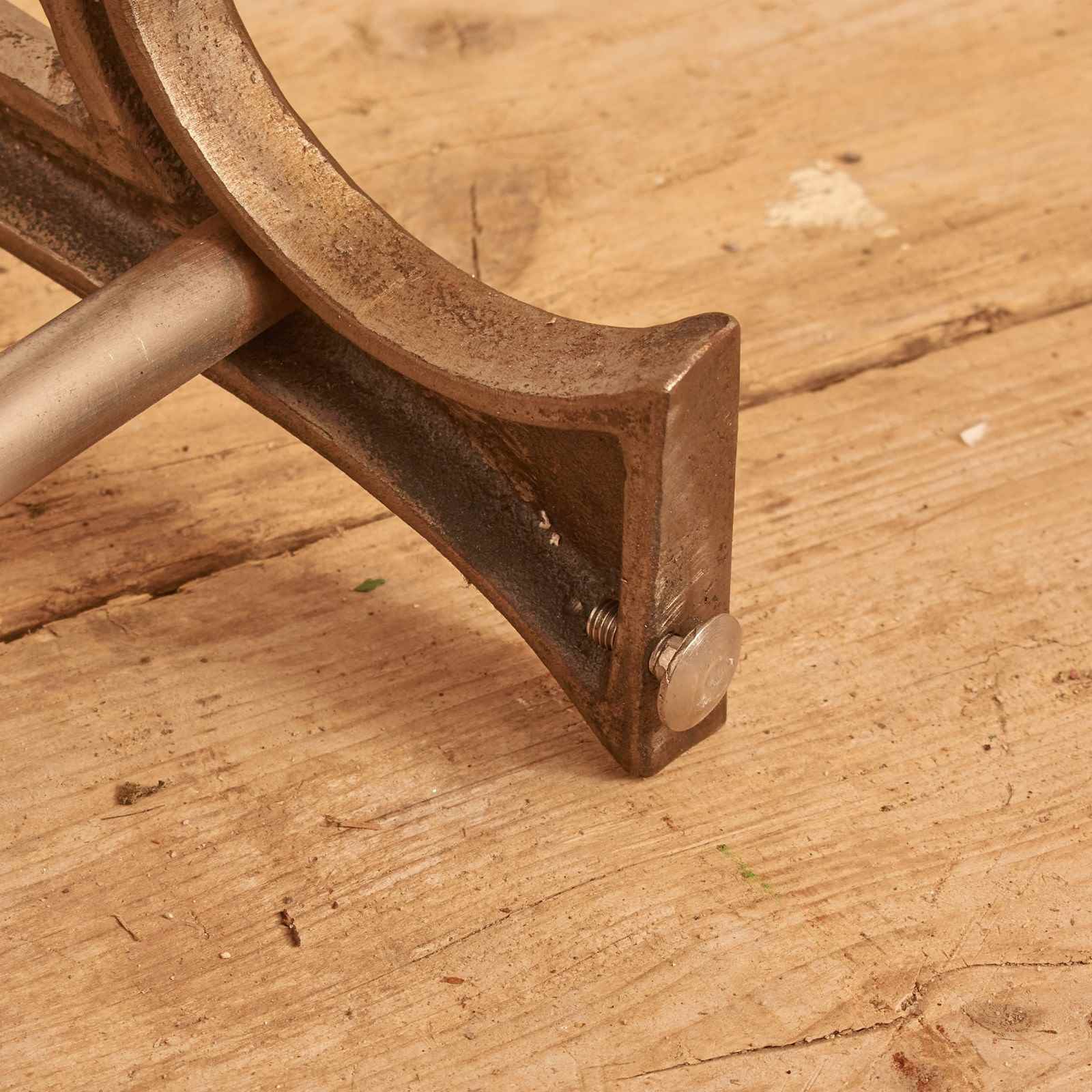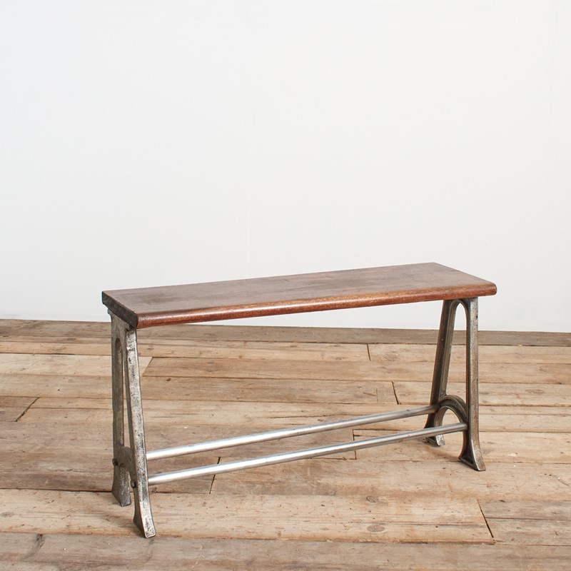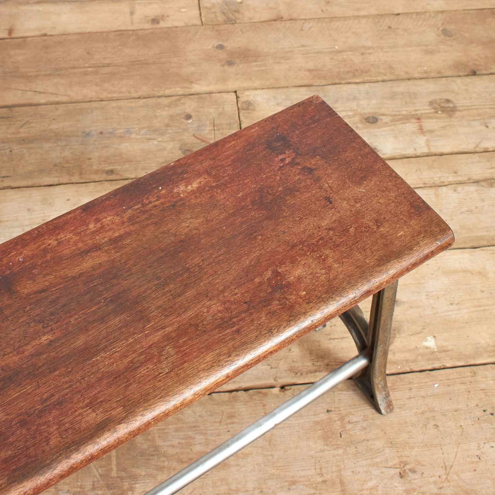 A School Locker Room Bench, with a lovely original hardwood wooden top salvaged from a Grammar school. The bench has cast metal legs and a pair of metal stretcher rods serving as a lower shelf.