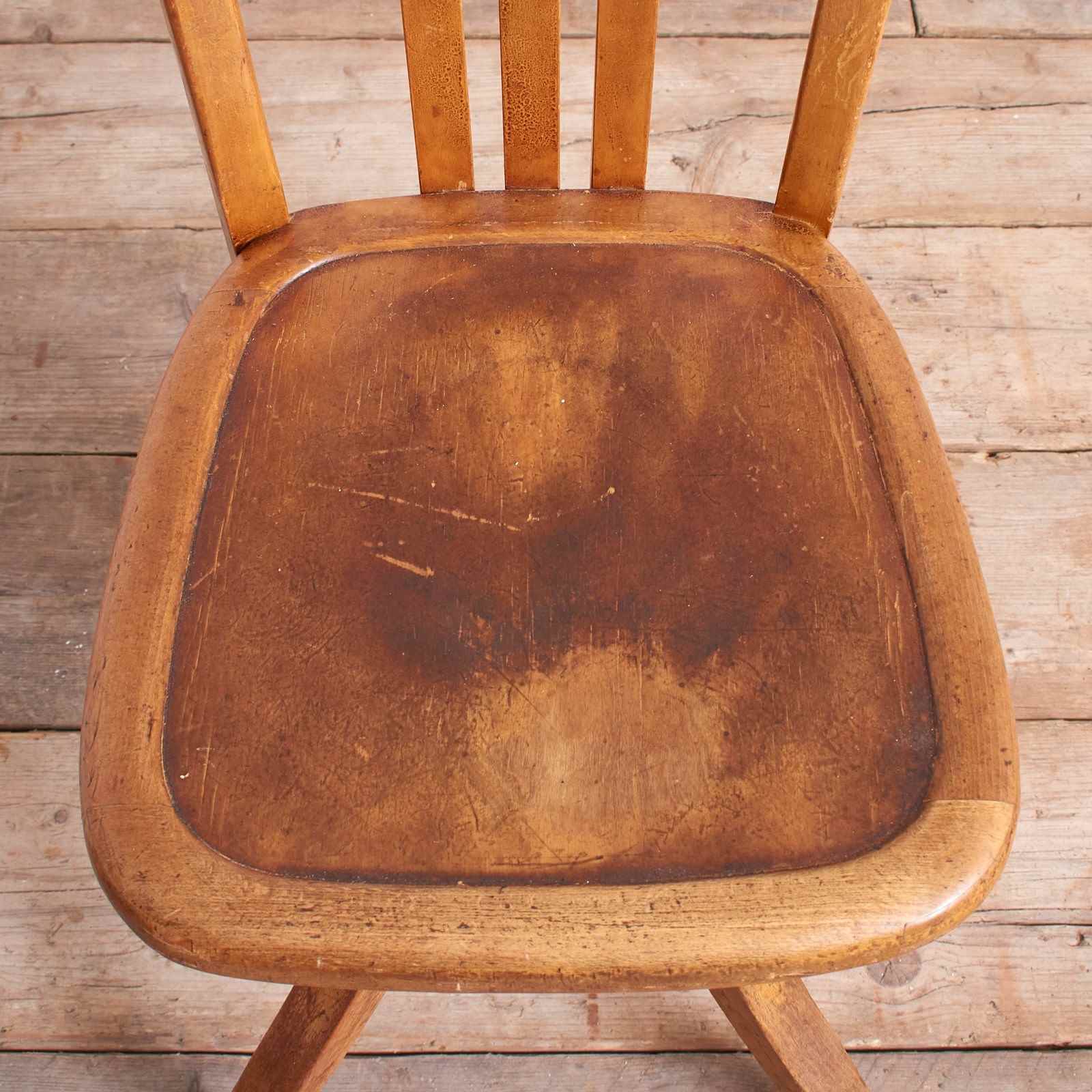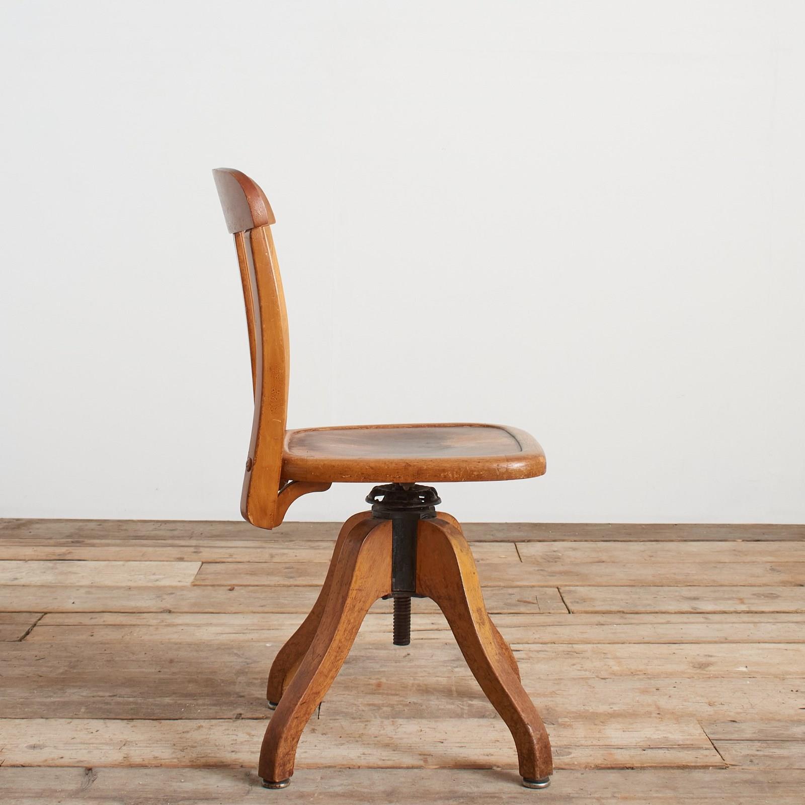 This chair is one of the companies later designs. It is constructed from beech with a cast metal height adjuster. The original wear marks have been left on the seat.